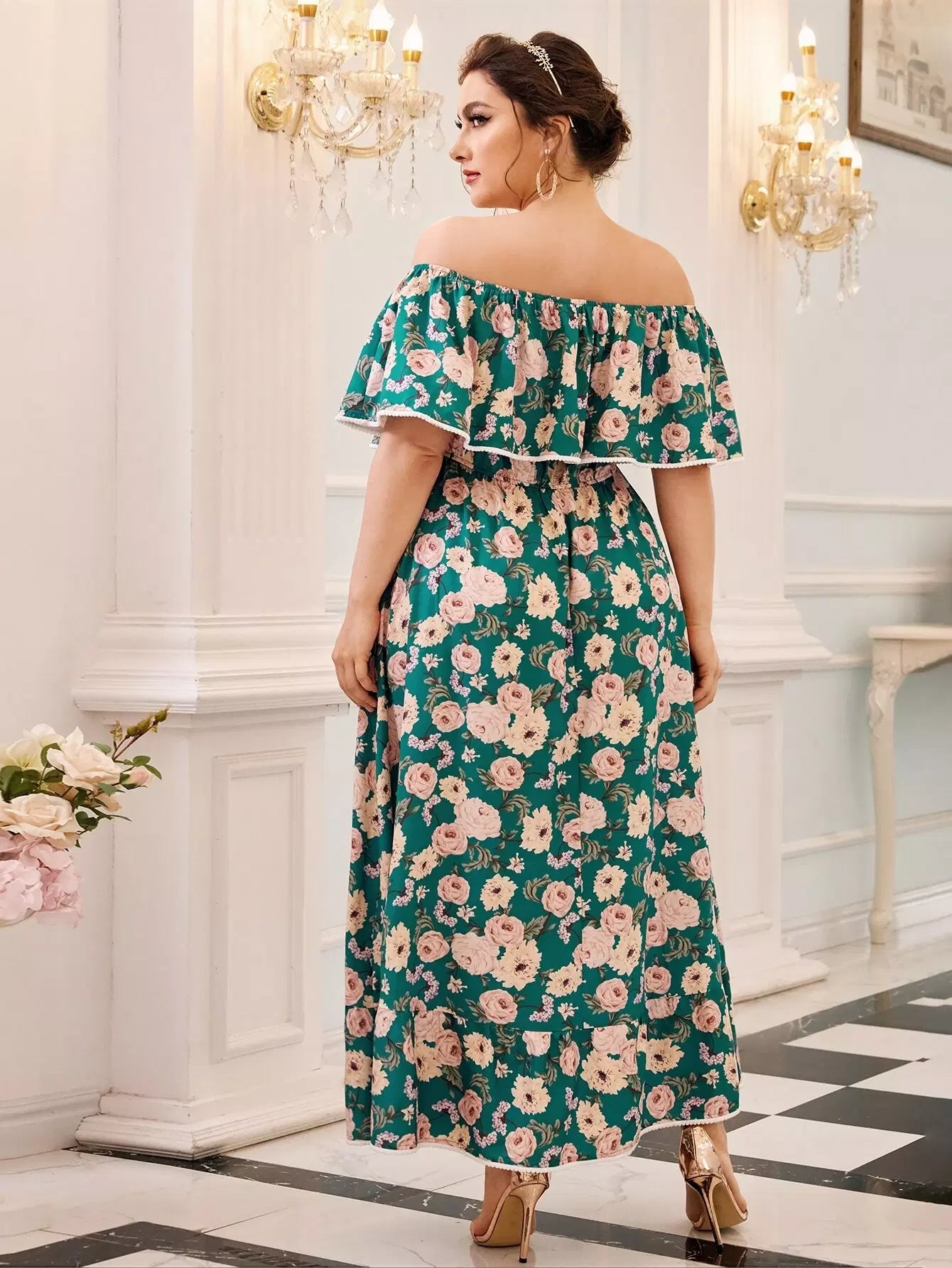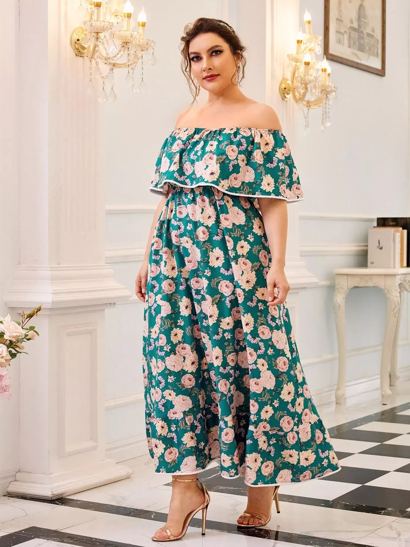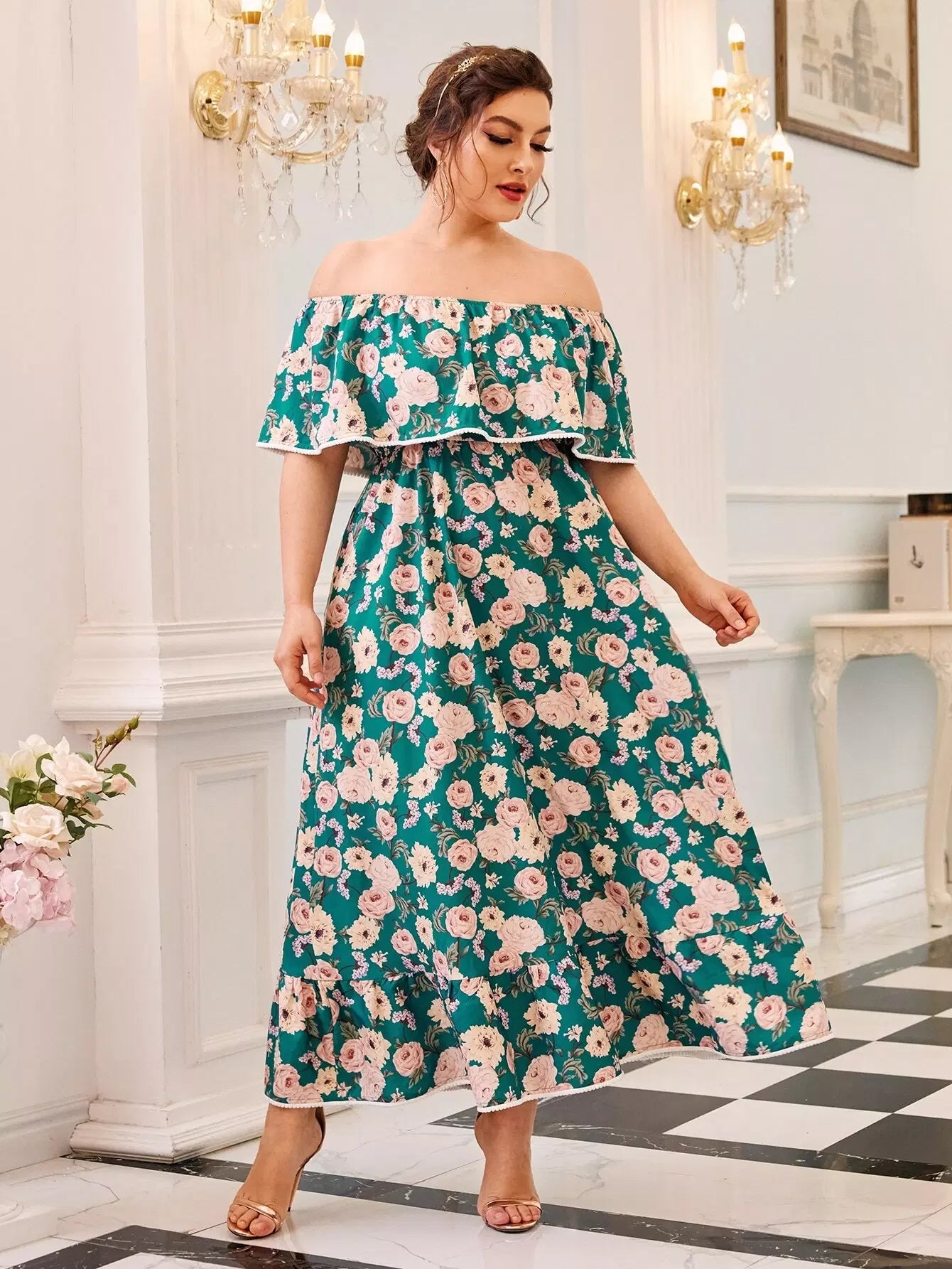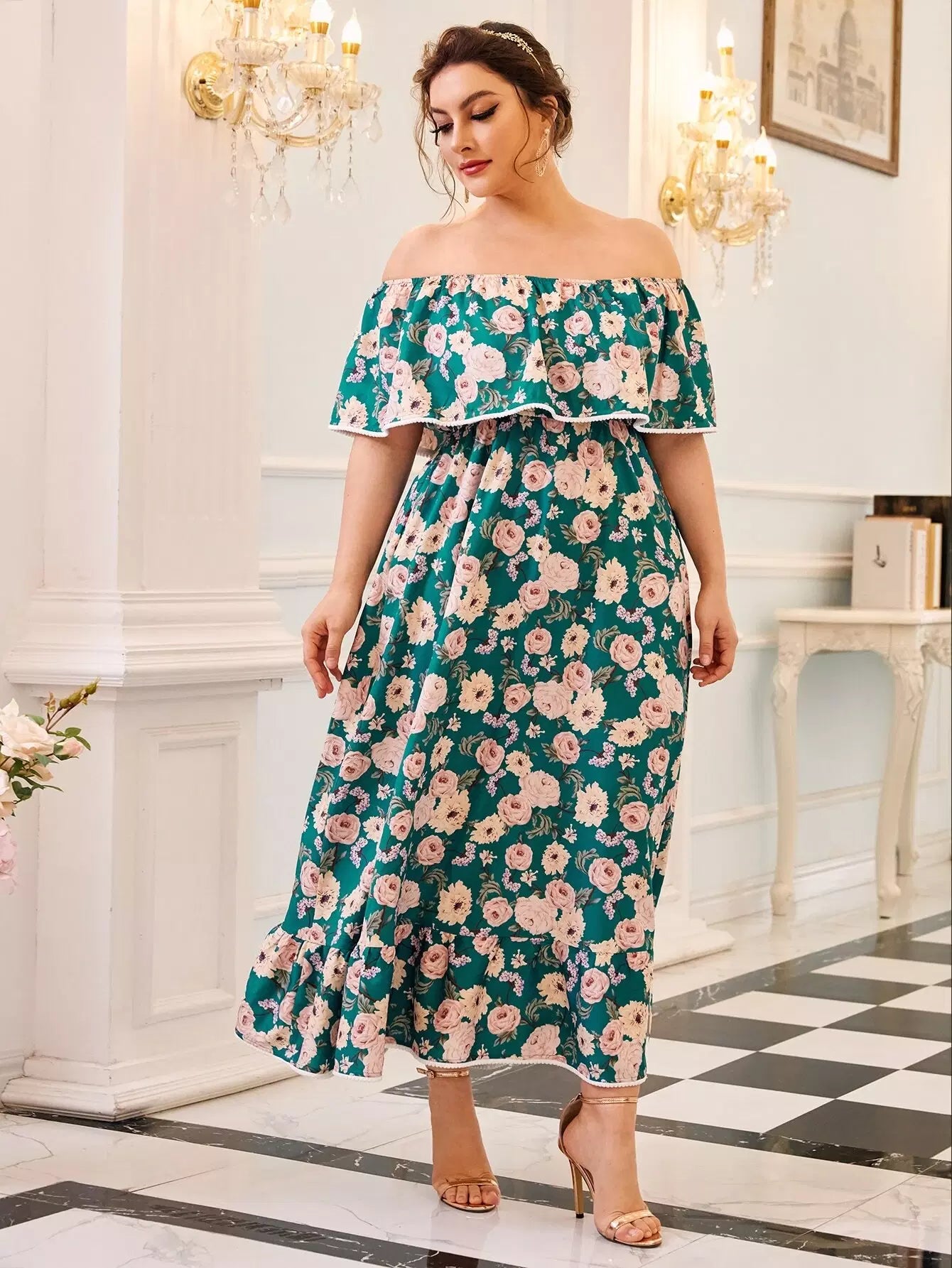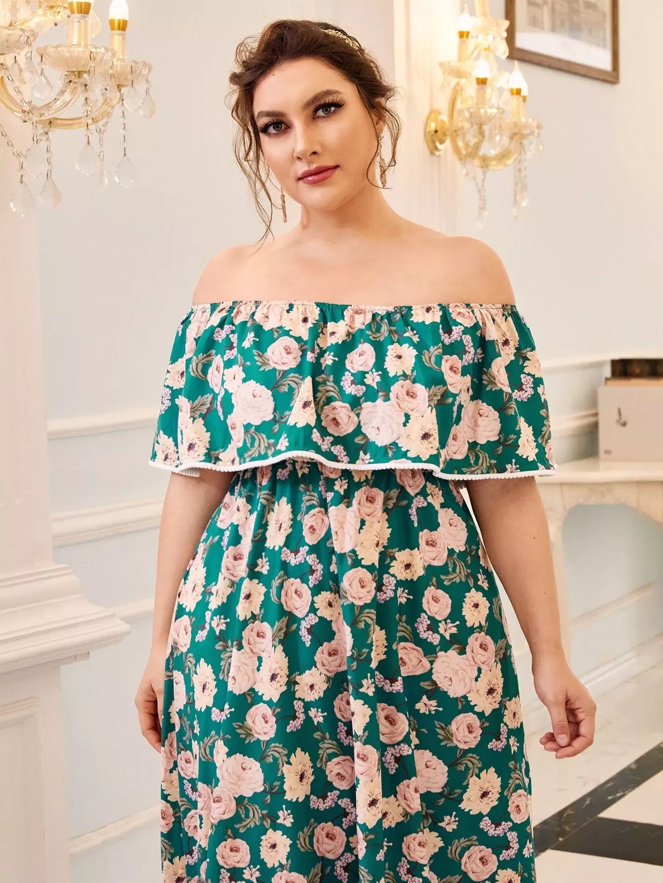 Plus Off Shoulder Foldover Front Floral Print Dress