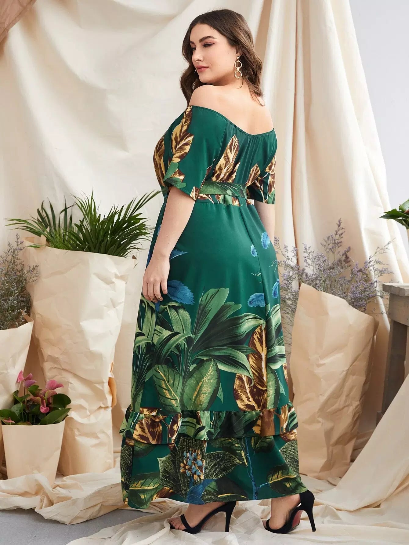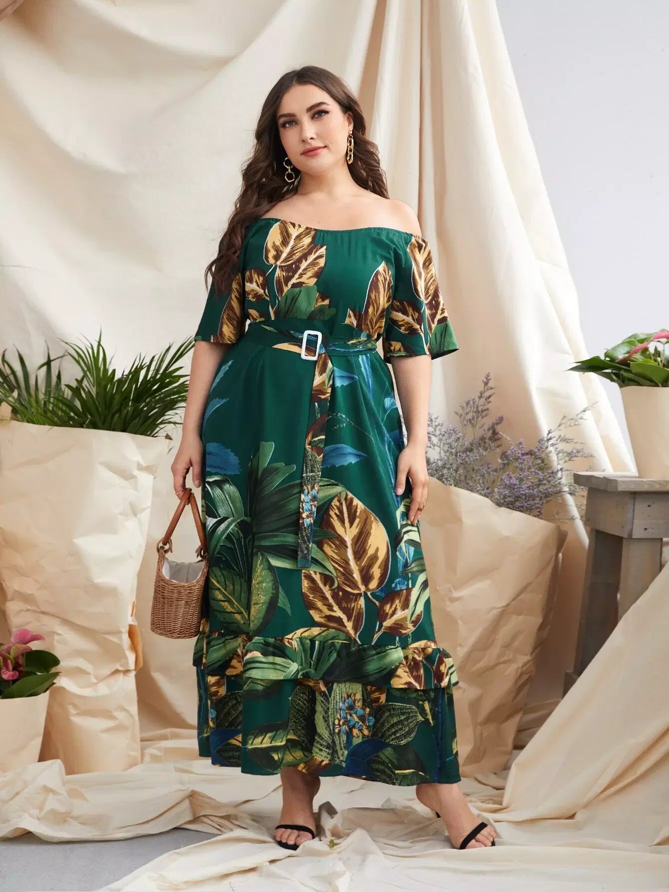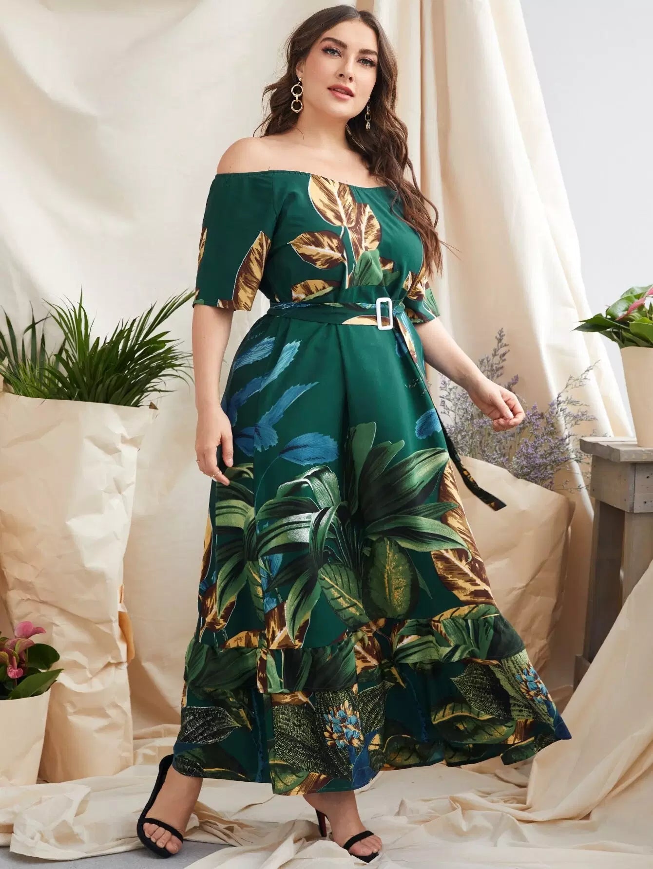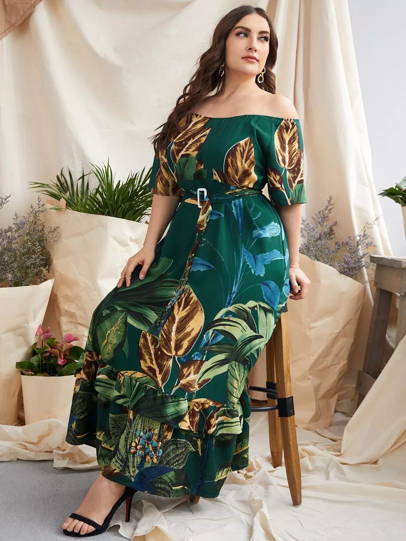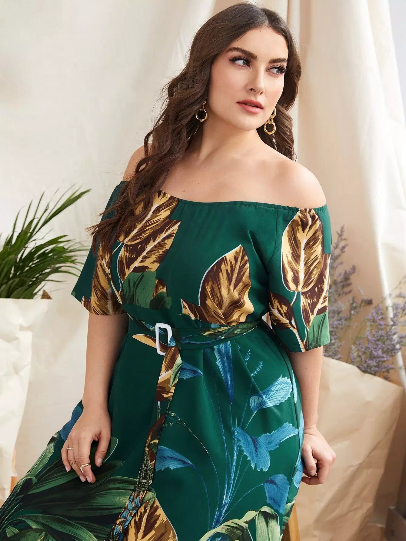 Plus Off Shoulder Leaves Print Dress Without Belt