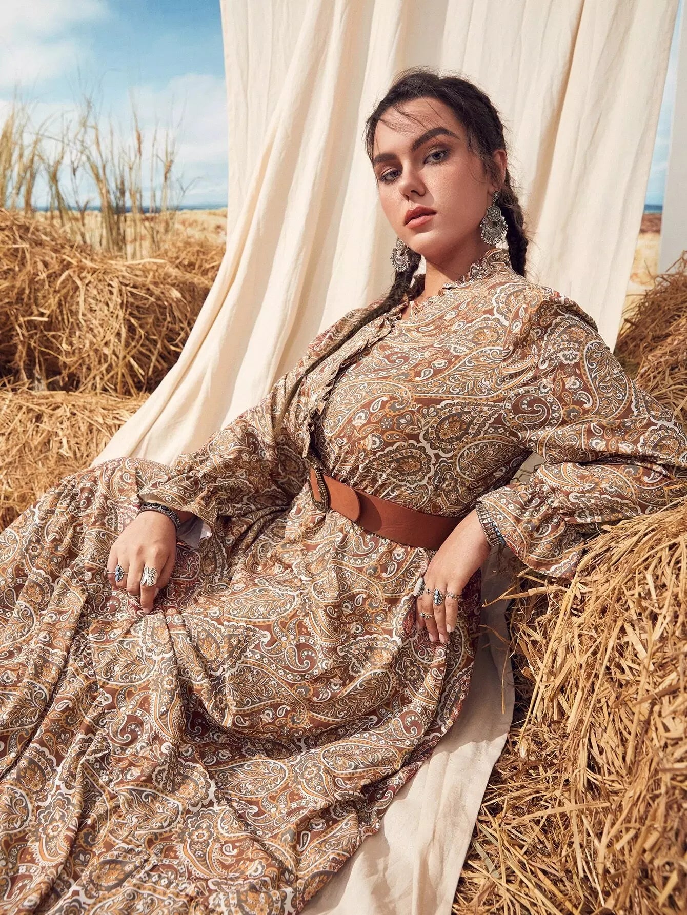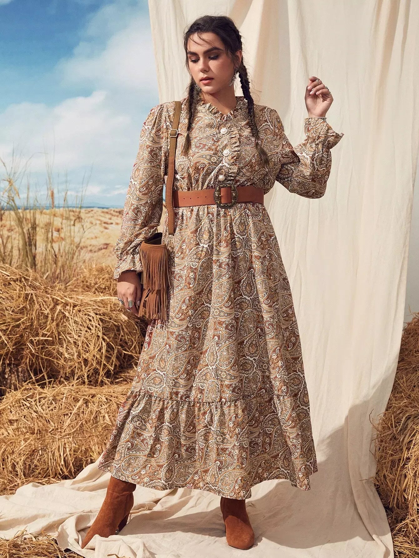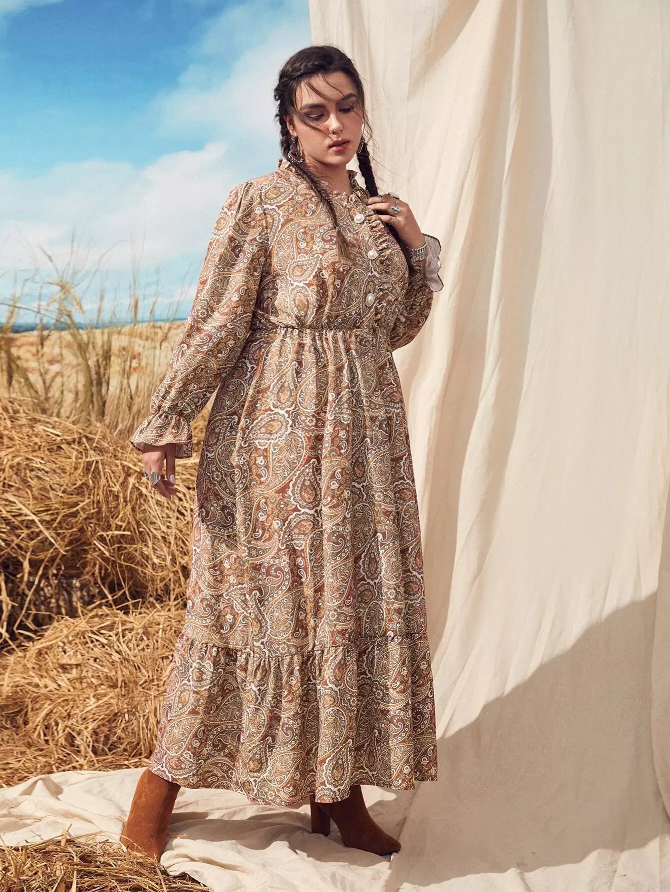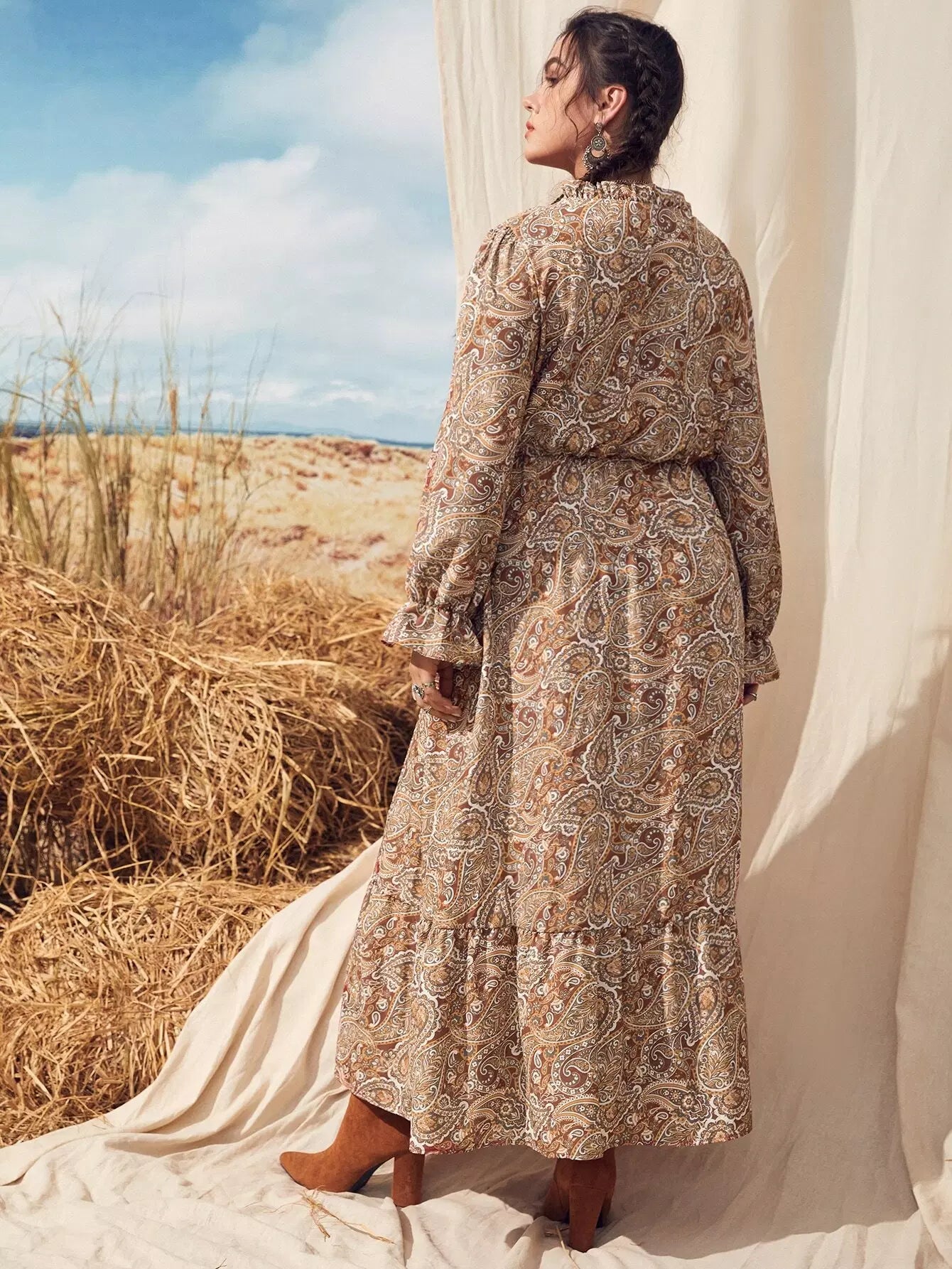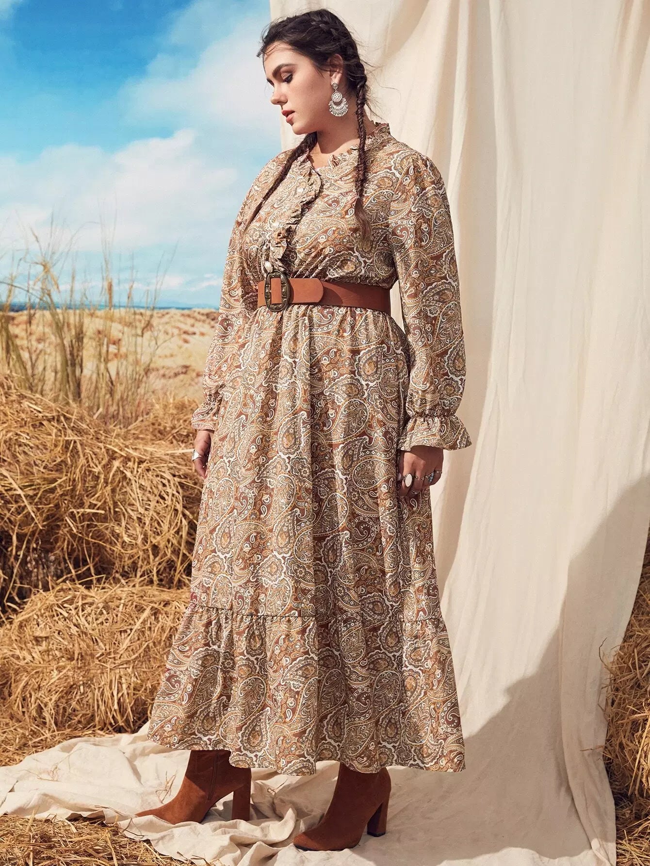 Plus Paisley Print Flounce Sleeve Ruffle Hem Dress Without Belt