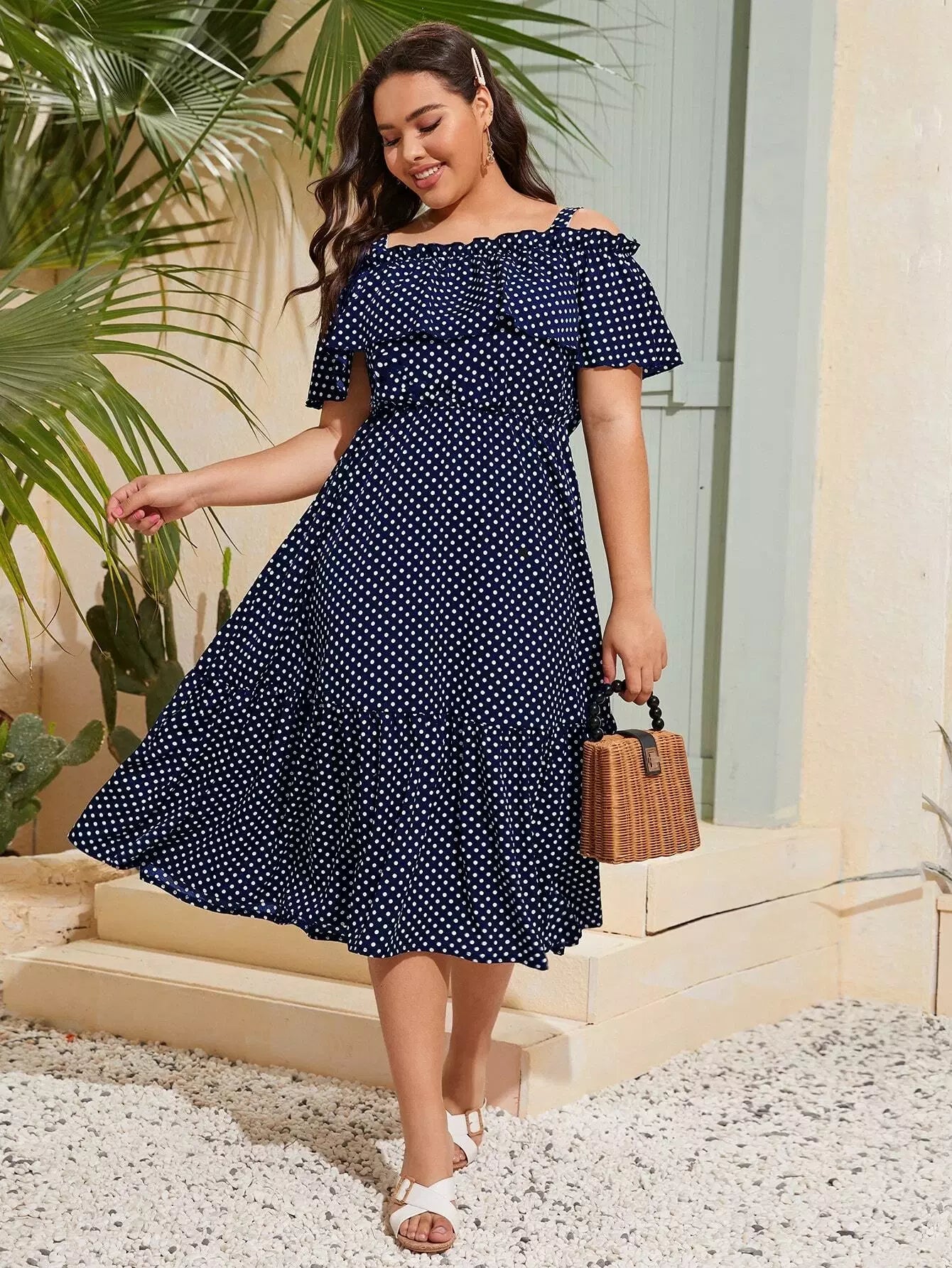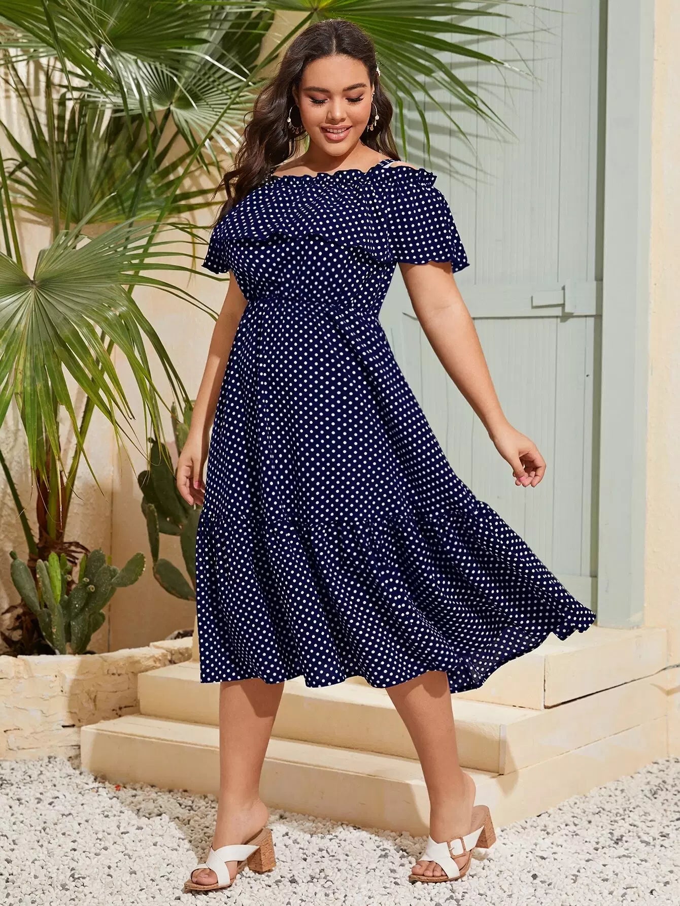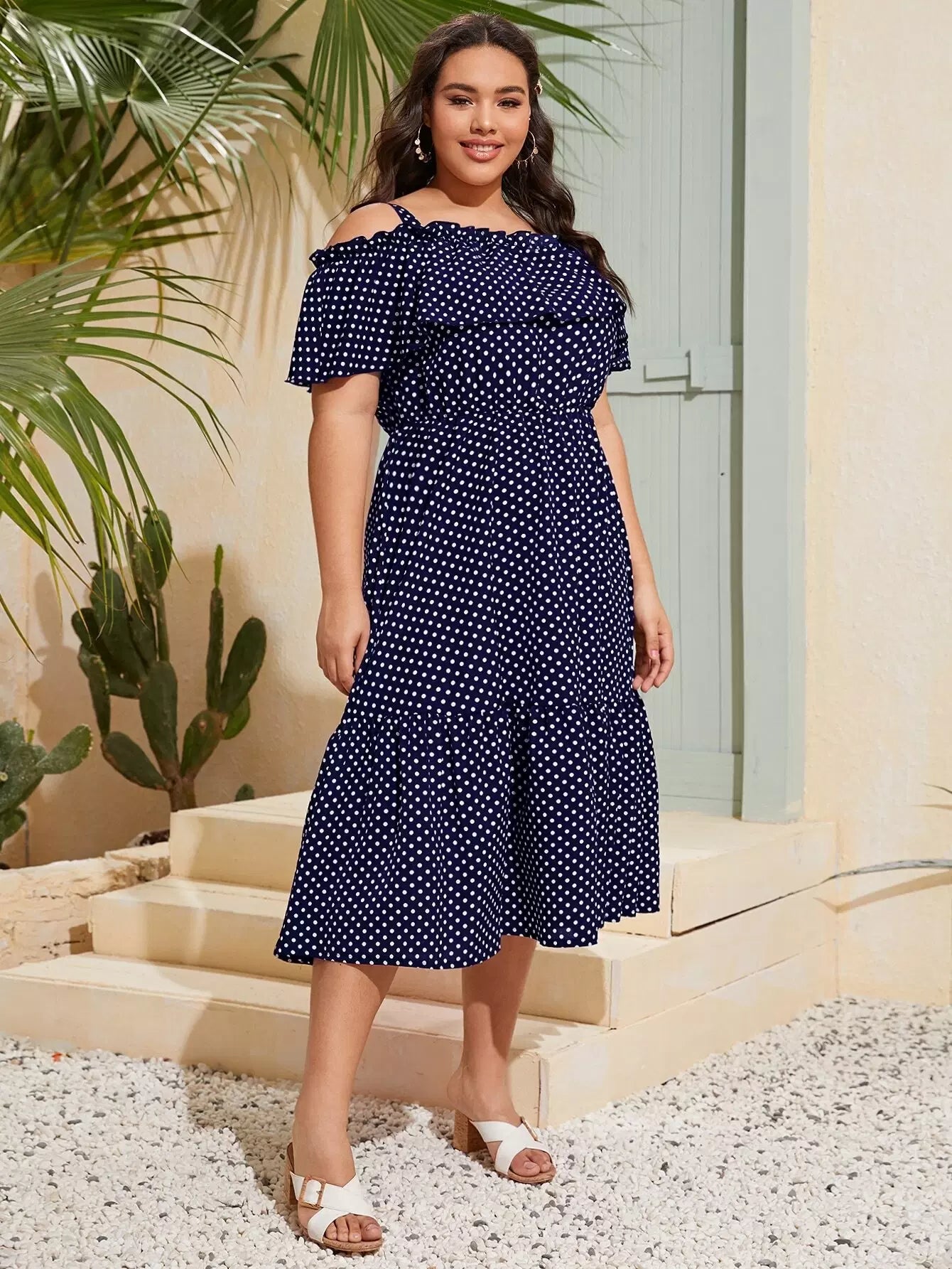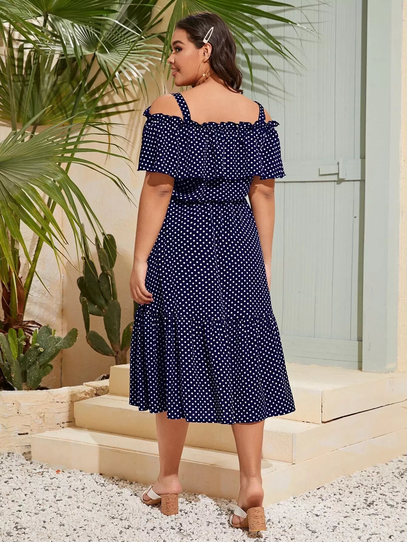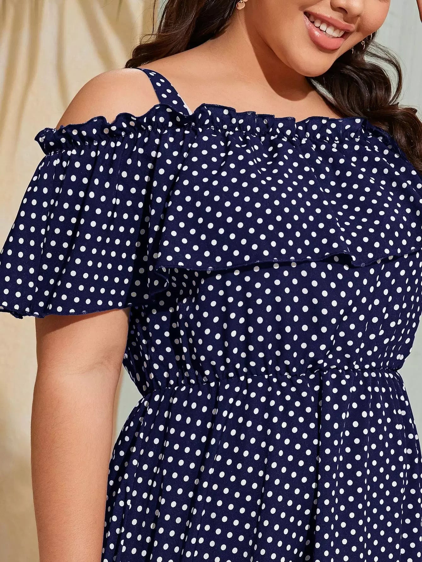 Plus Polka Dot Foldover Cold Shoulder Dress