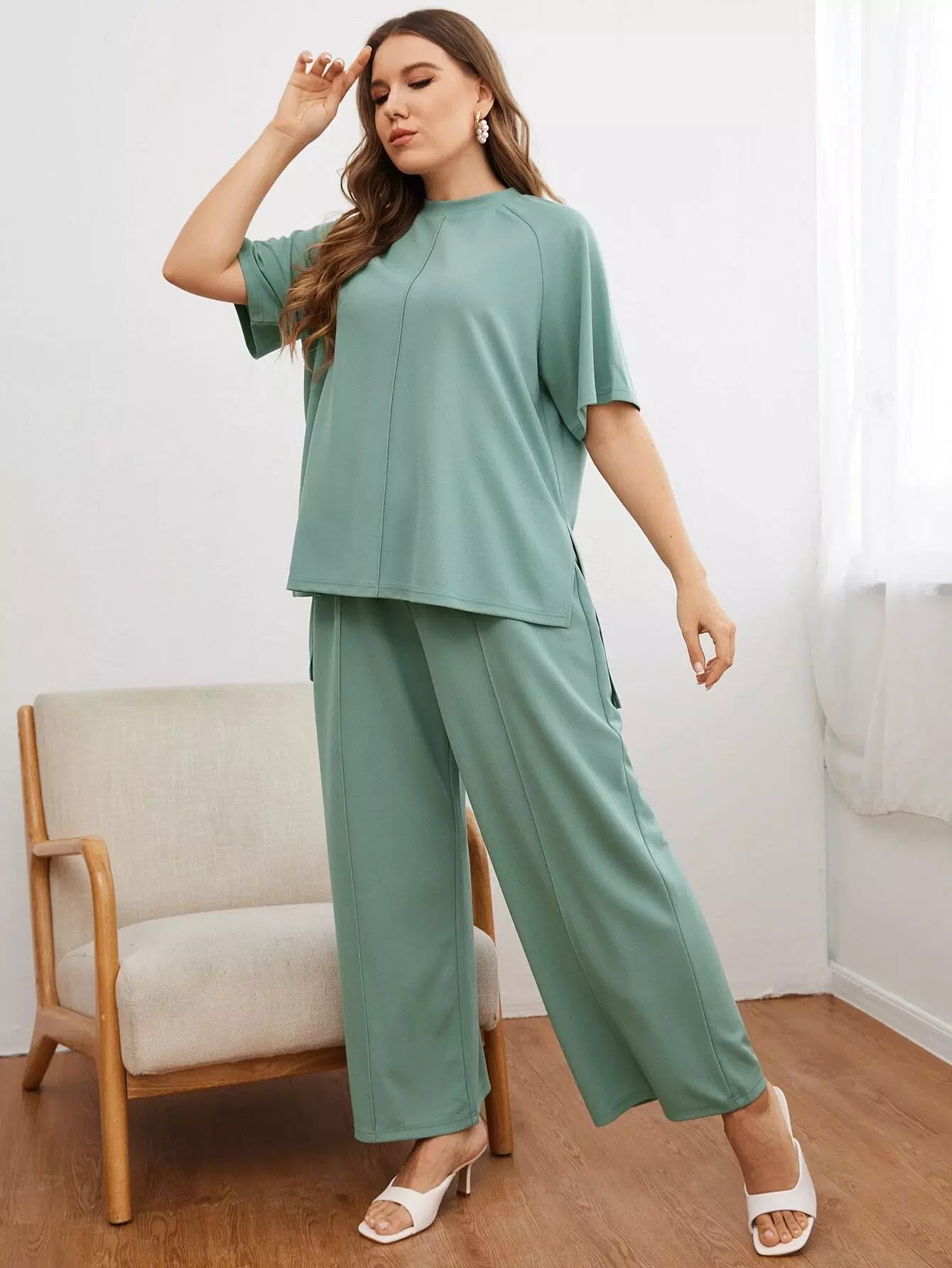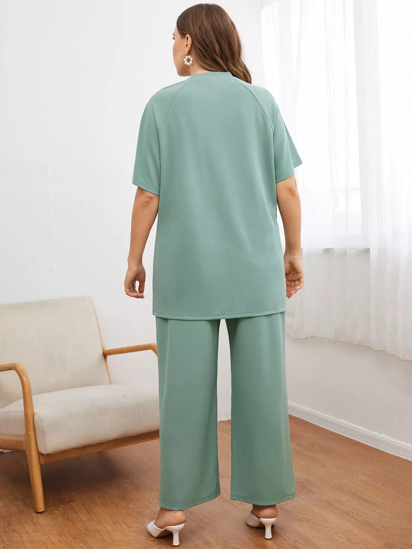 Plus Raglan Sleeve Split High-low Hem Solid Top & Palazzo Pants Set