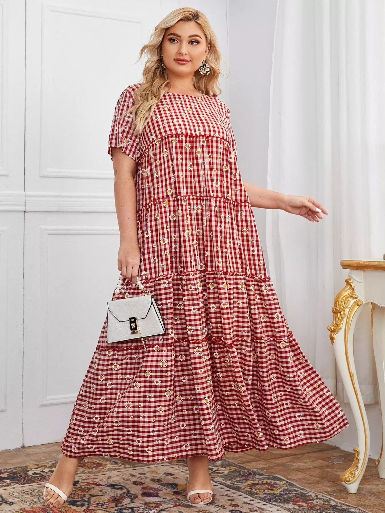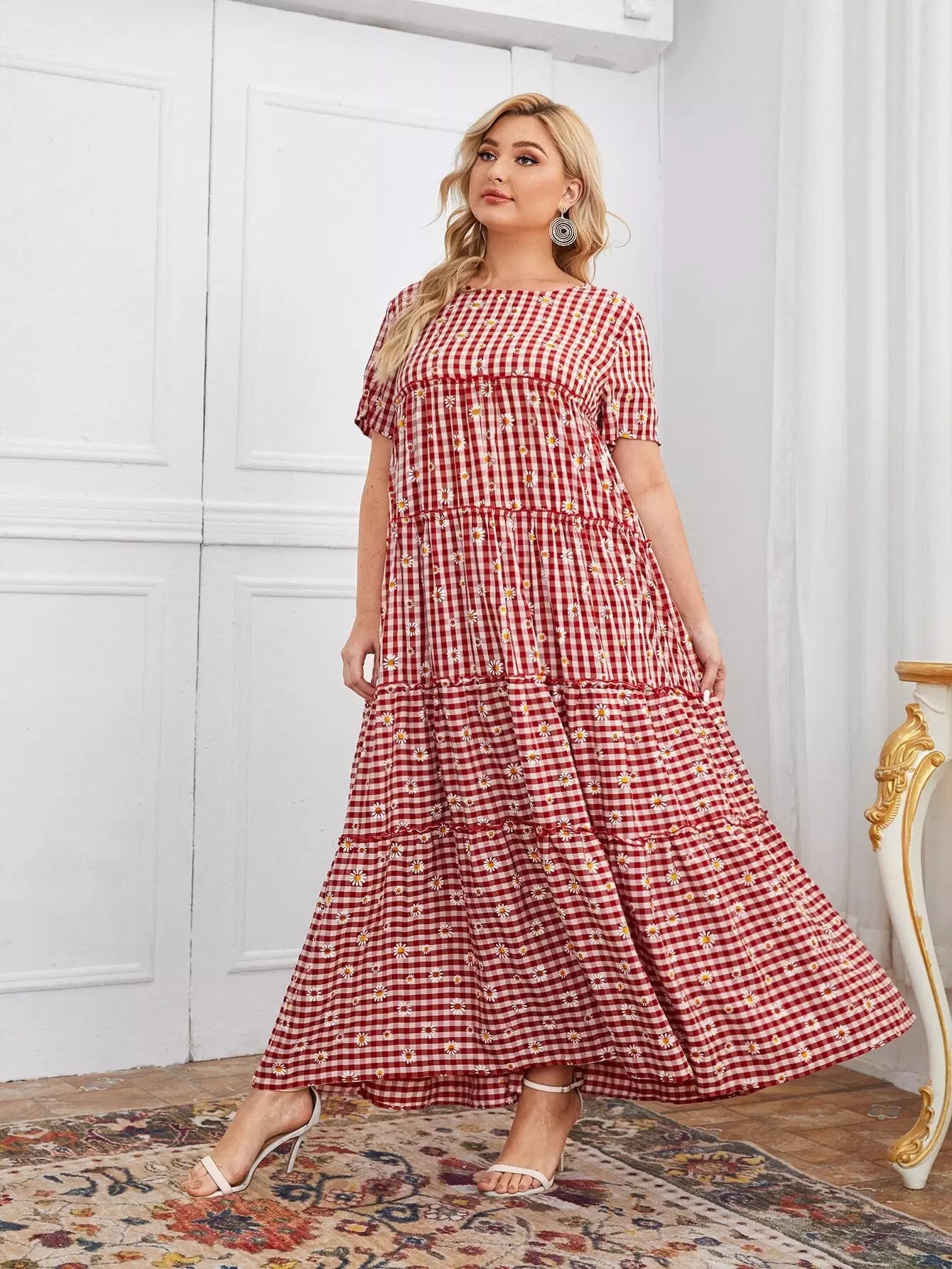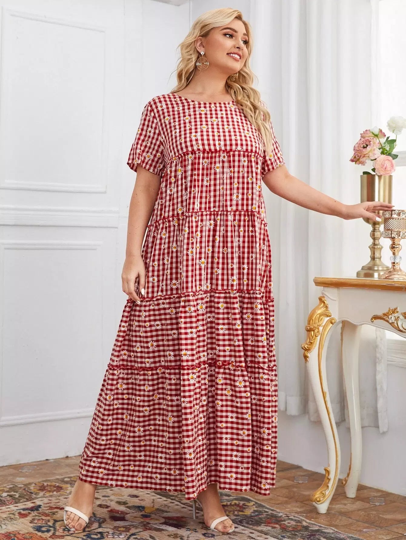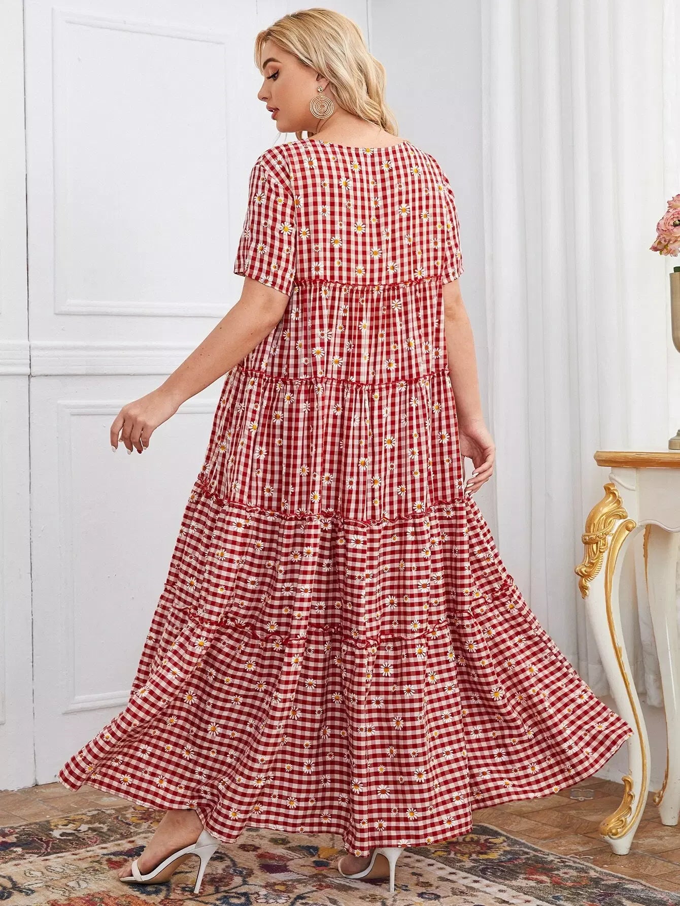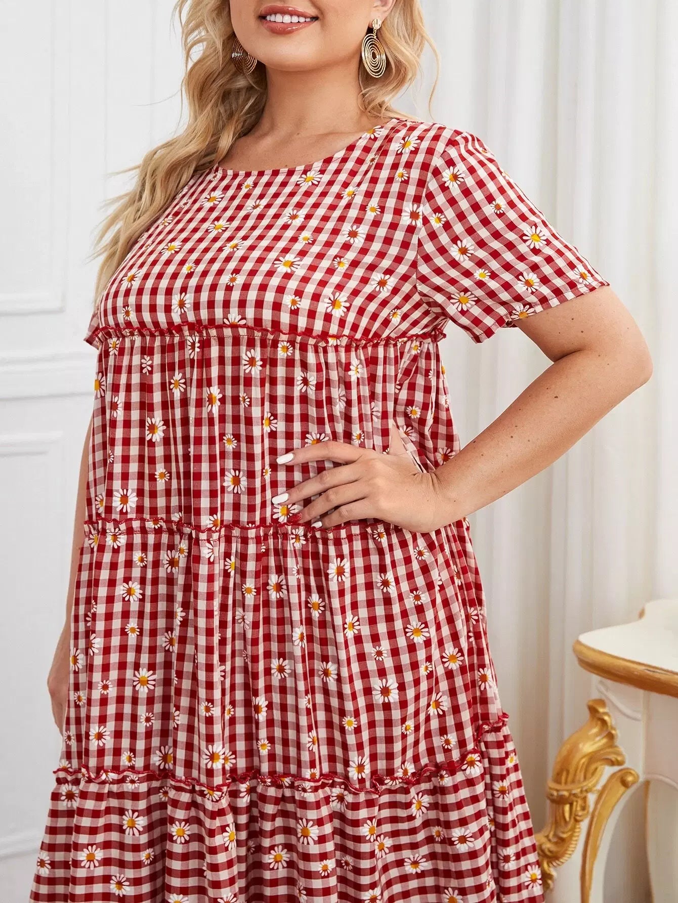 Plus Ruffle Hem Gingham & Daisy Floral Smock Dress