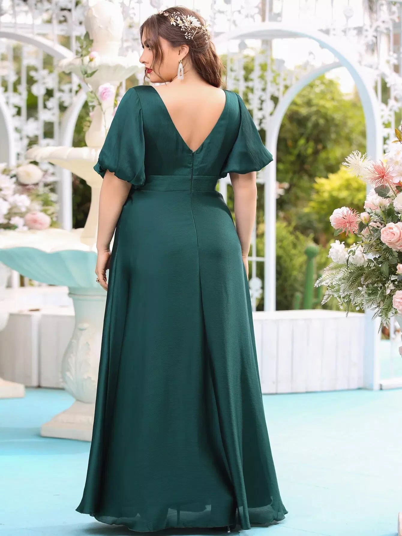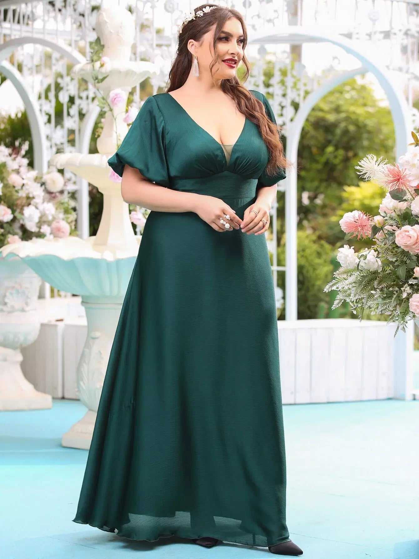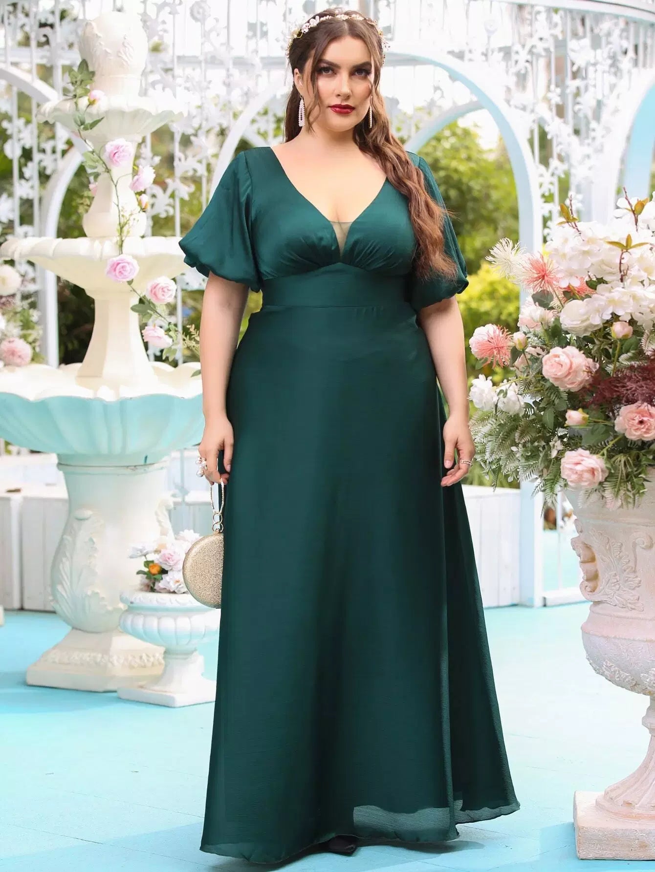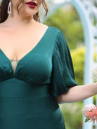 Plus Satin Plunging Neck Bishop Sleeve Dress