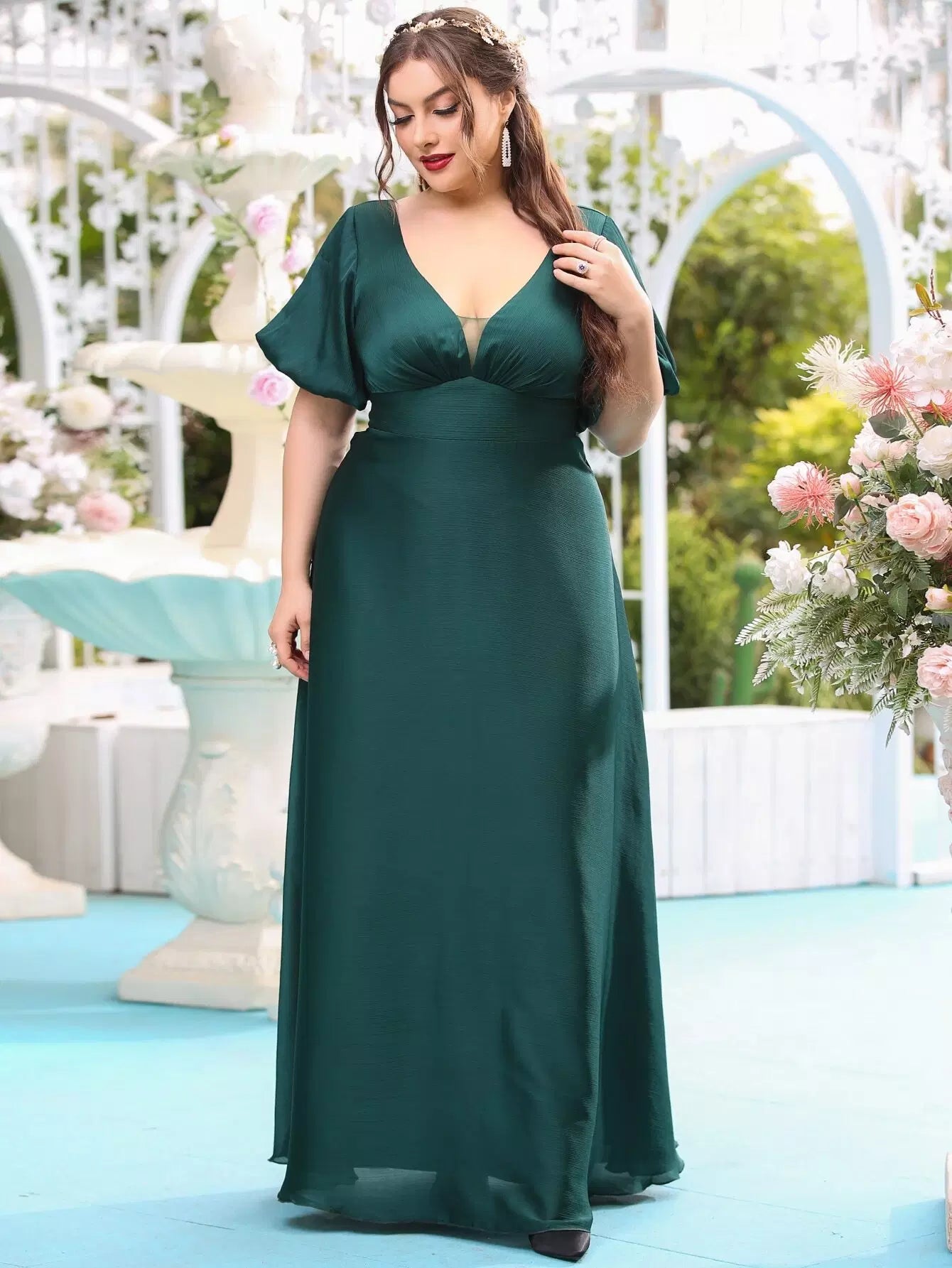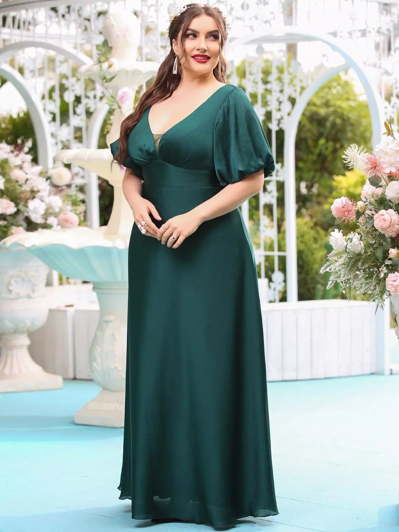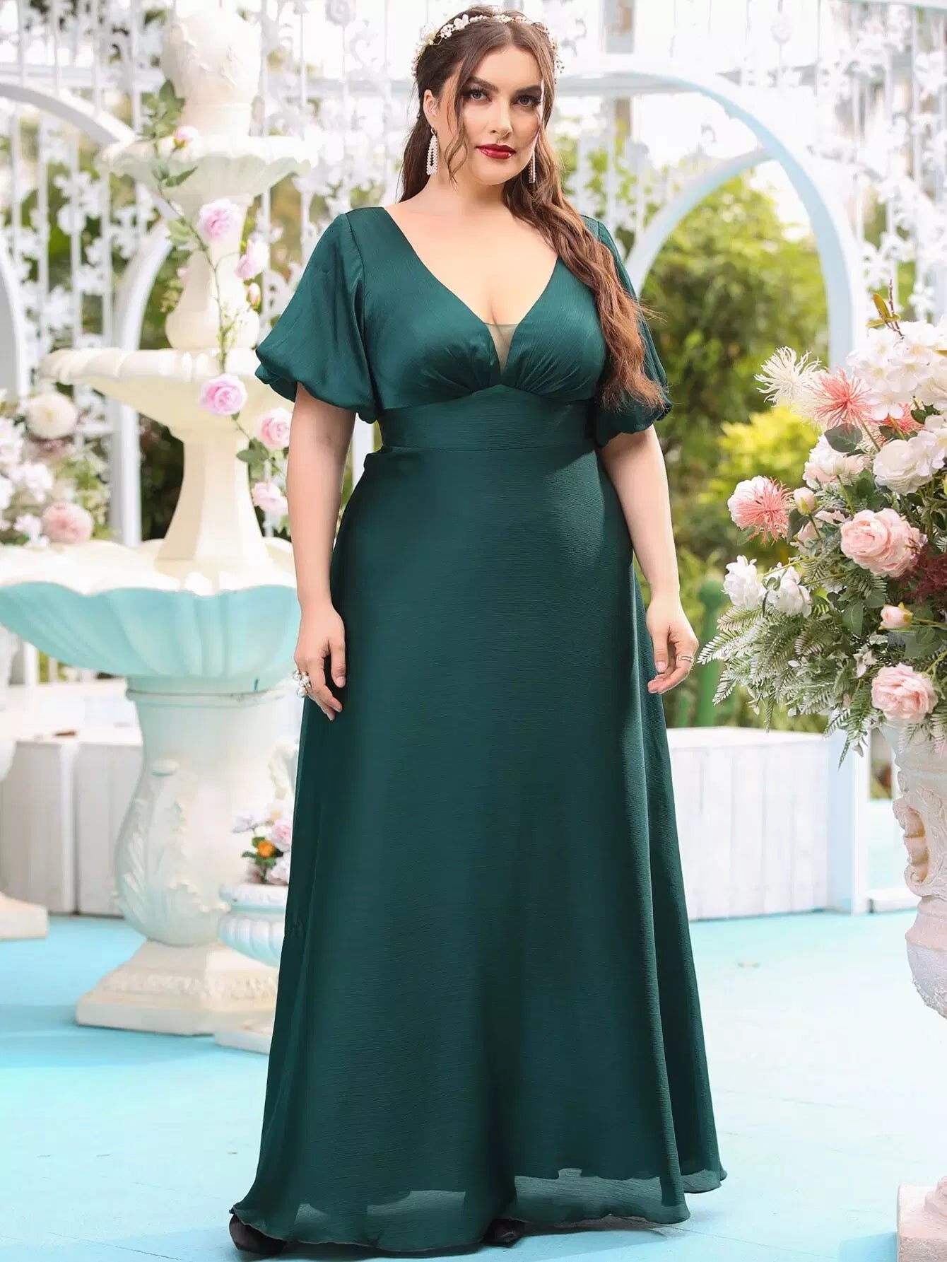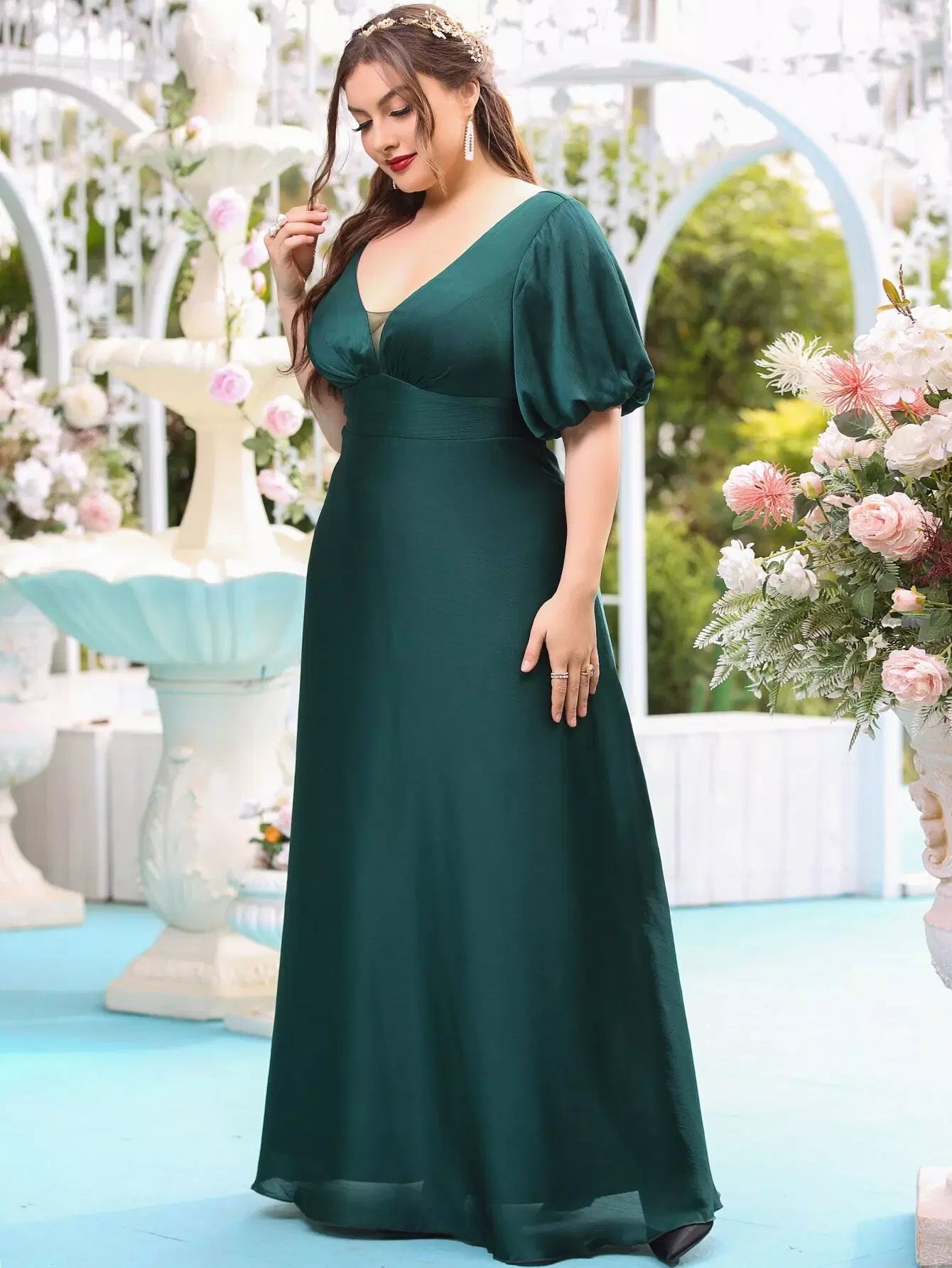 Plus Satin Plunging Neck Bishop Sleeve Dress