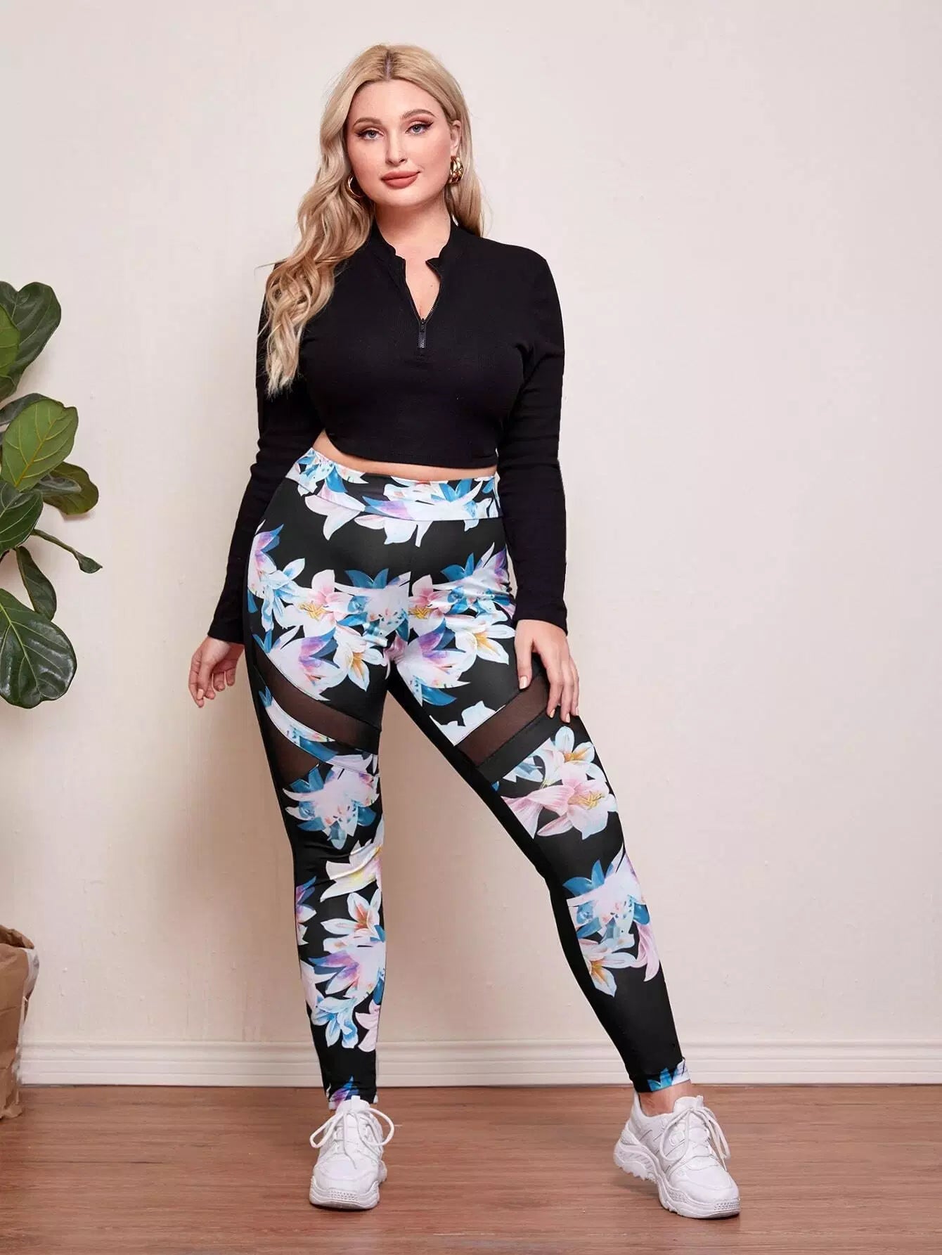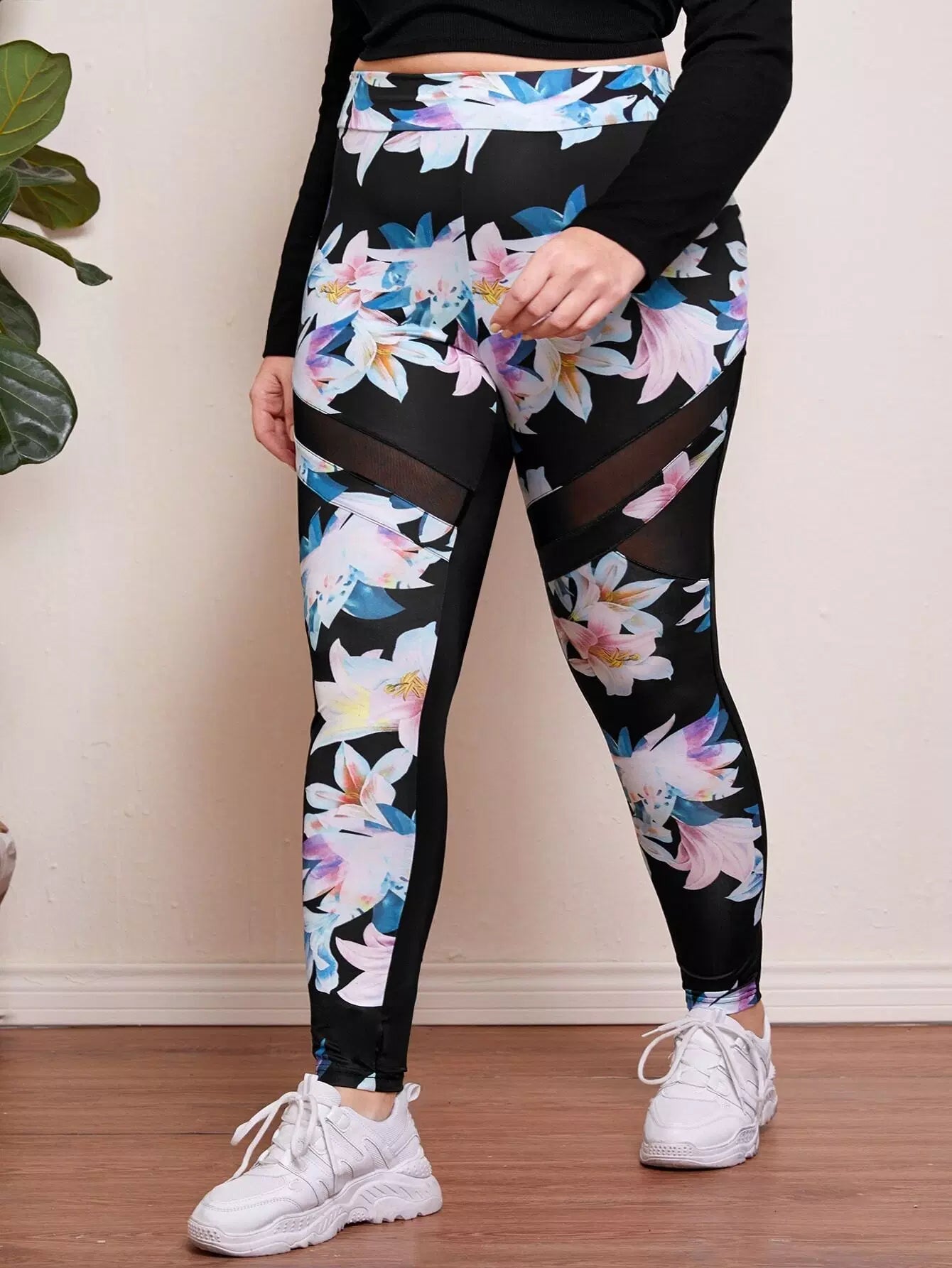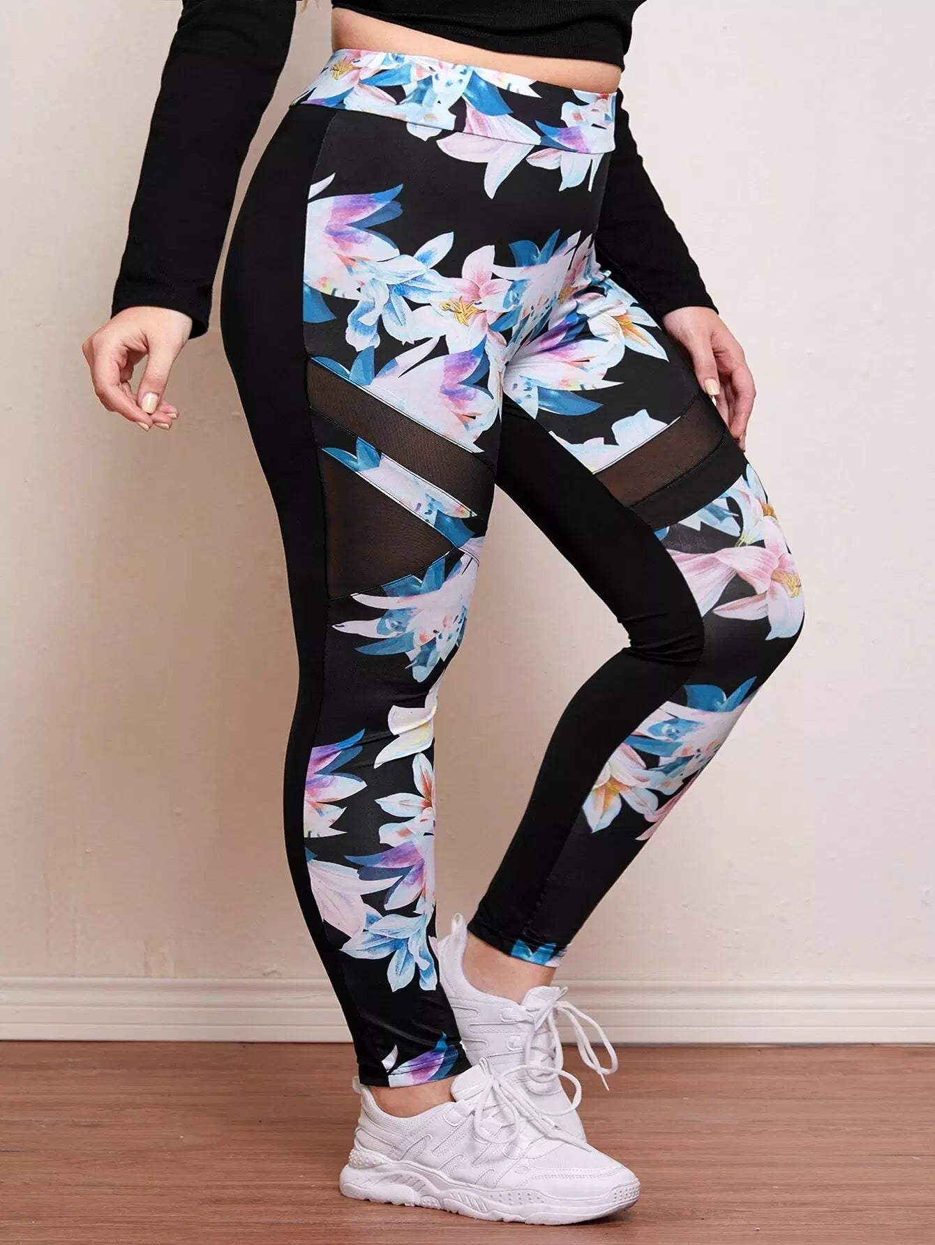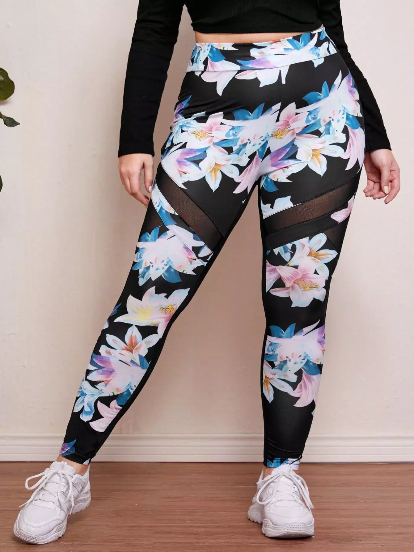 Women - Plus Sheer Mesh Insert Floral Print Leggings