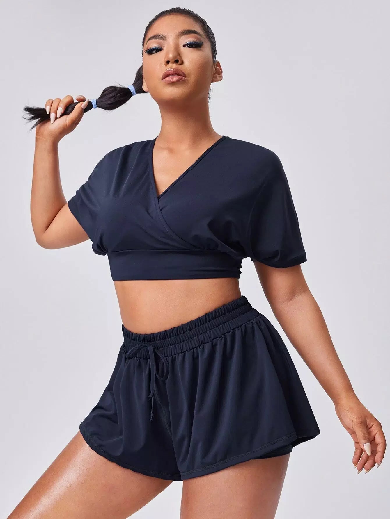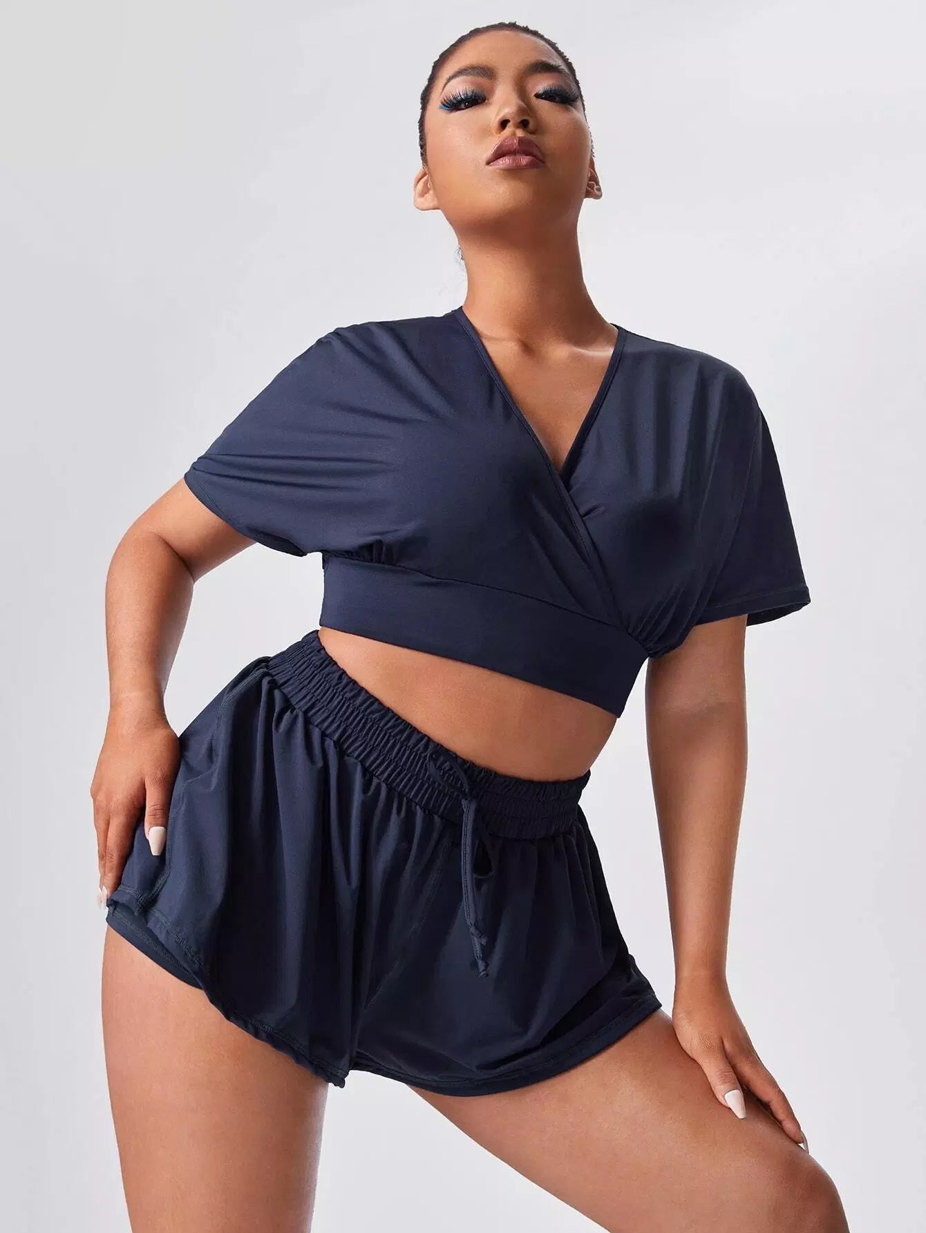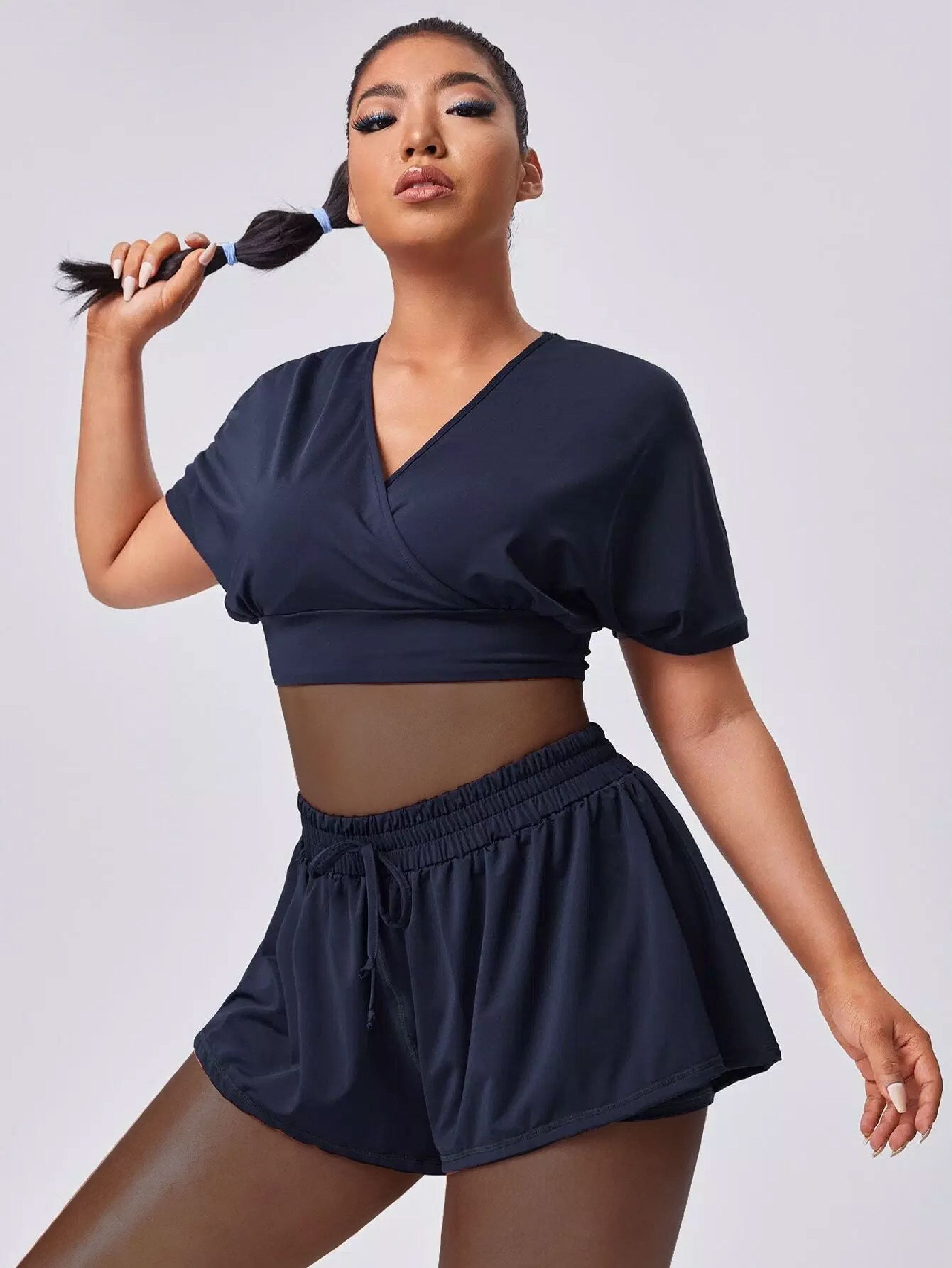 Plus Solid Keyhole Back Sports Top & Shorts
