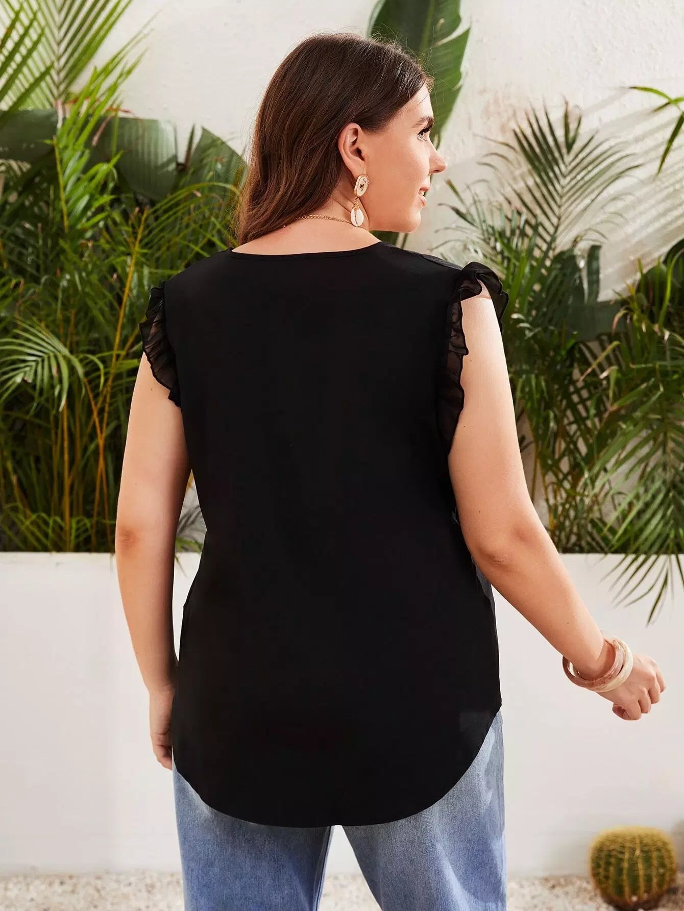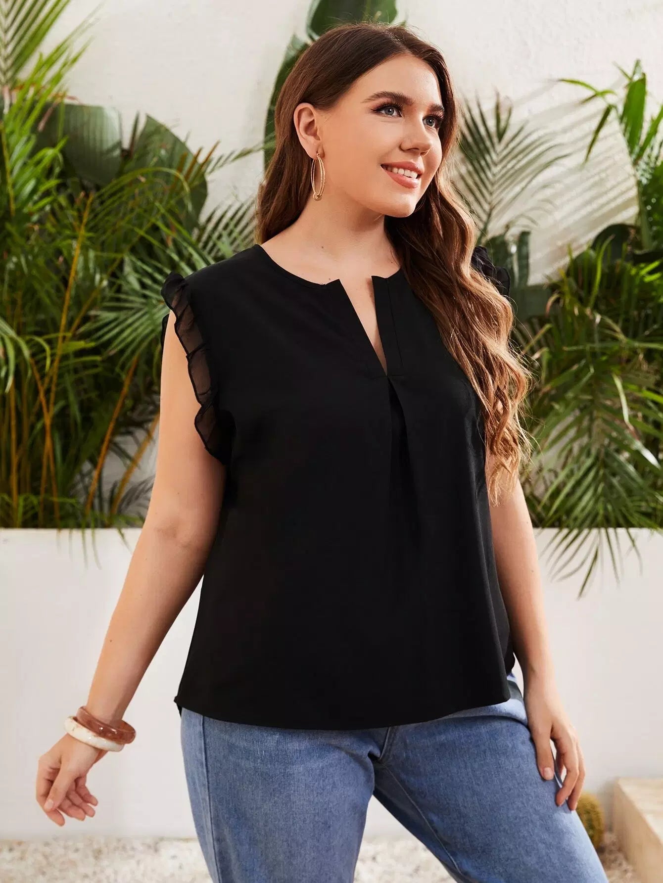 Plus Solid Notch Neck Ruffle Armhole Blouse