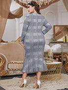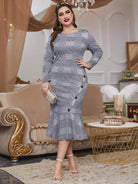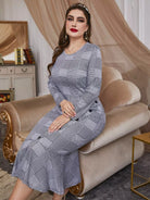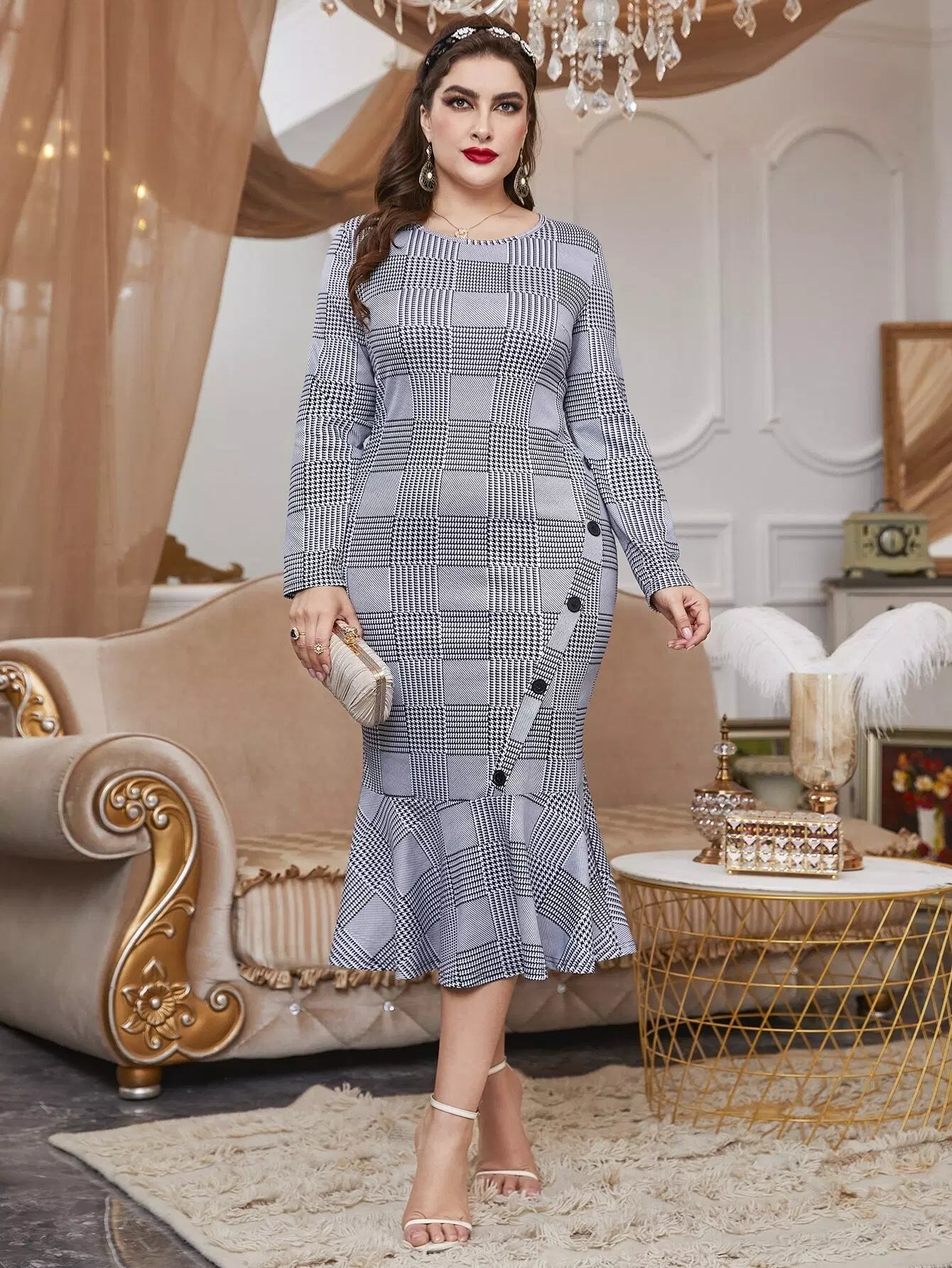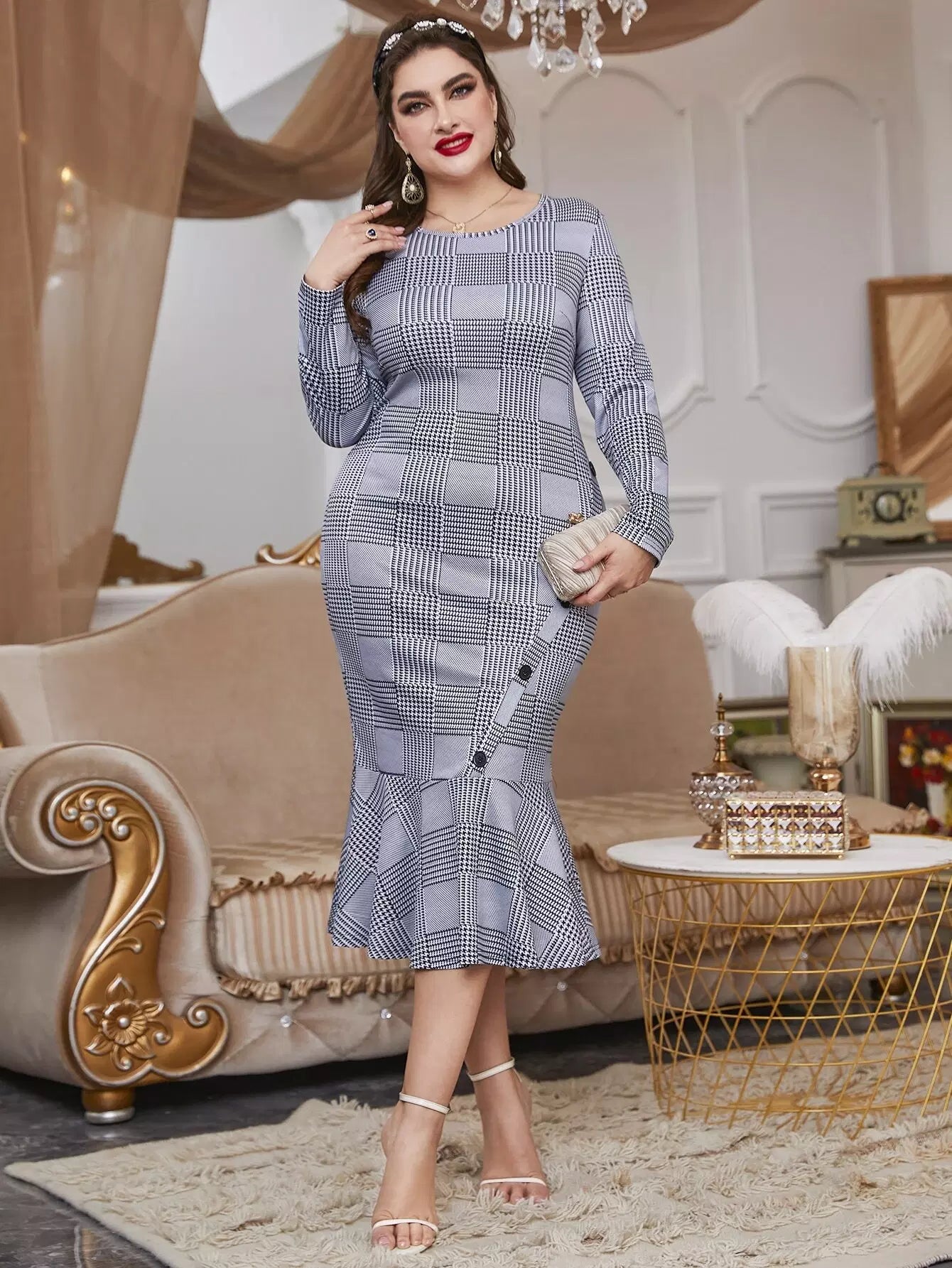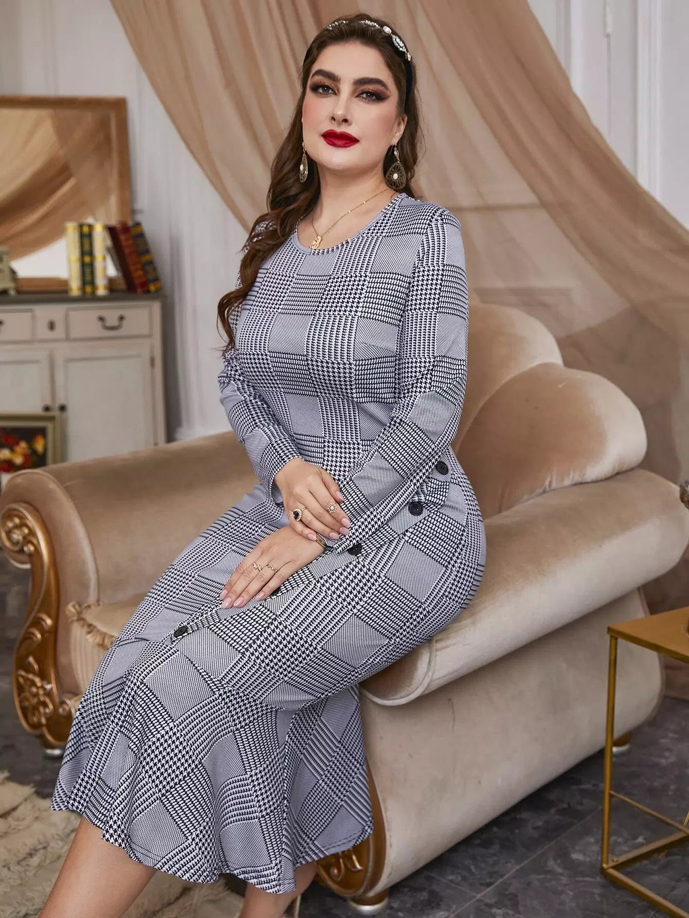 Plus Striped & Houndstooth Button Detail Mermaid Hem Dress