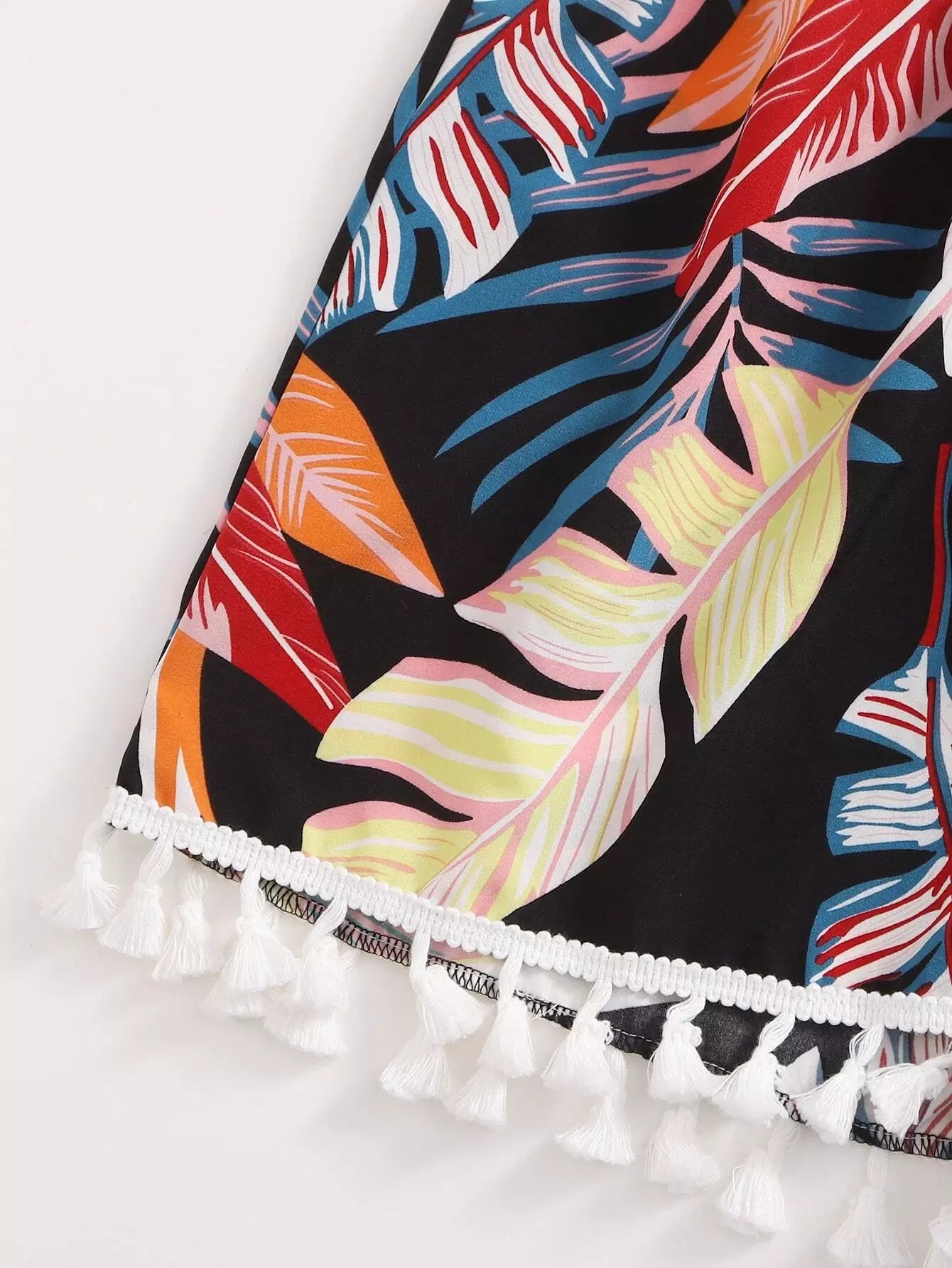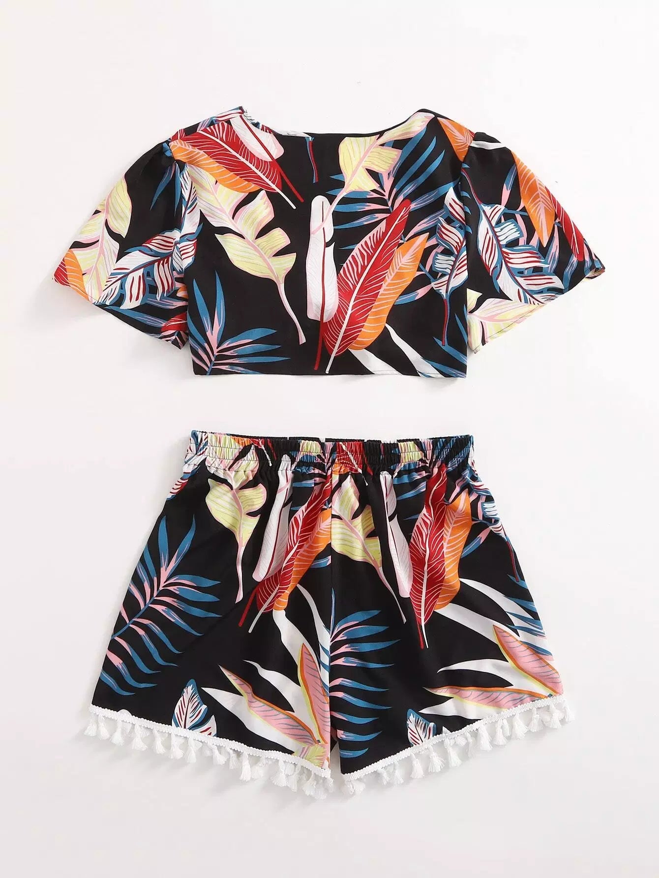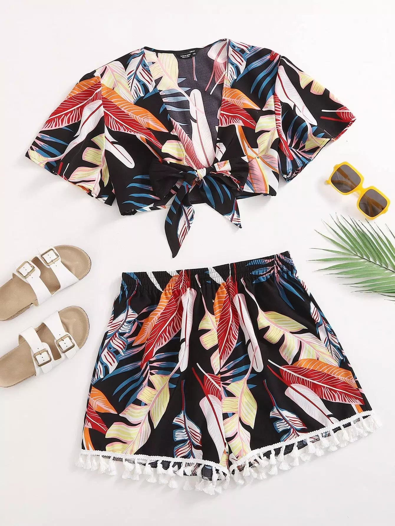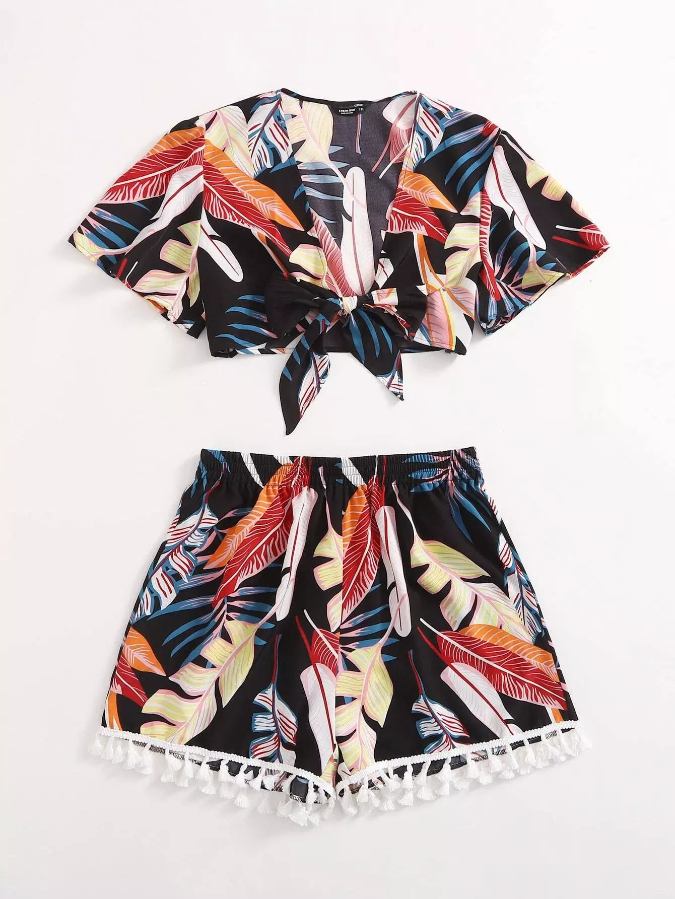 Plus Tropical Print Tie Front Top & Tassel Shorts