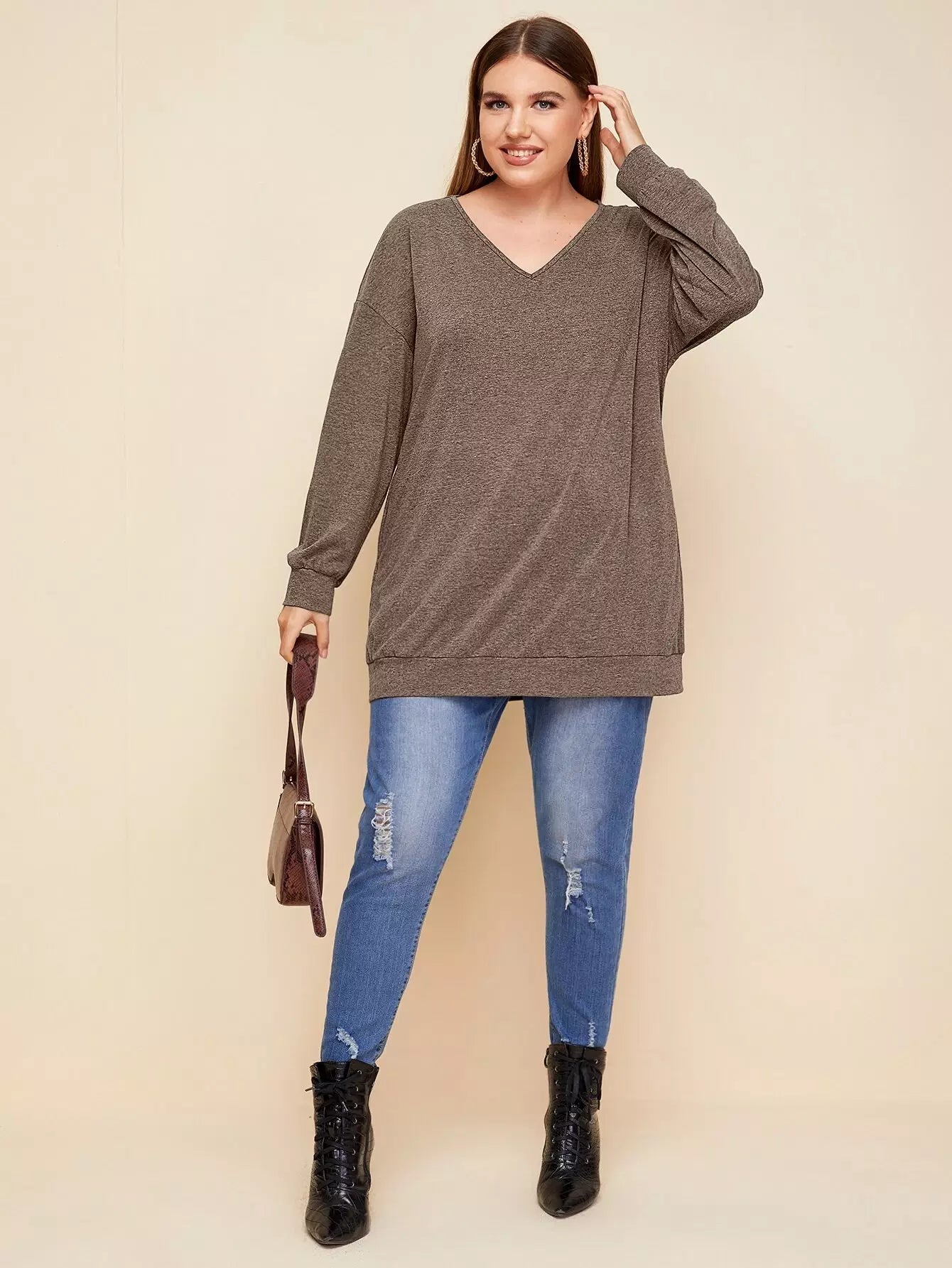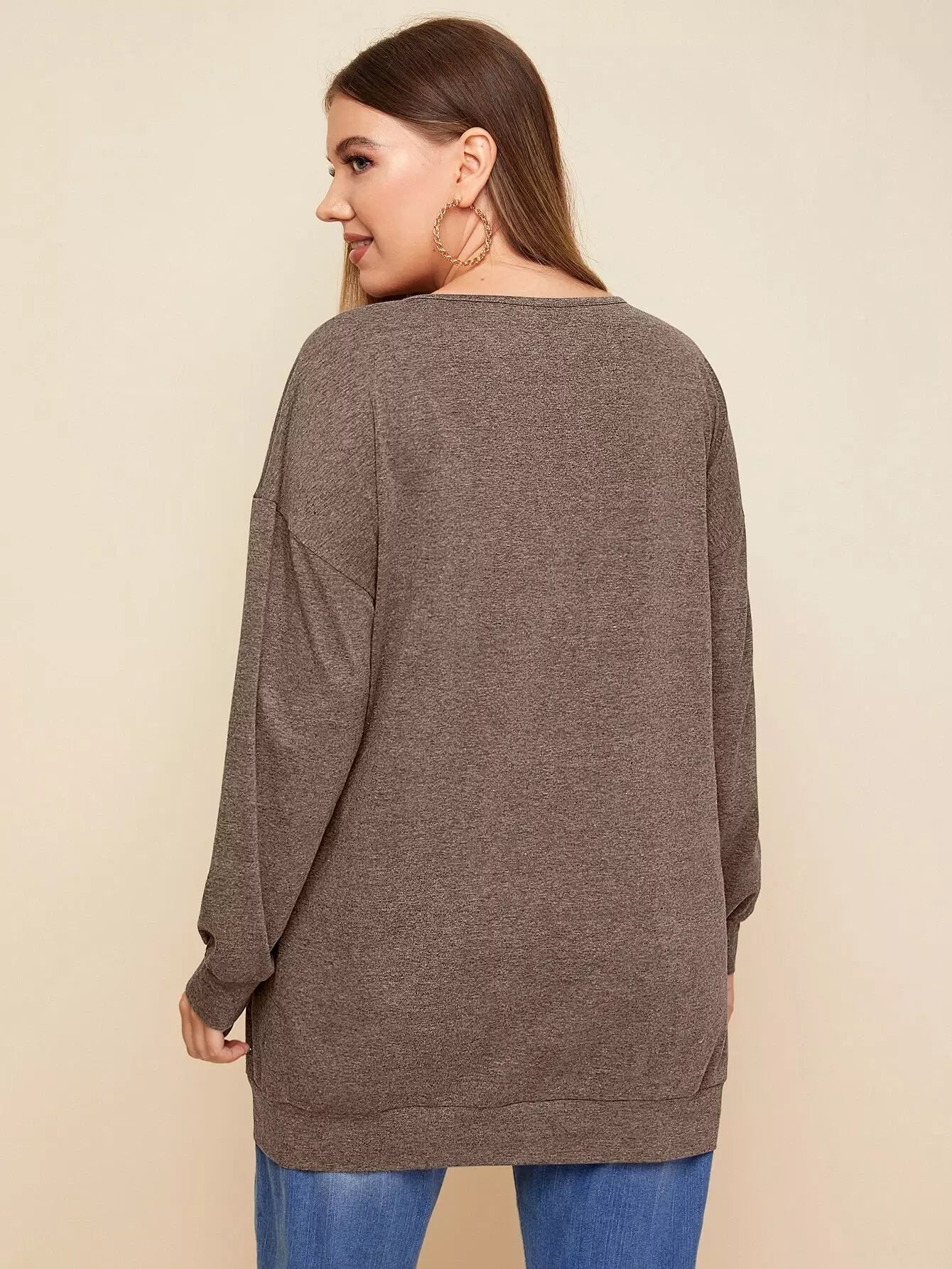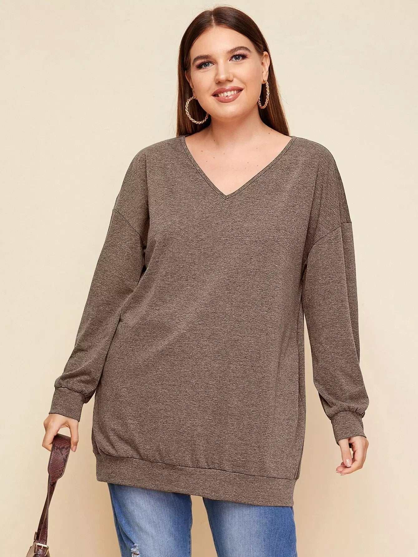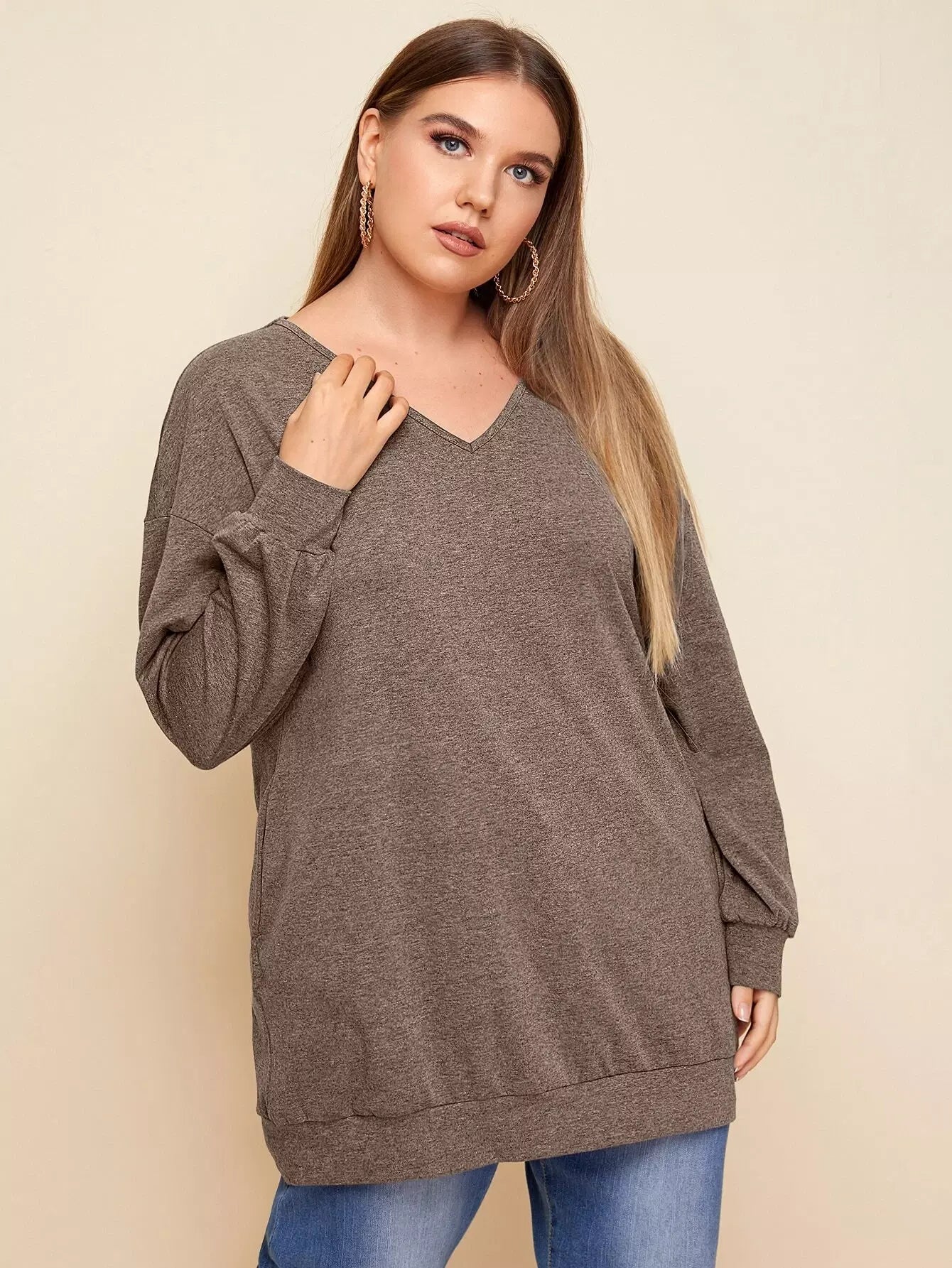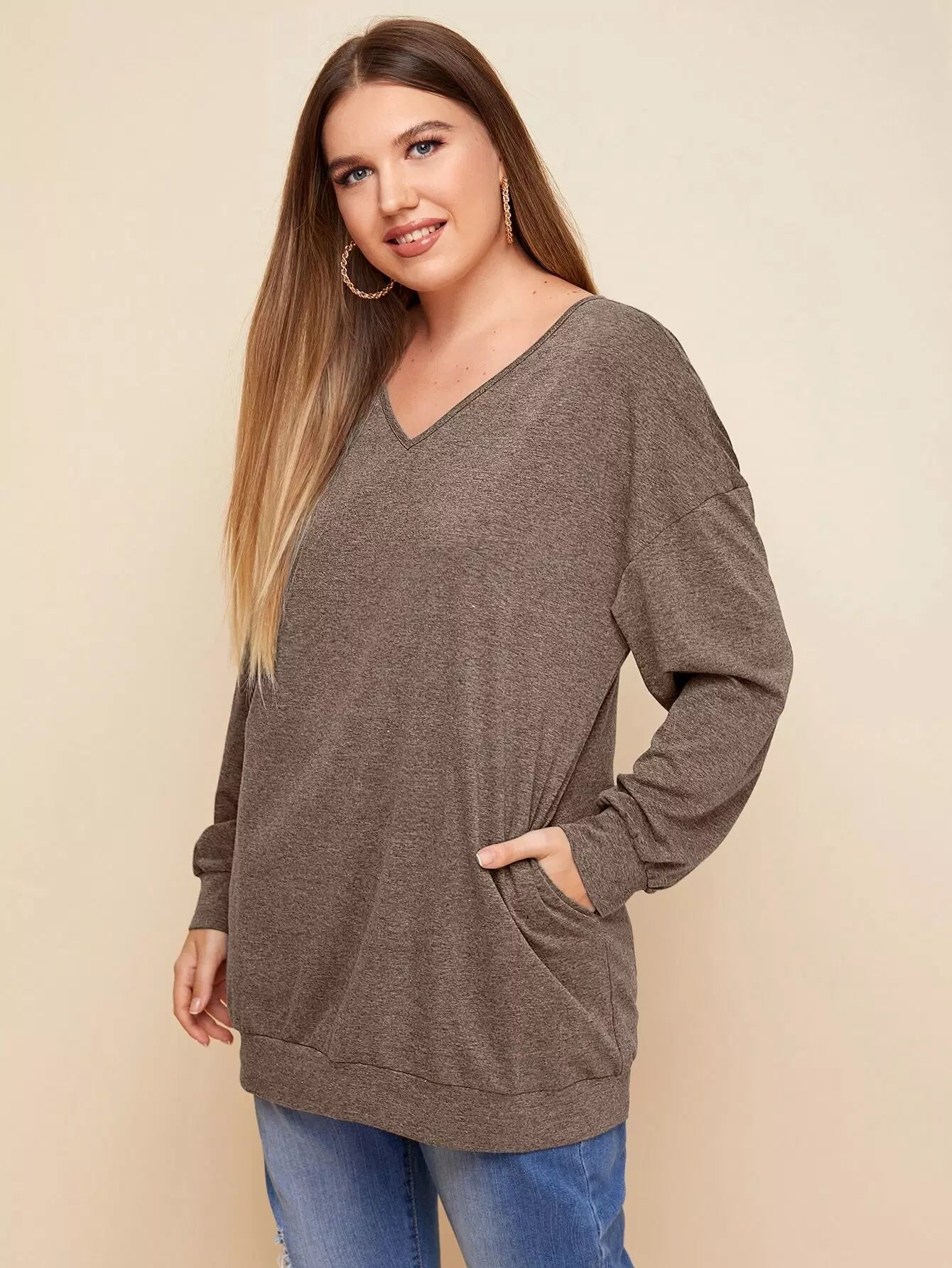 Plus V-neck Drop Shoulder Solid Sweatshirt