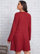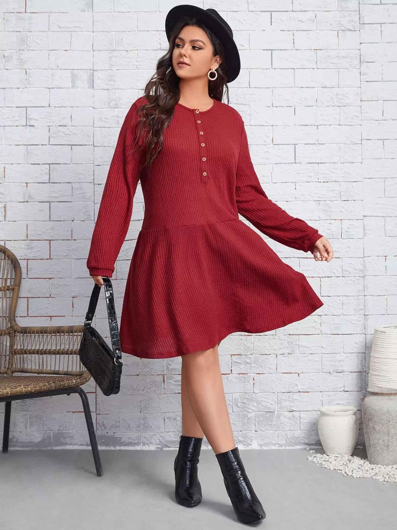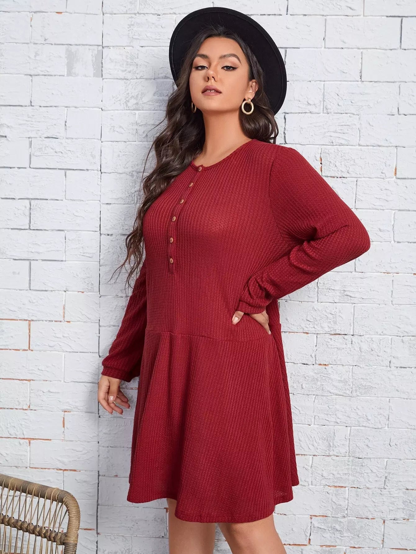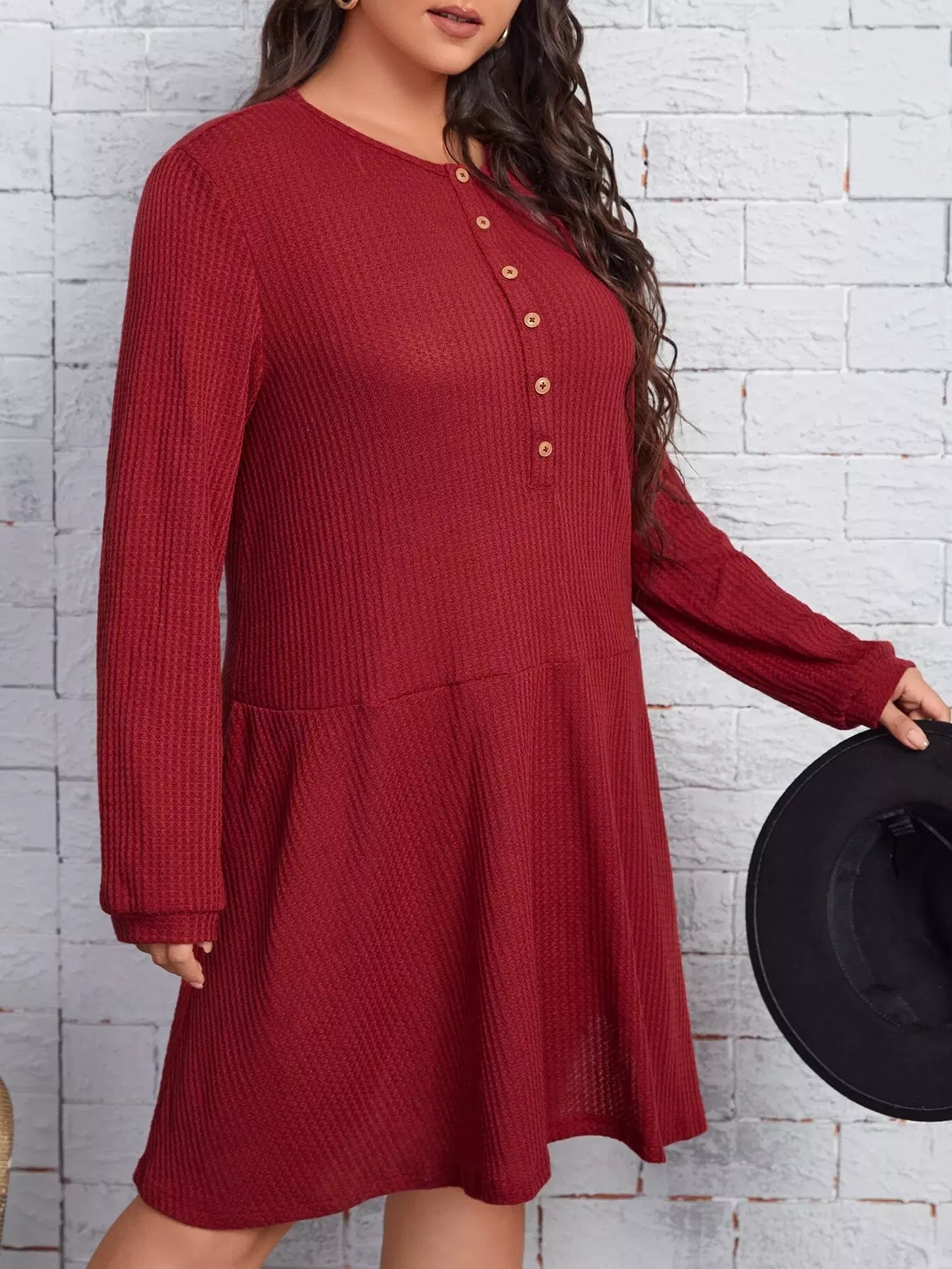 Plus Waffle Knit Half Button Ruffle Hem Dress