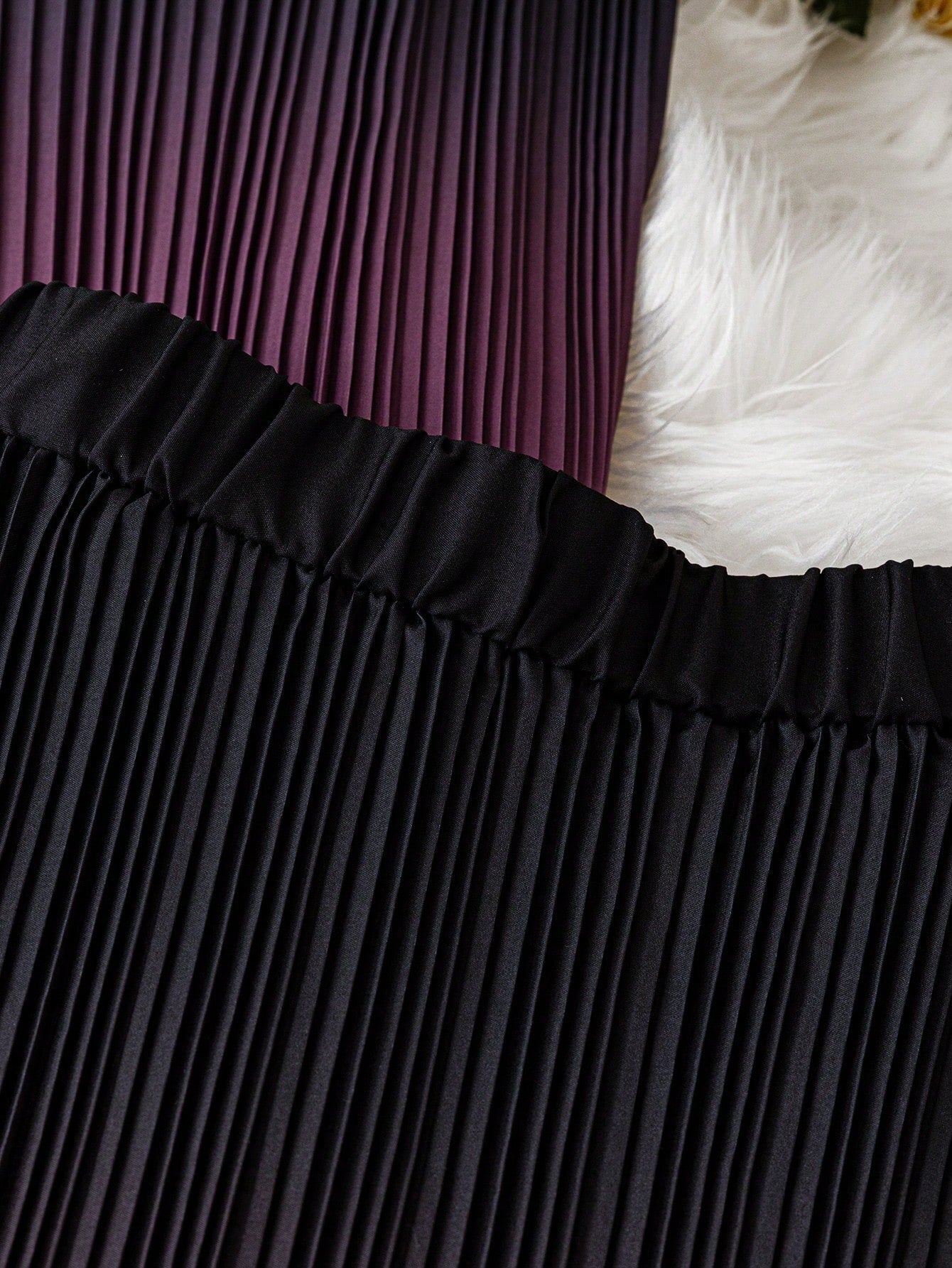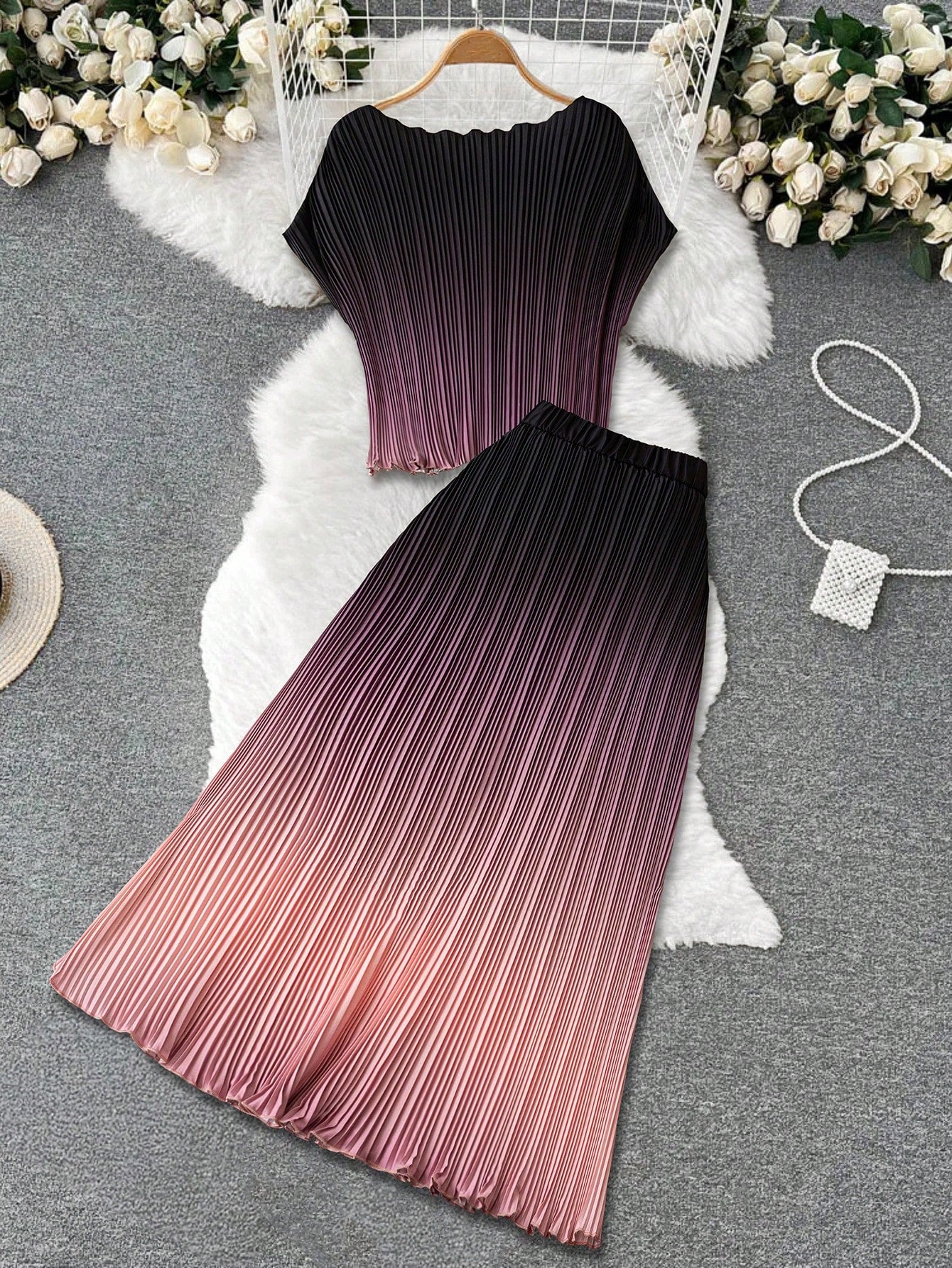 Rometta Exquisite & Elegant Plus Size 2pcs Ombre Print Short Sleeve Top And Skirt Set, Fashionable For