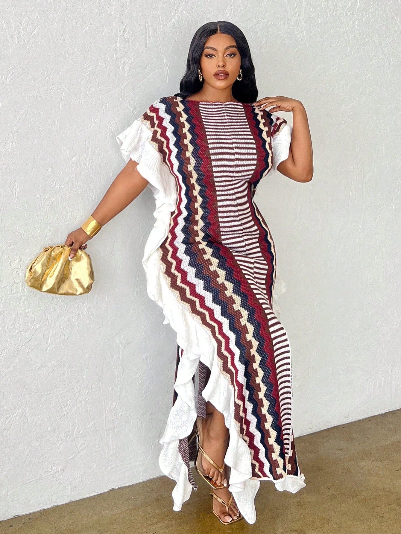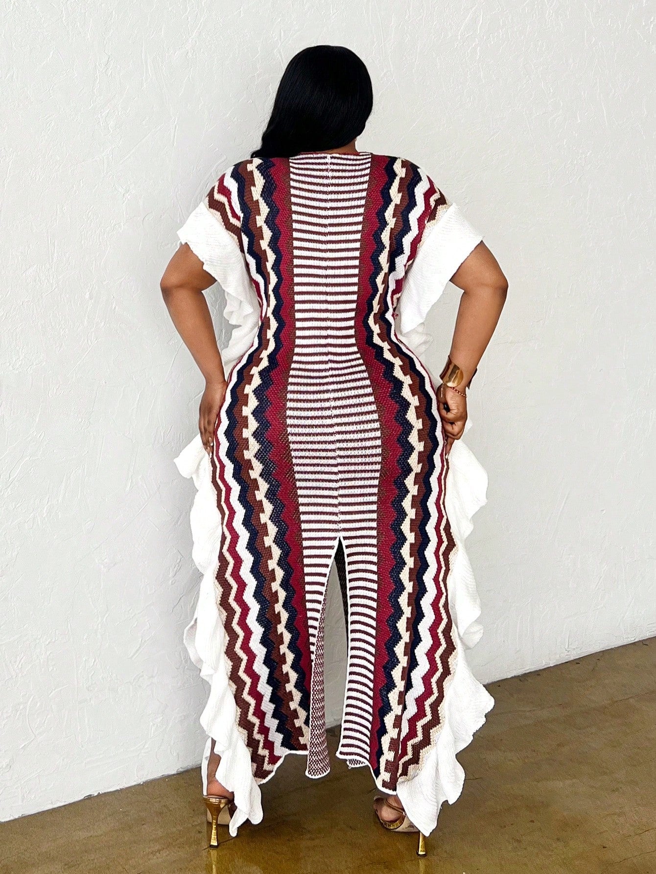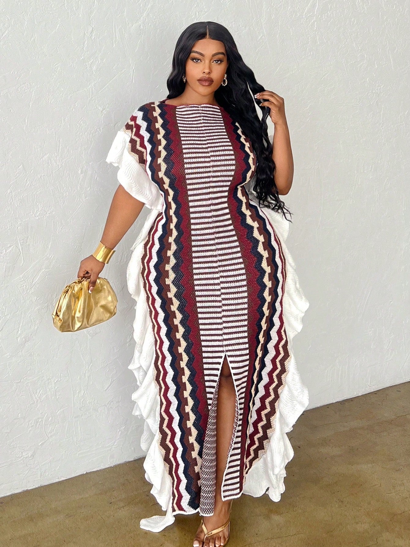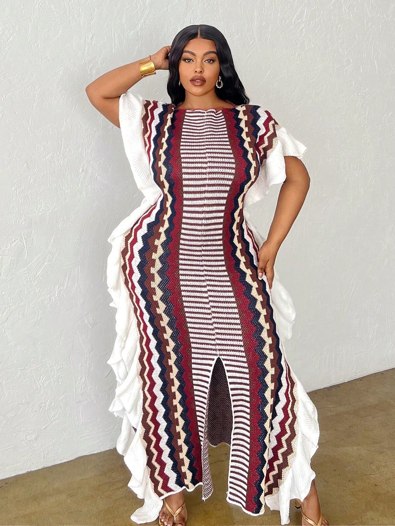 Slaydiva Women Plus Size Casual Ruffled Stripe Pullover Slit Front Sweater Dress