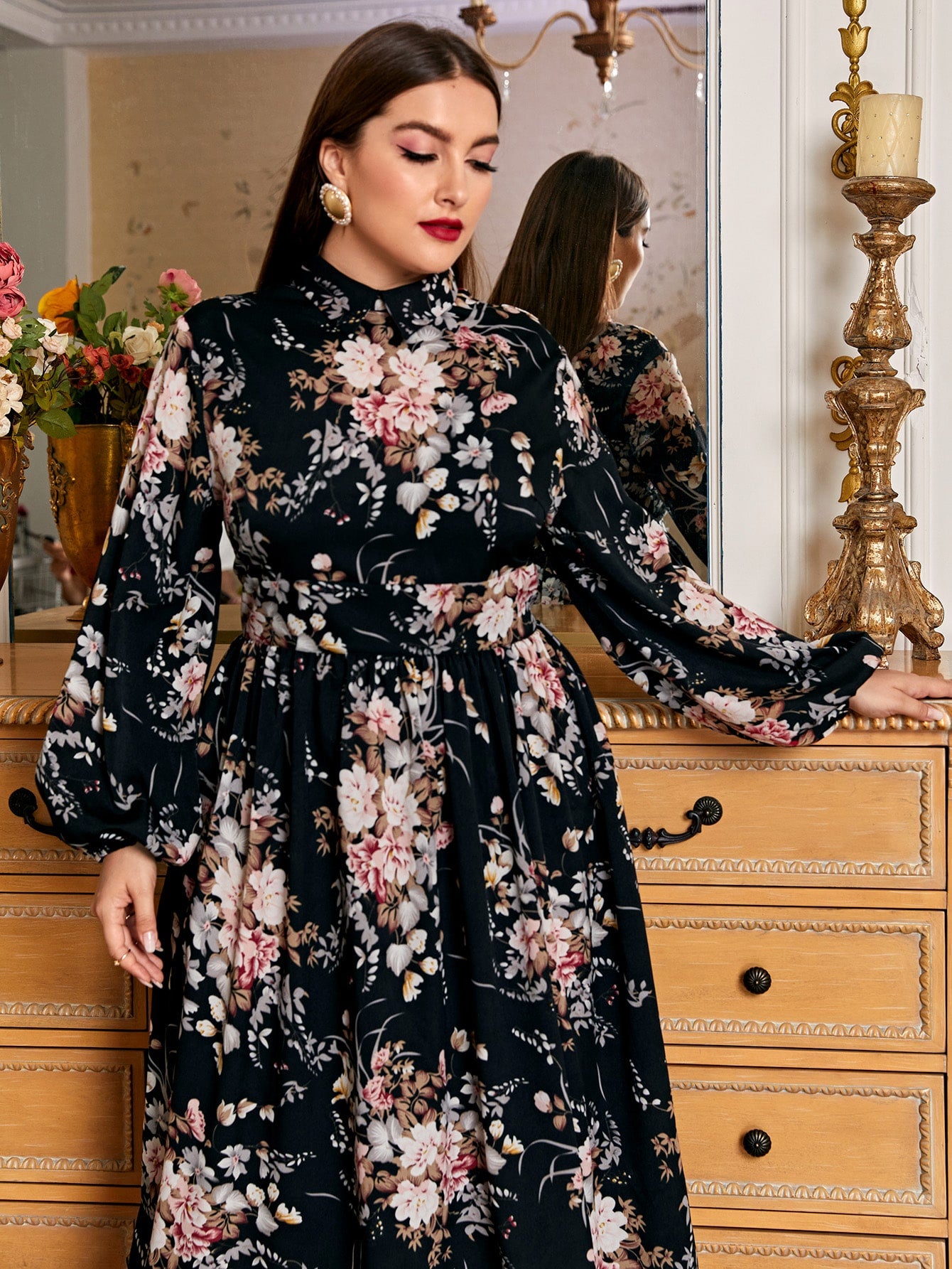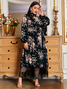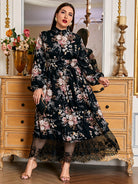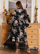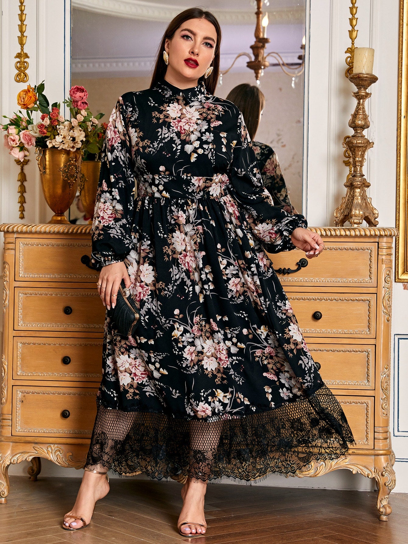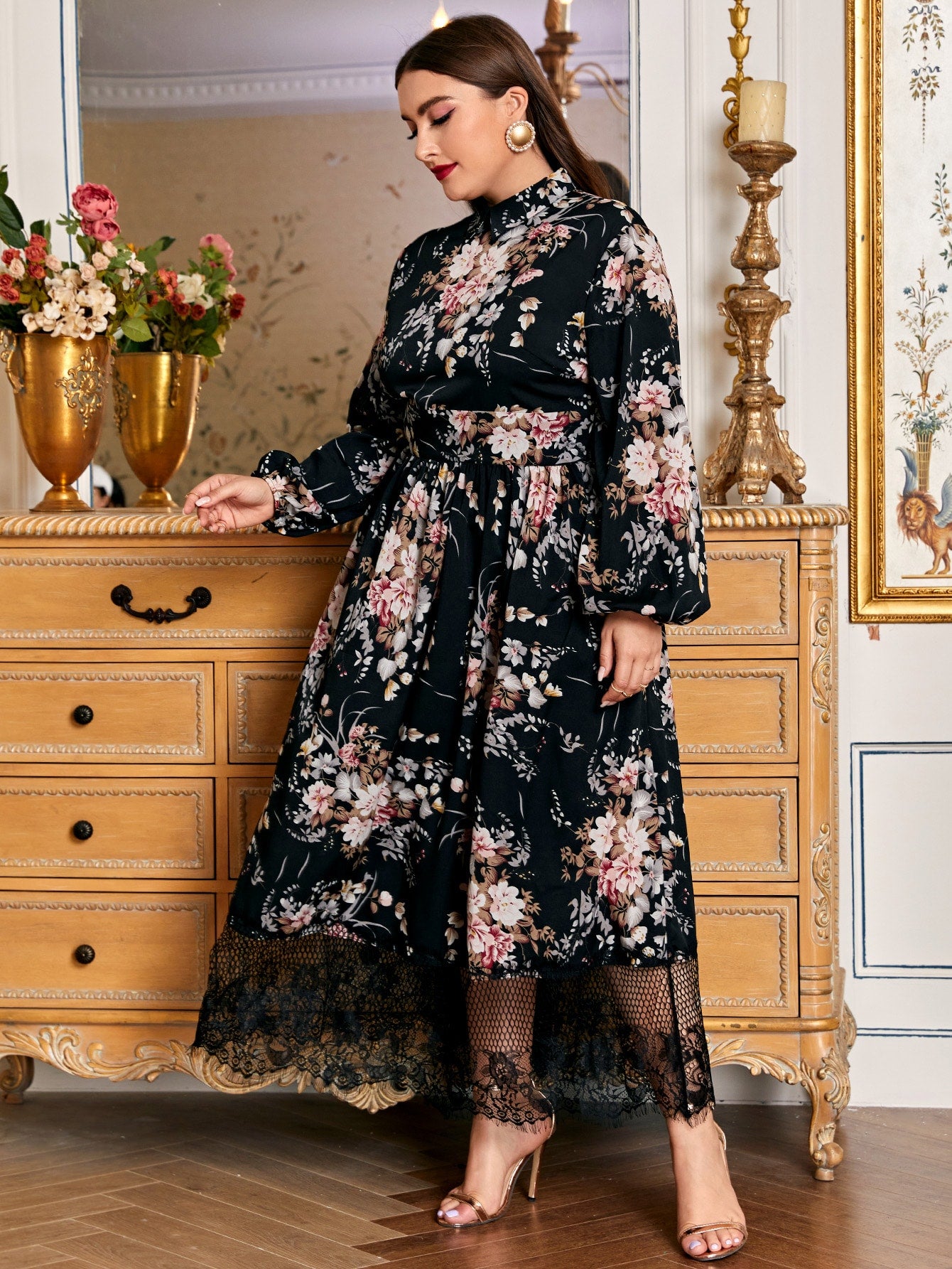 Plus Collared Lantern Sleeve Lace Hem Floral Dress