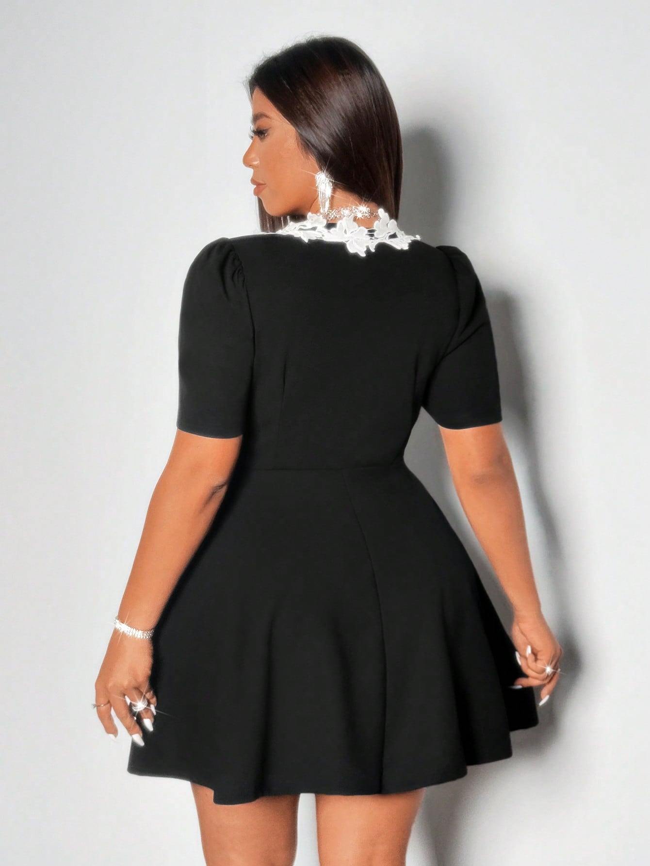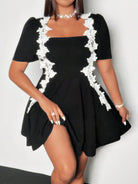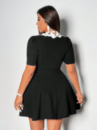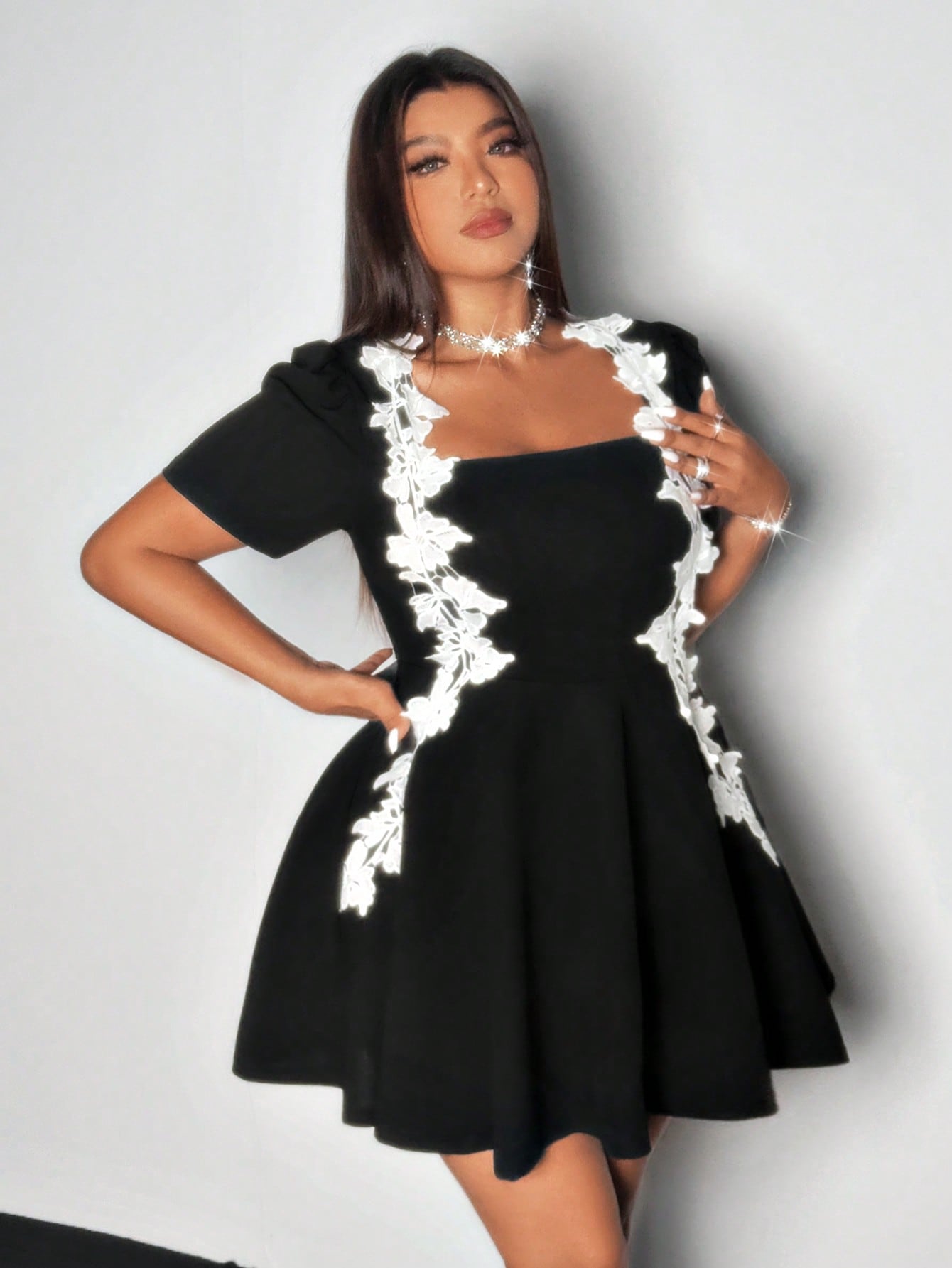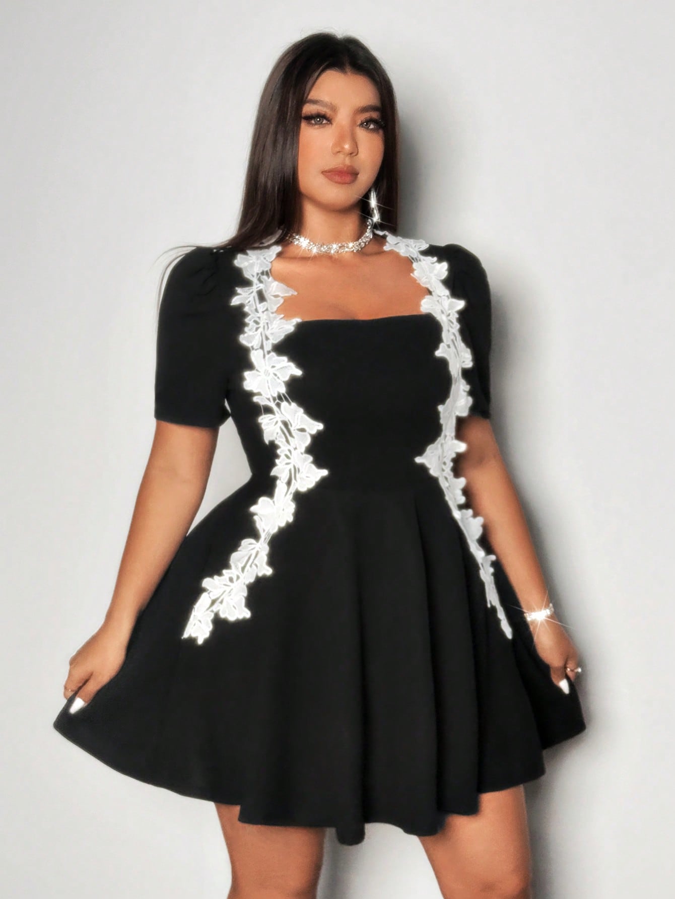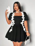 Viva Relle Plus Size Women Decor Square Neck Puff Sleeve Fashion Mini Dress