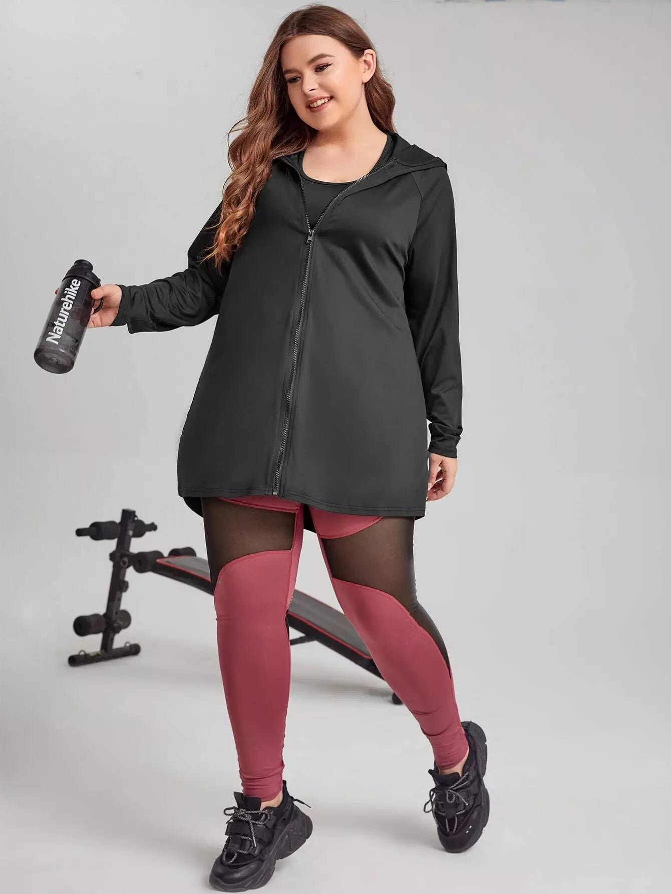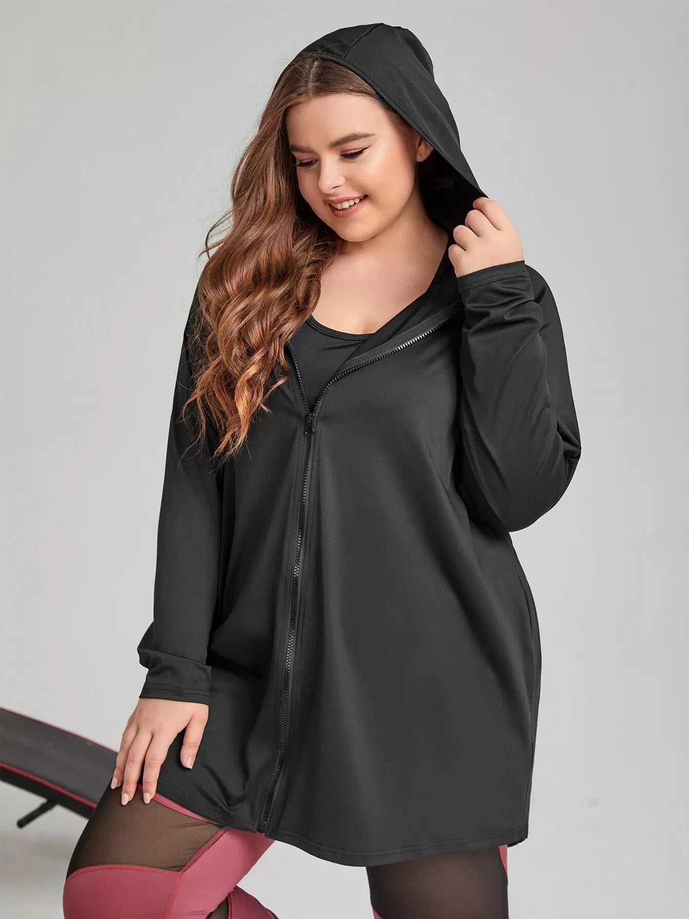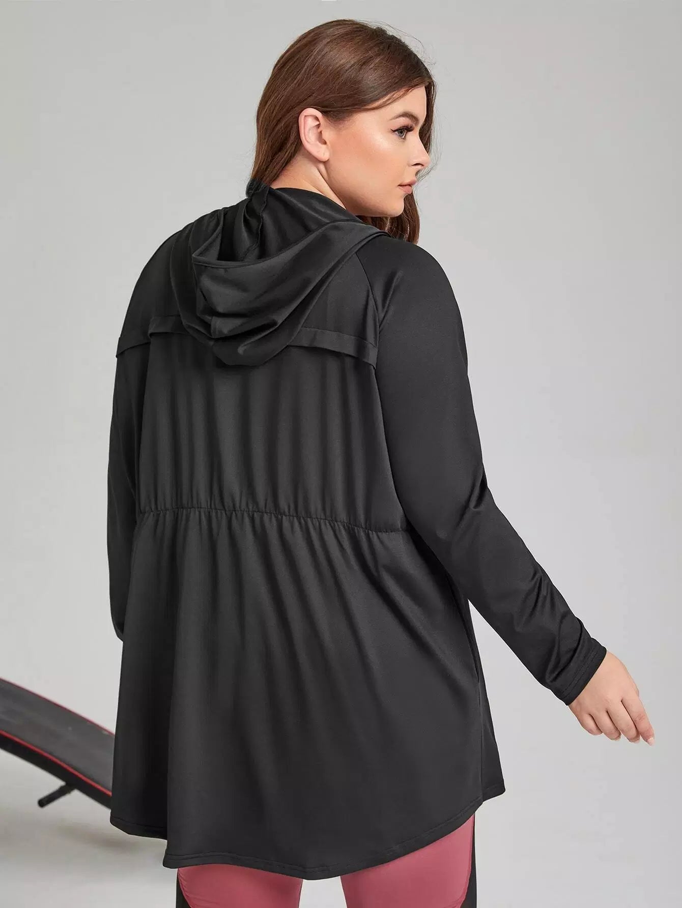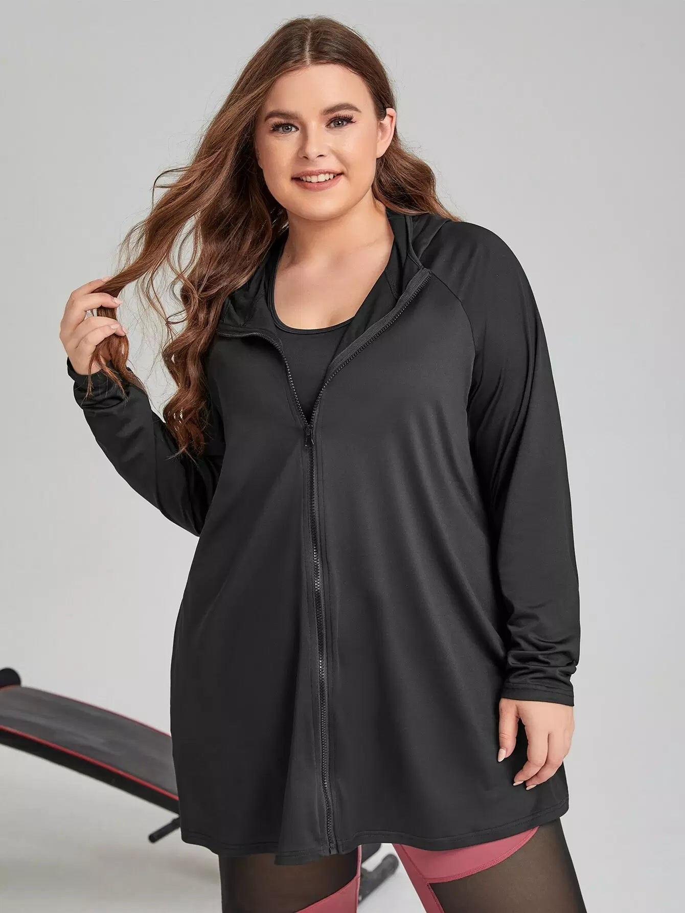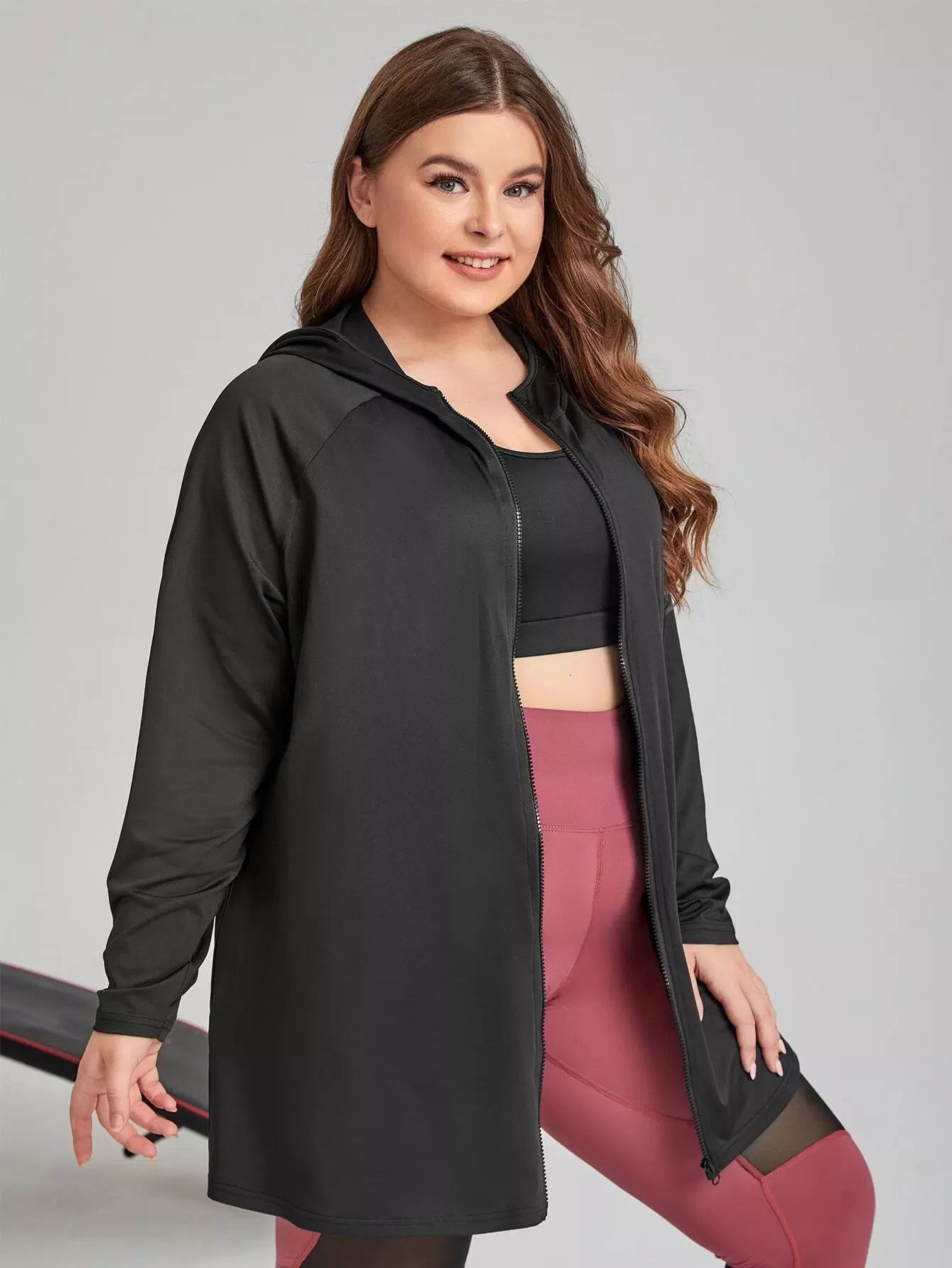 Plus High Stretch Zipper Up Raglan Sleeve Hooded Sports Jacket