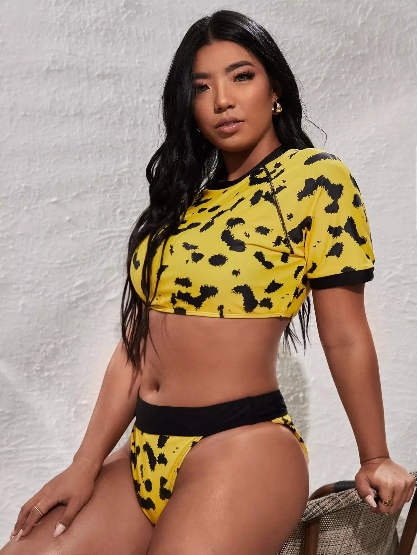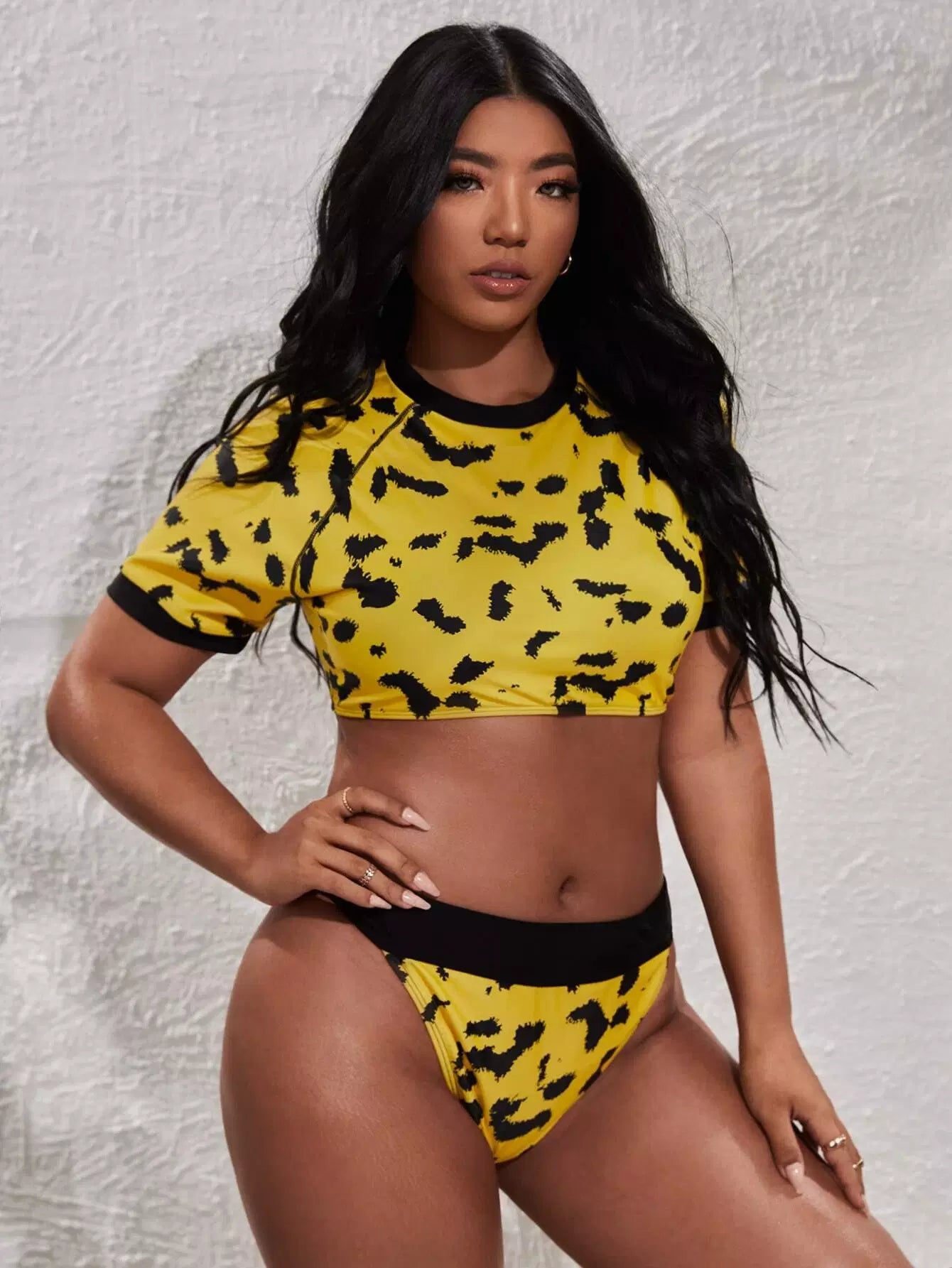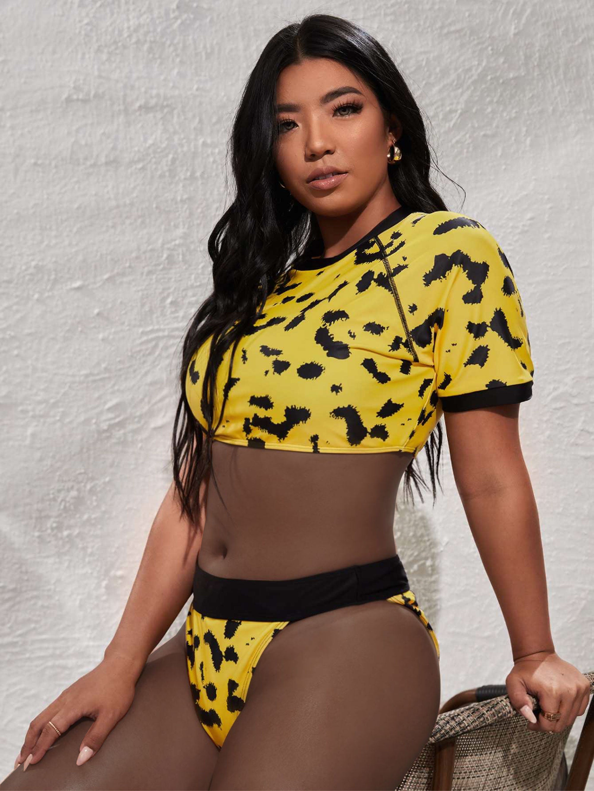 Plus Allover Graphic Bikini Swimsuit With Short Sleeve