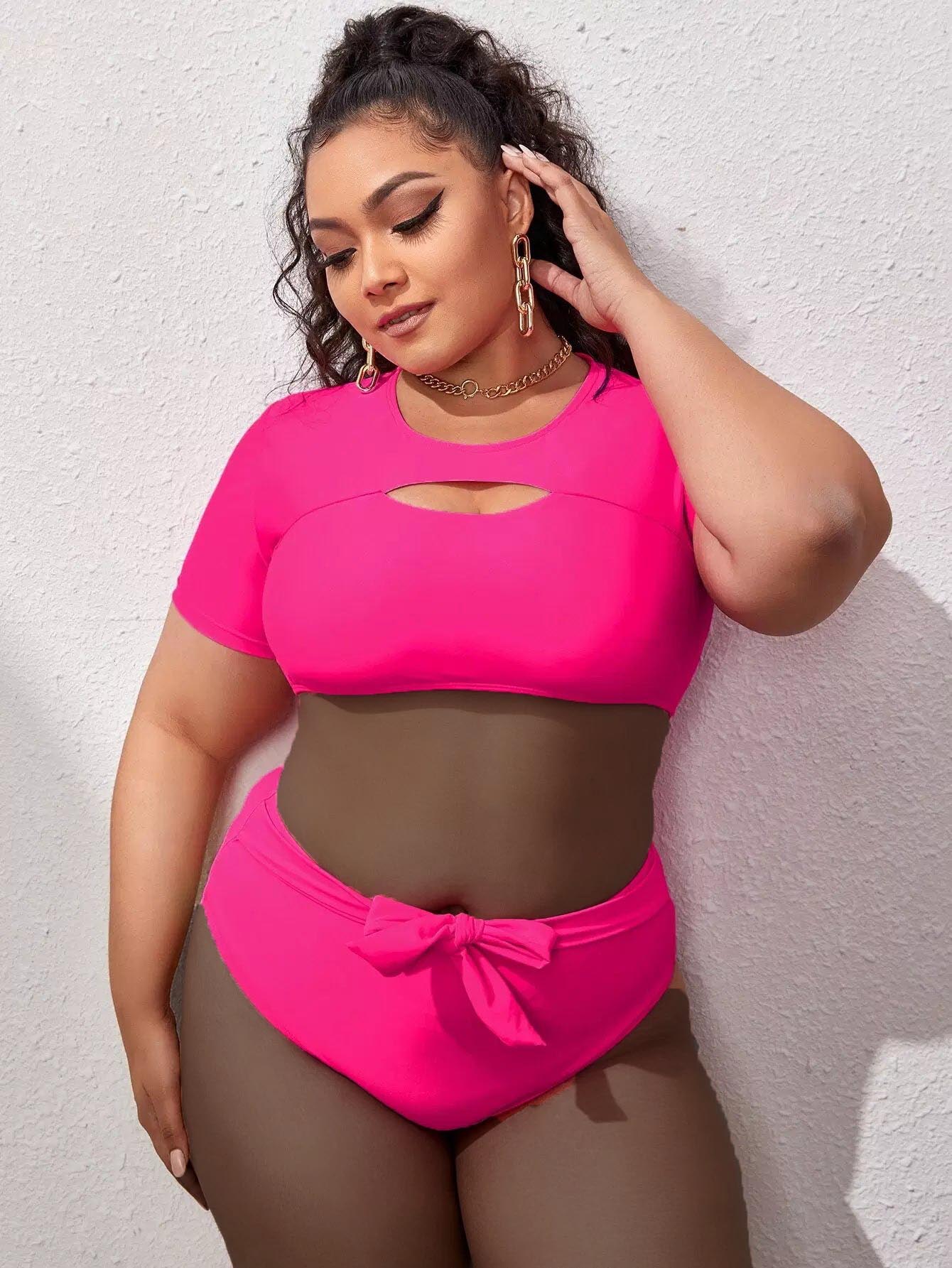Plus Cut-out Knot Front Bikini Swimsuit With Short Sleeve
