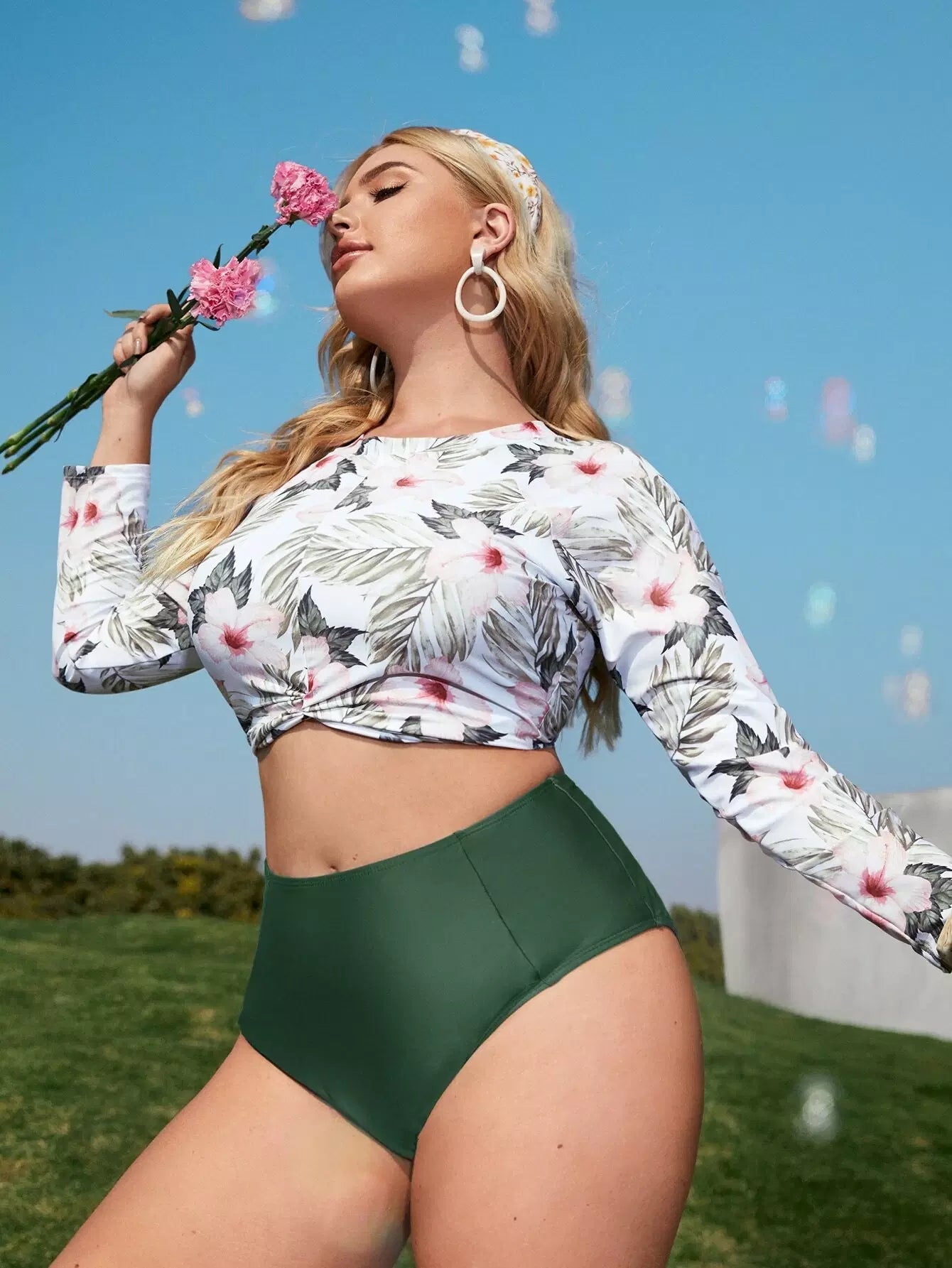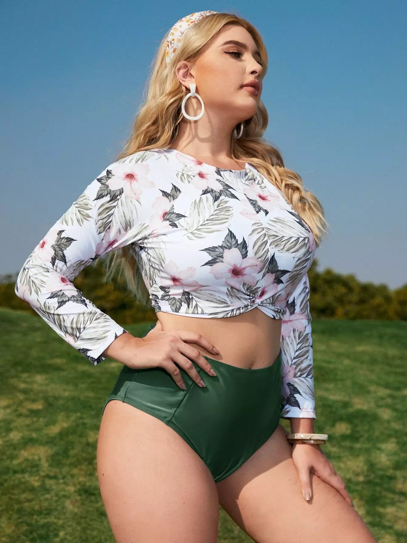 Plus Floral & Plant Print Twist Bikini Swimsuit With Long Sleeve
