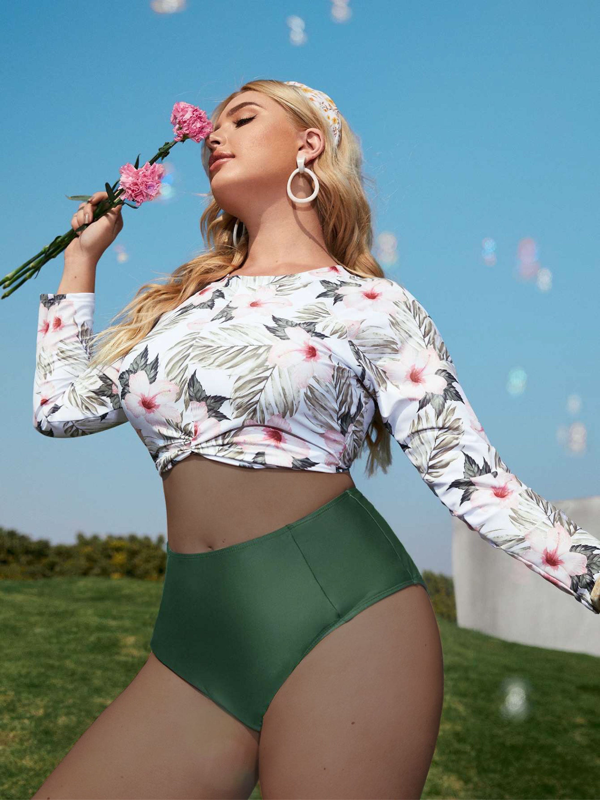 Women - Plus Floral & Plant Print Twist Bikini Swimsuit With Long Sleeve