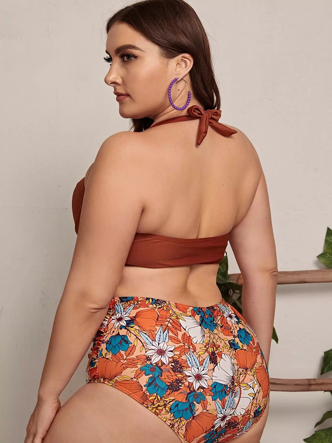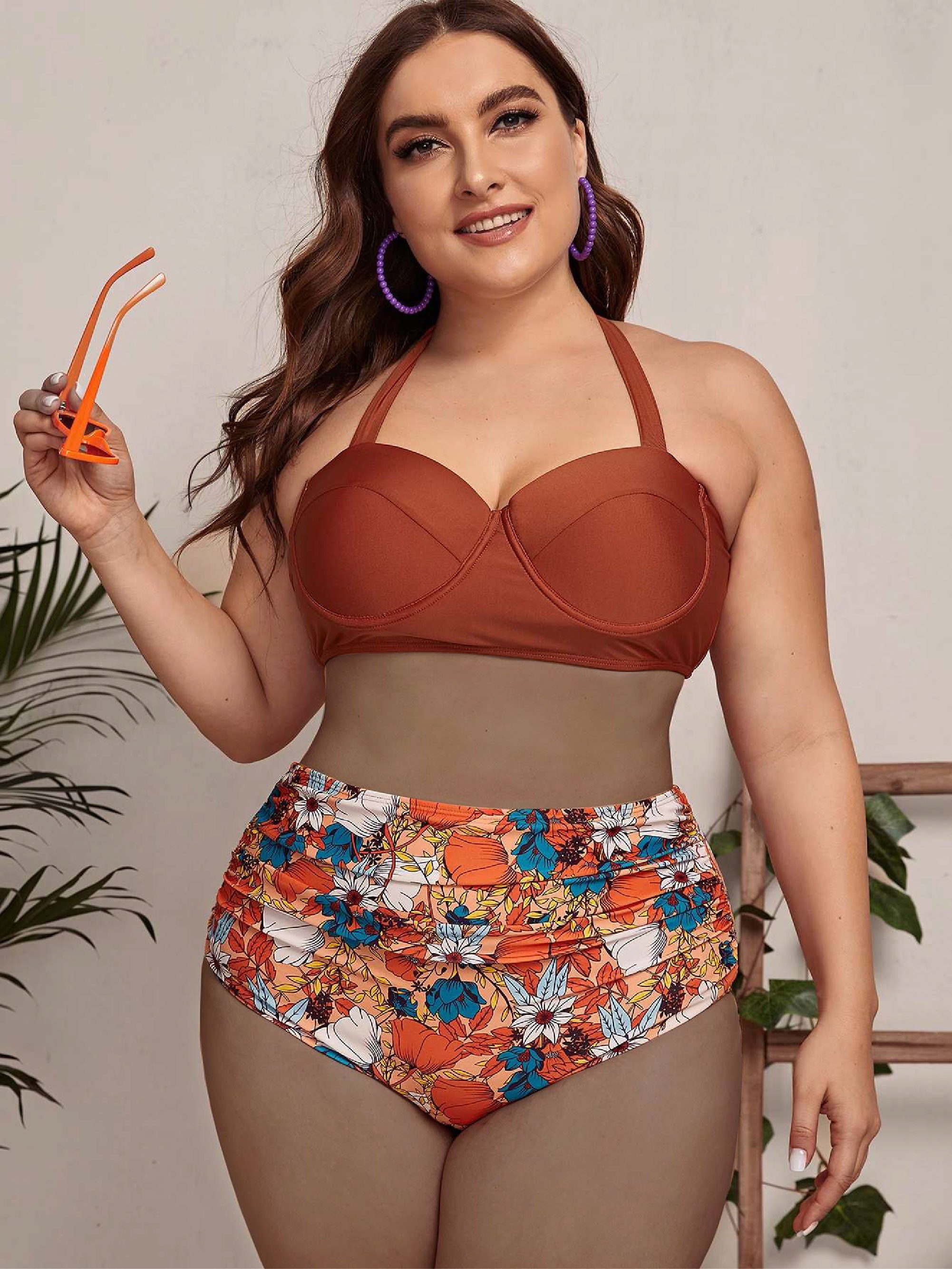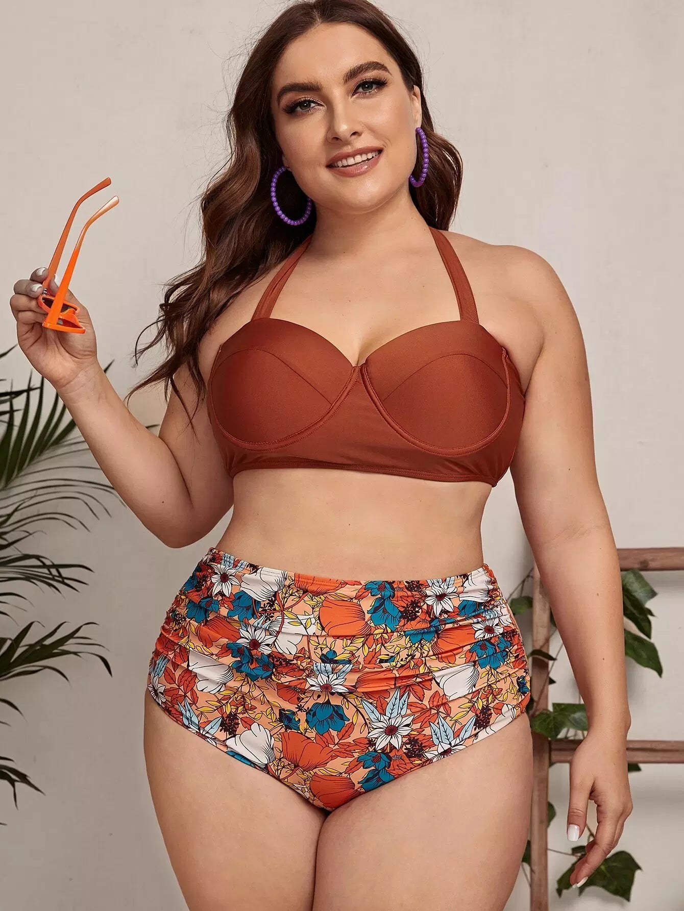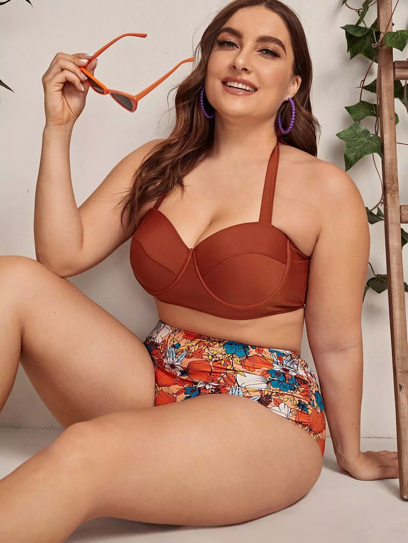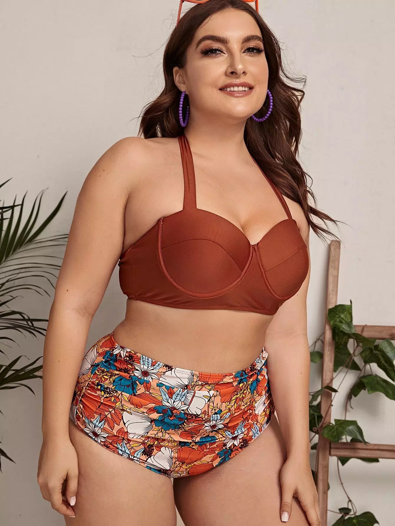 Plus Underwire Halter Top With Floral High Waisted Bikini