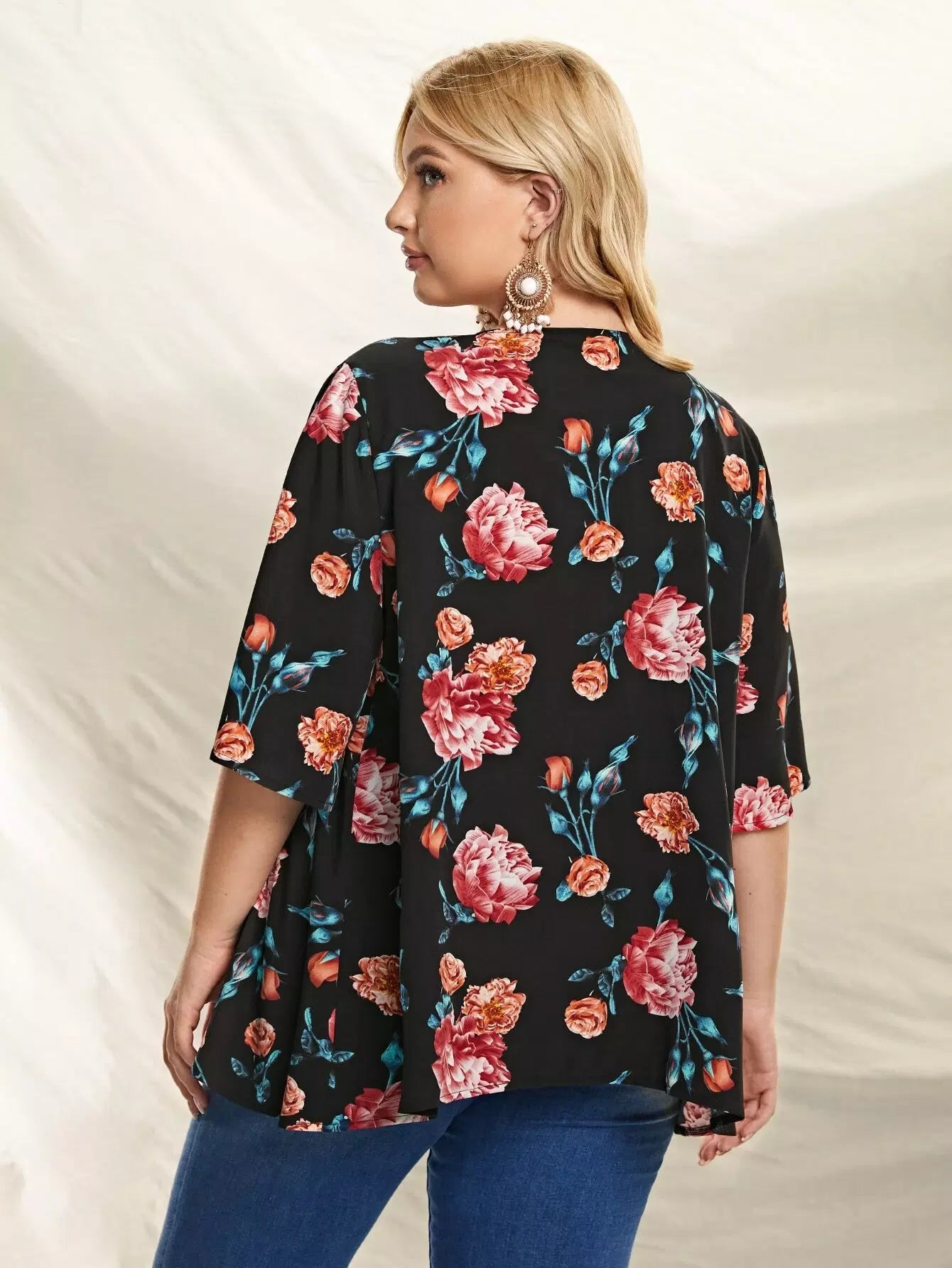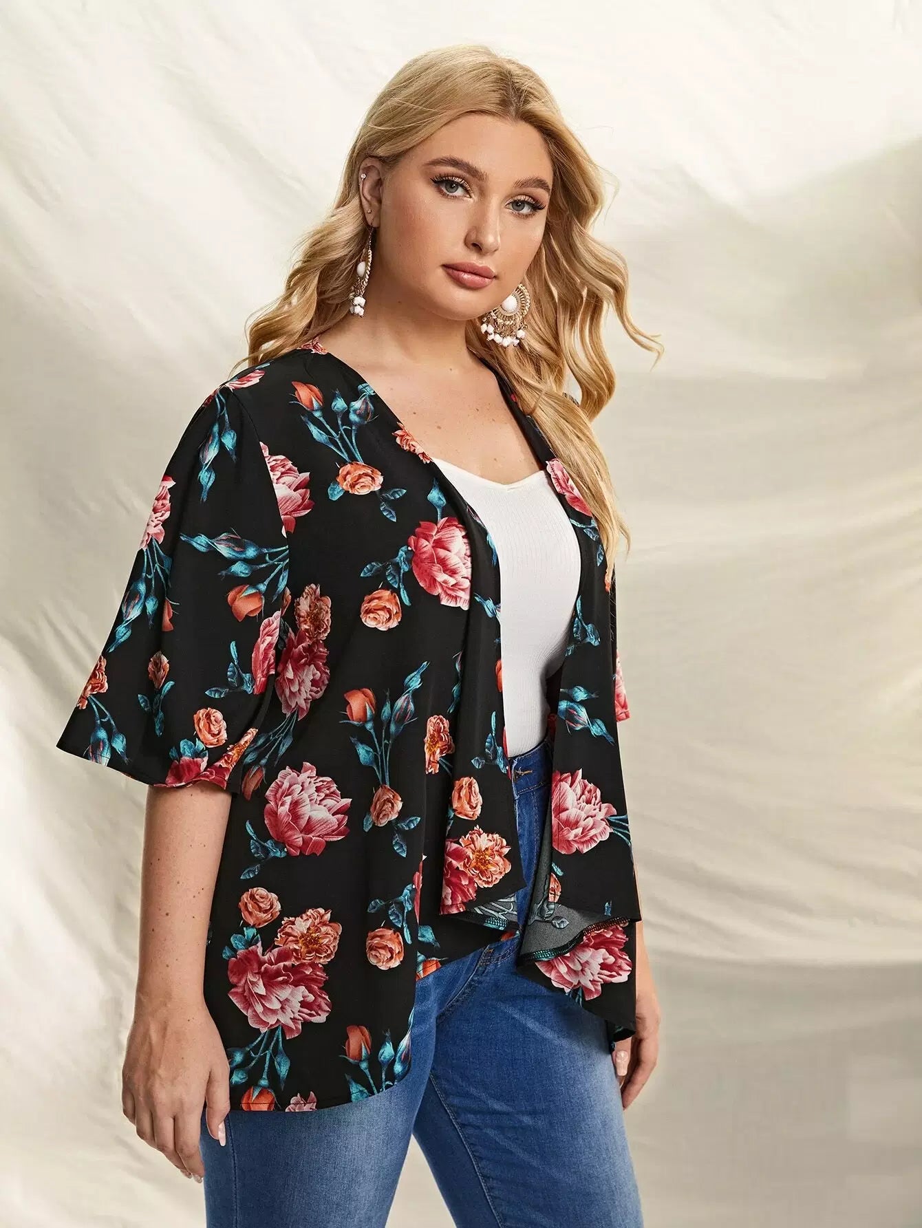 Plus Allover Floral Open Front Kimono