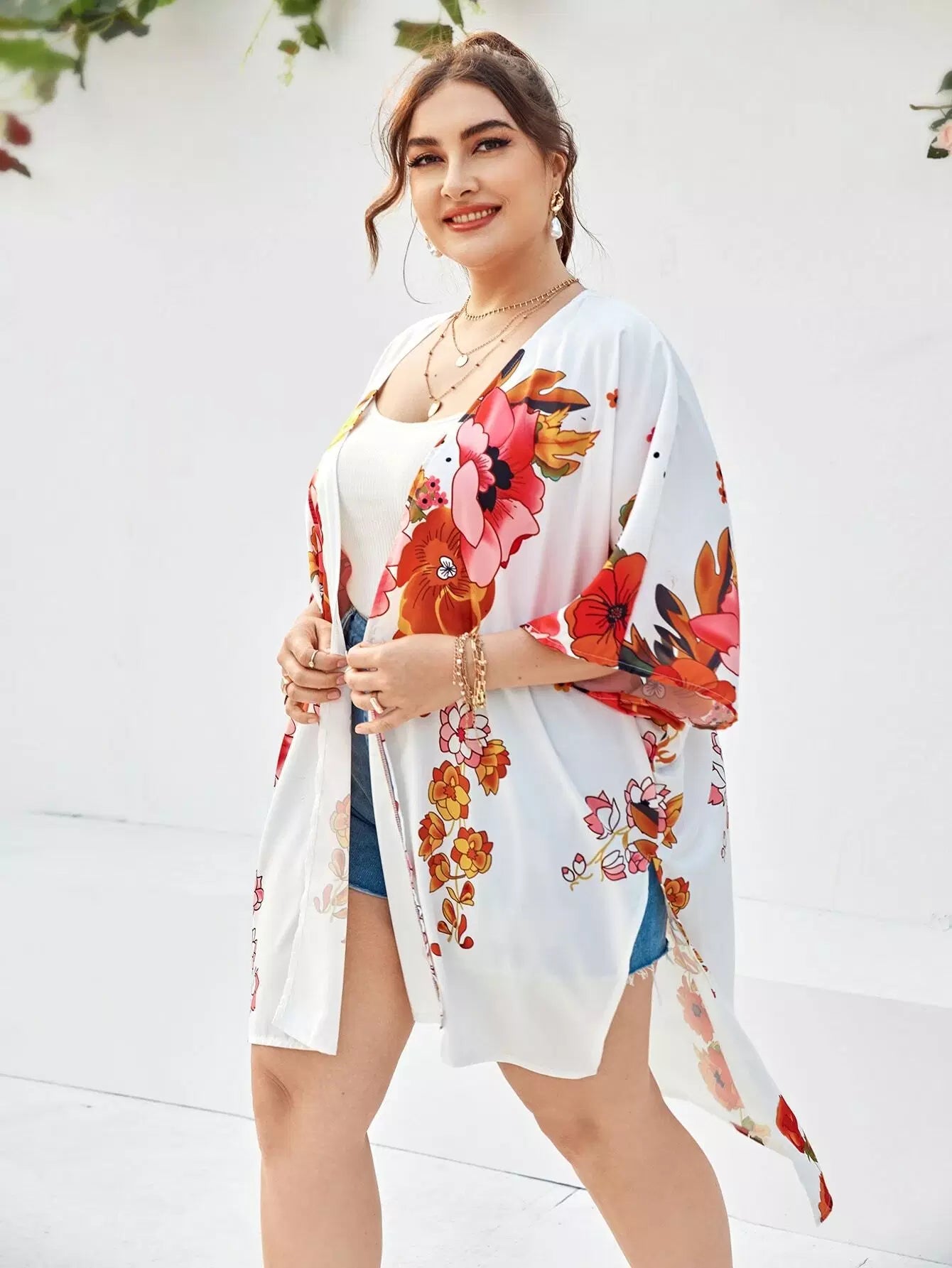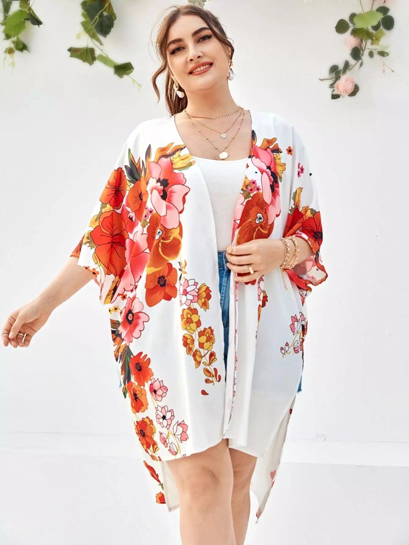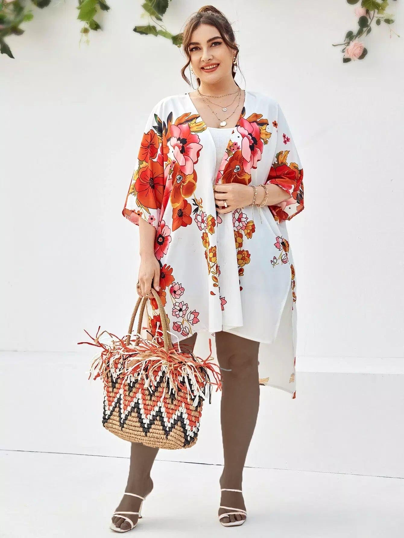 Plus Floral Print High Low Kimono