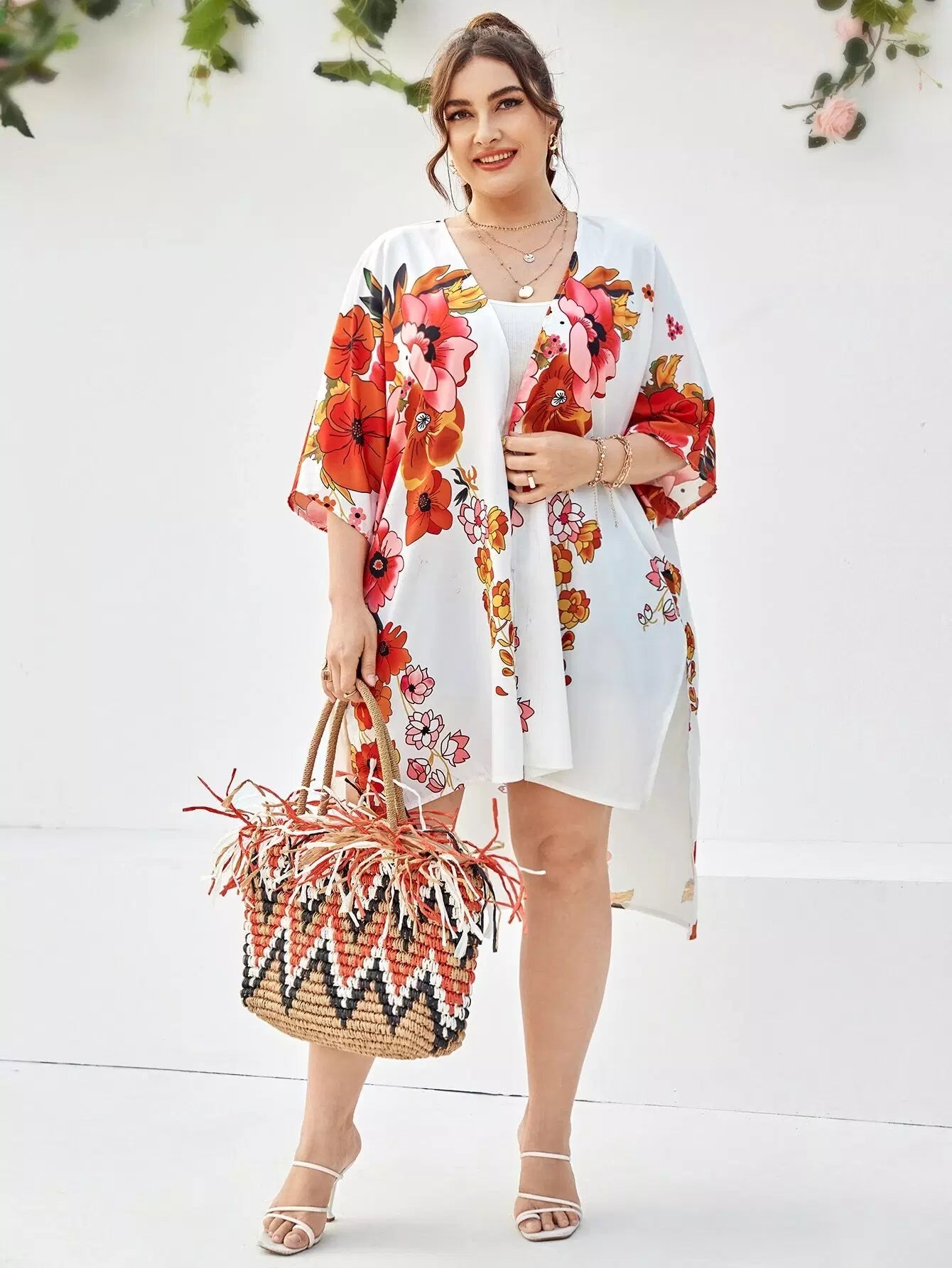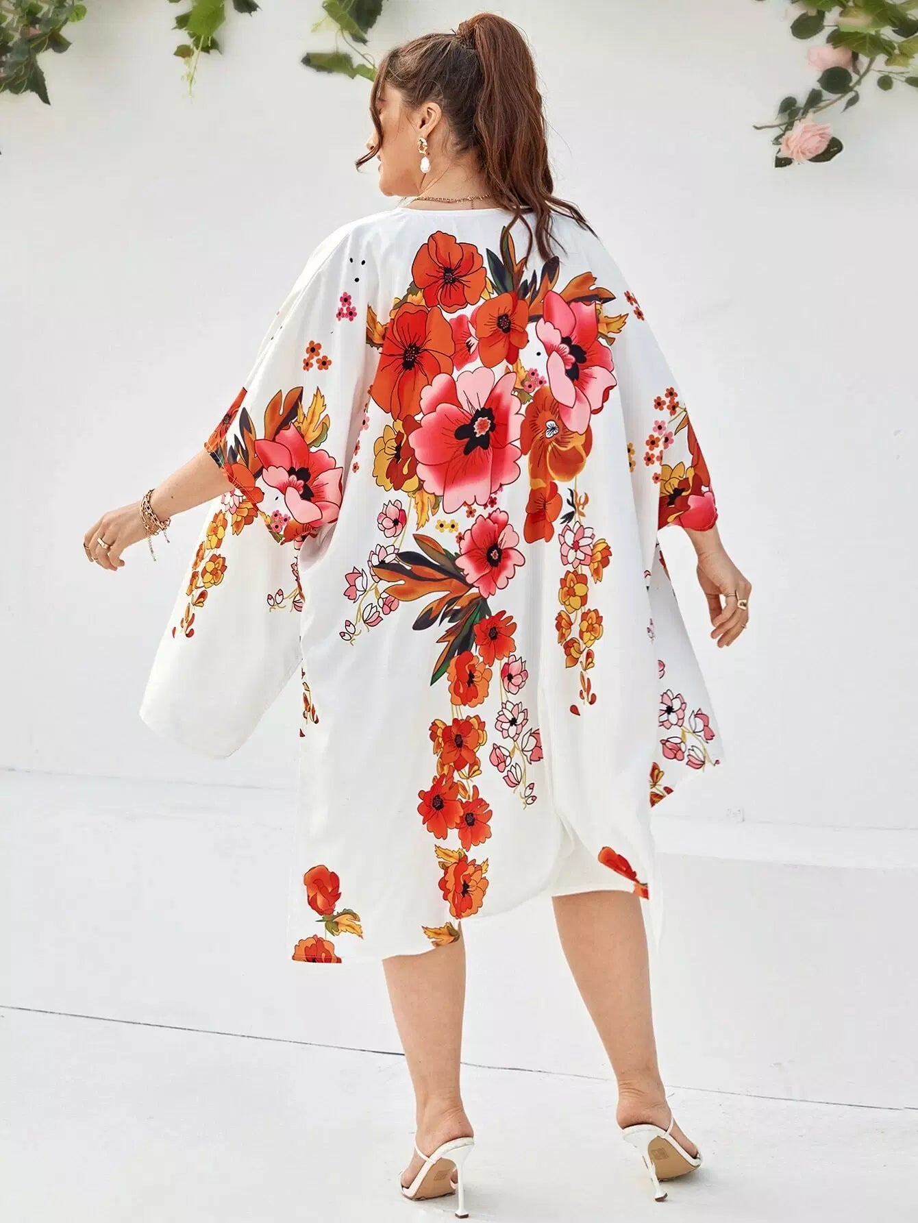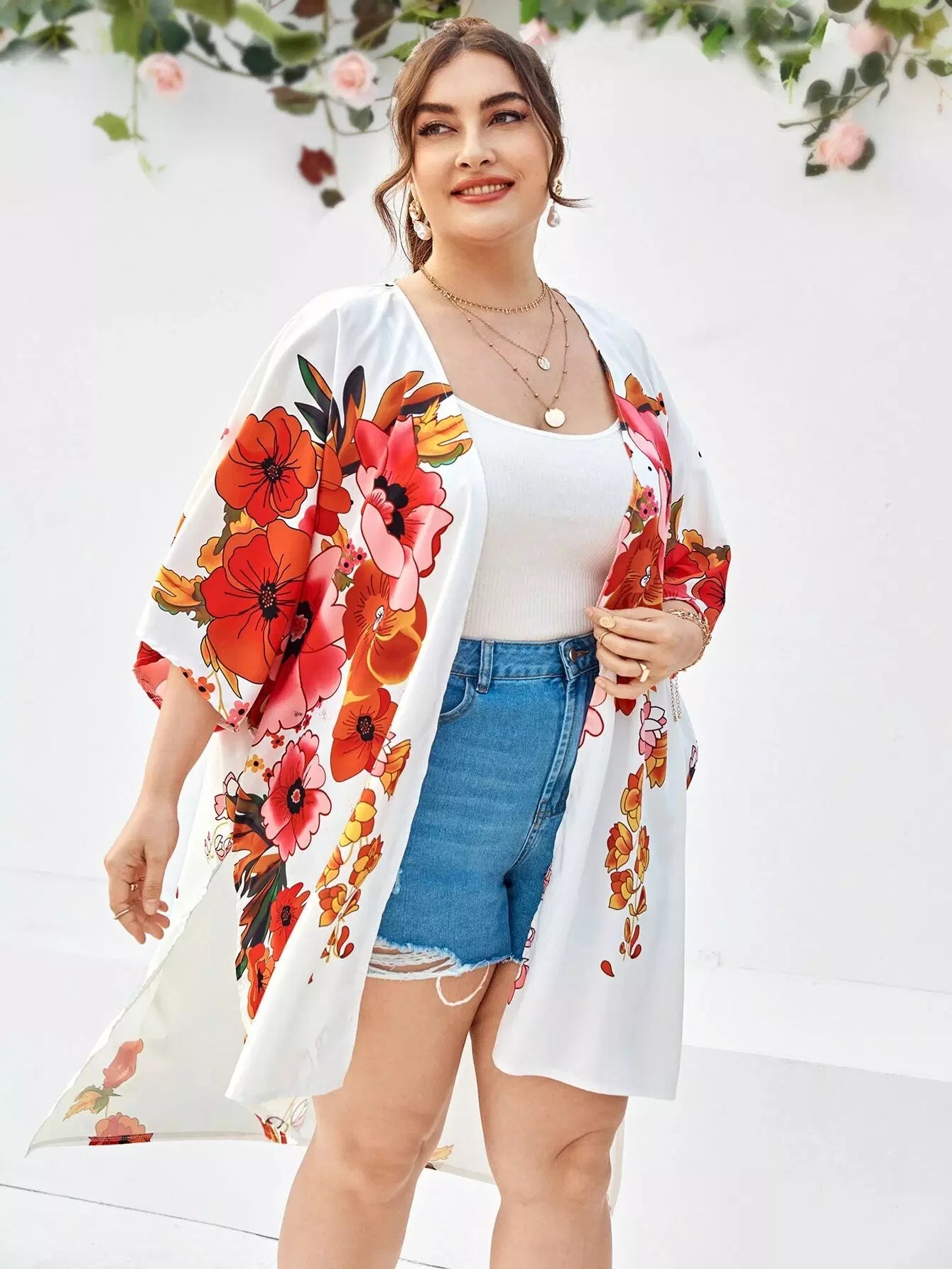 Plus Floral Print High Low Kimono