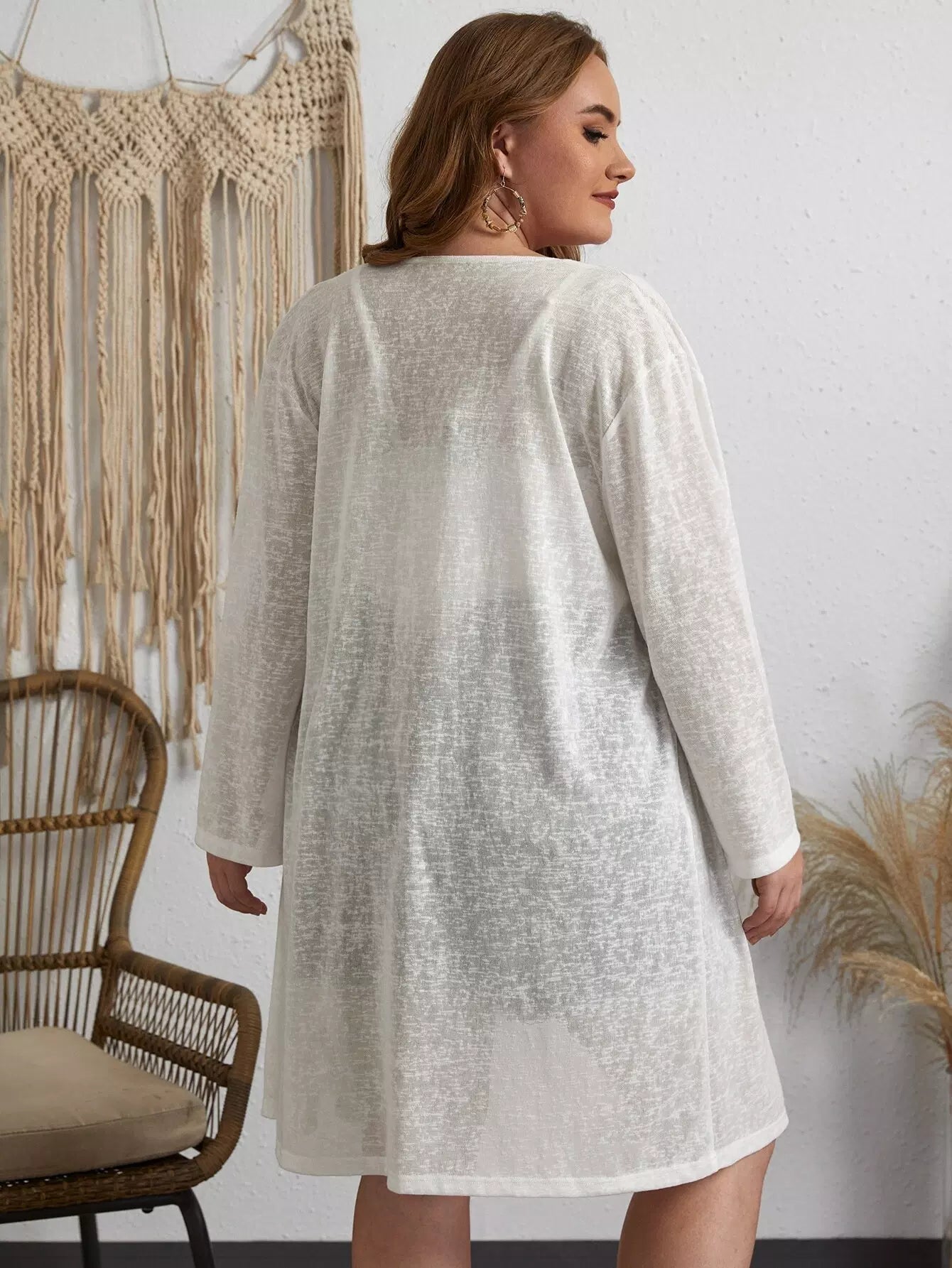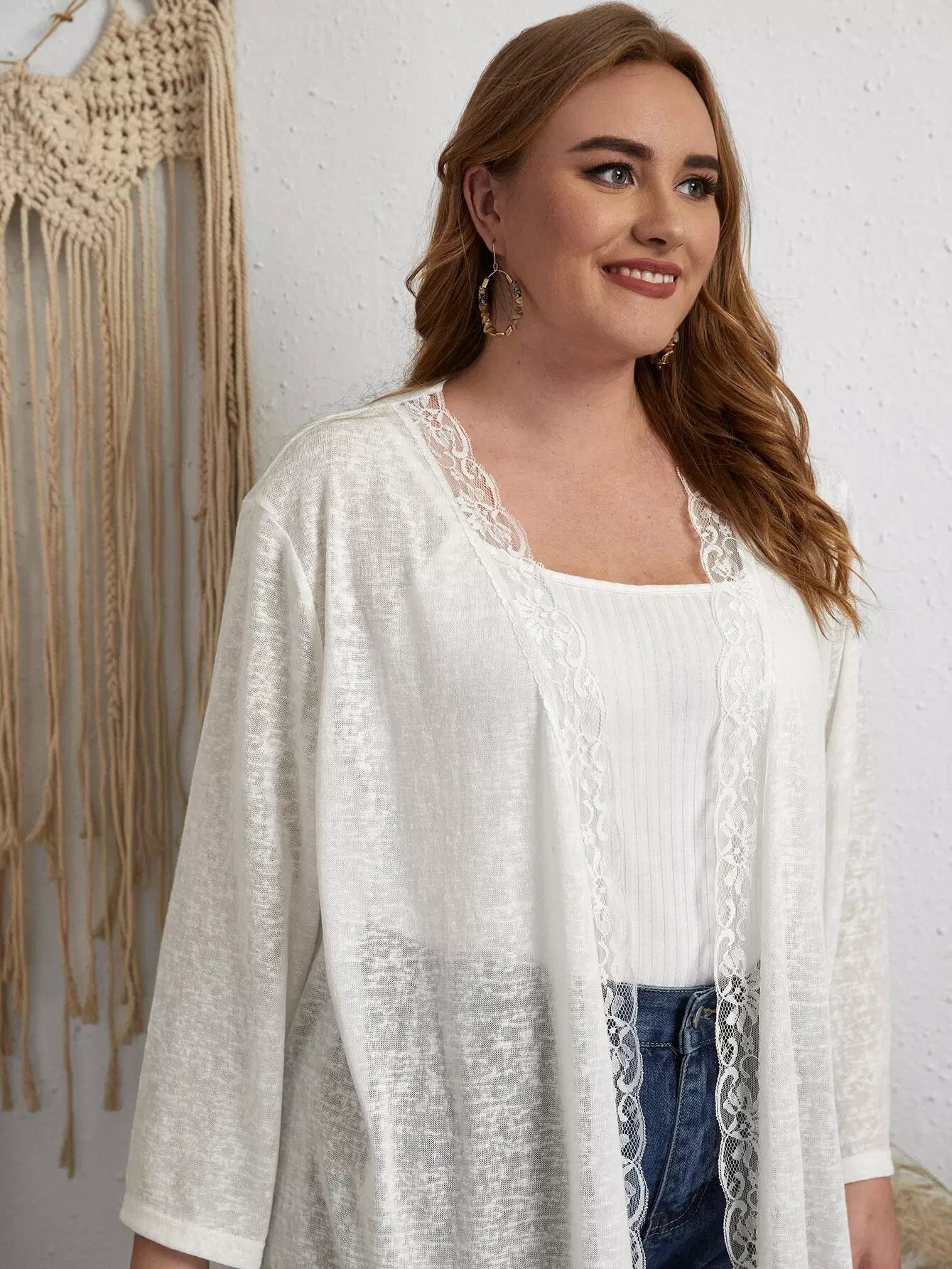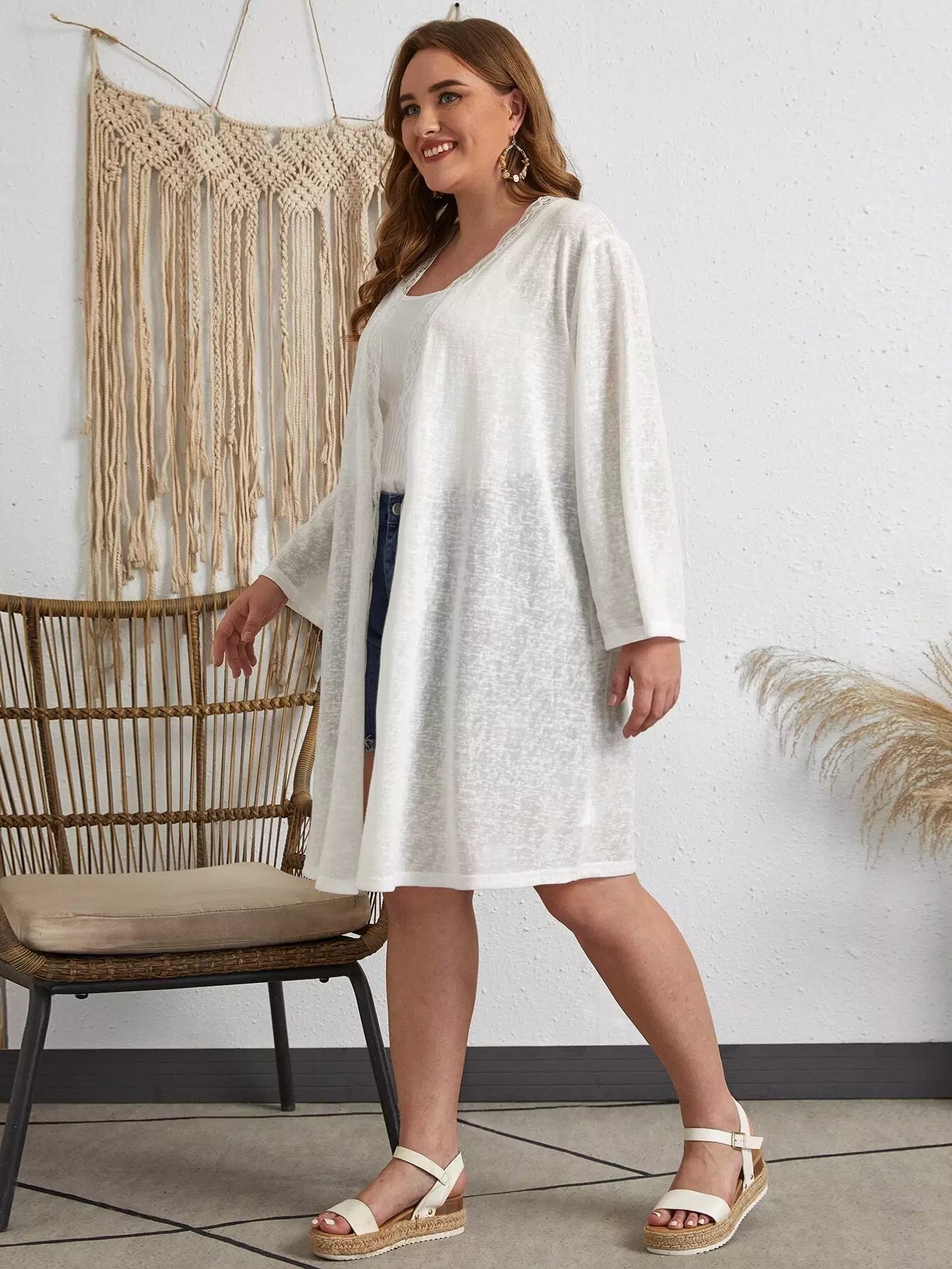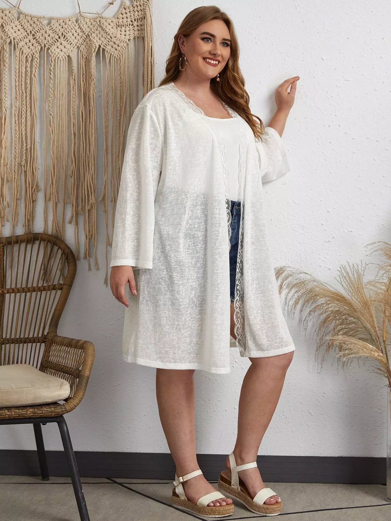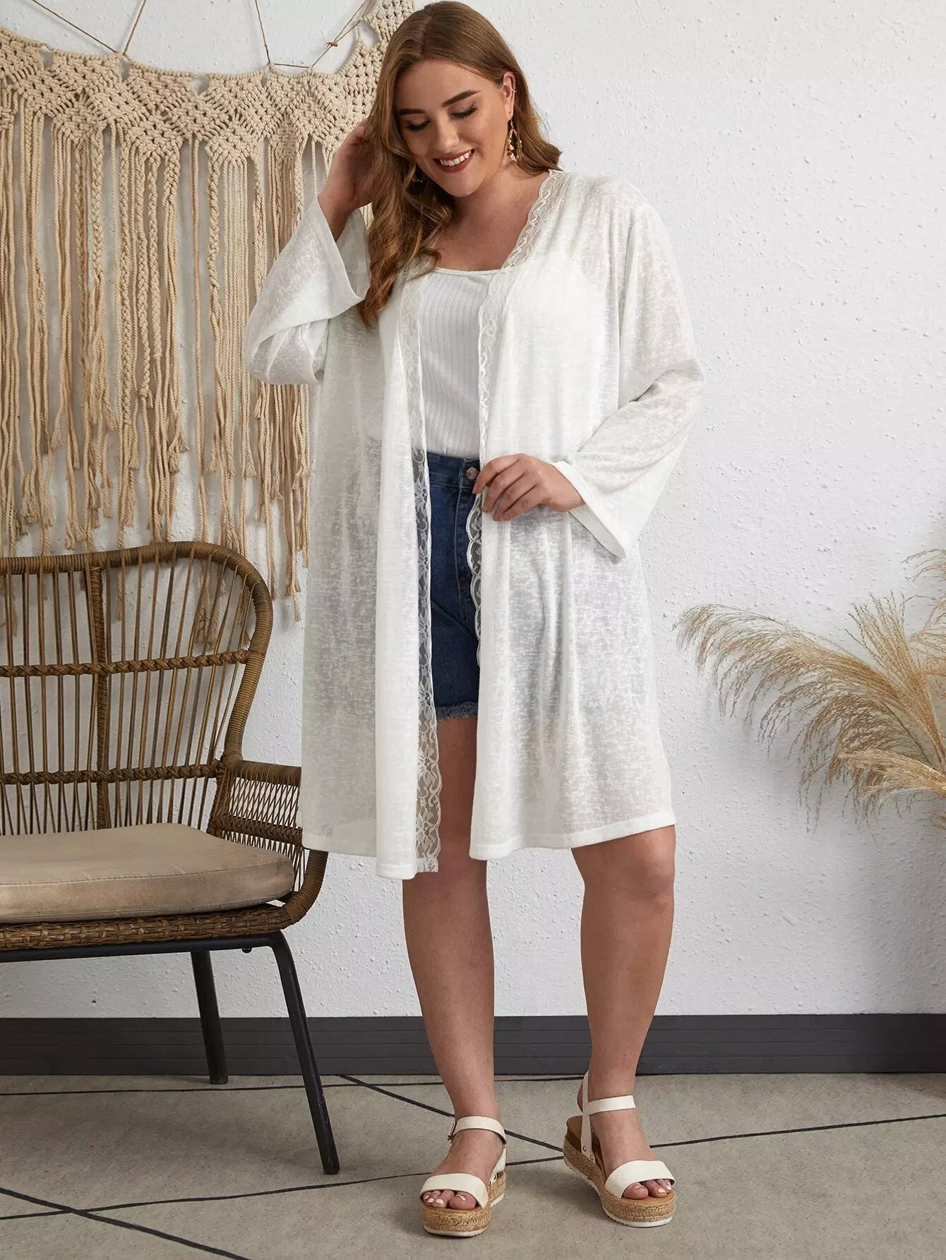 Plus Lace Trim Solid Kimono
