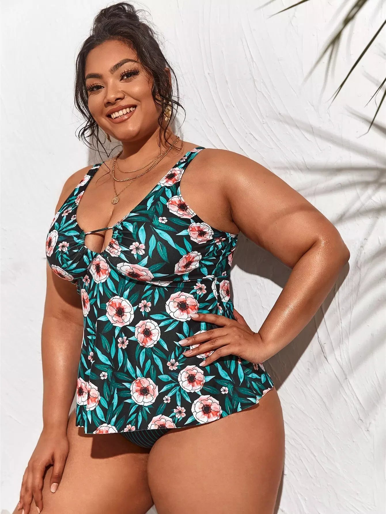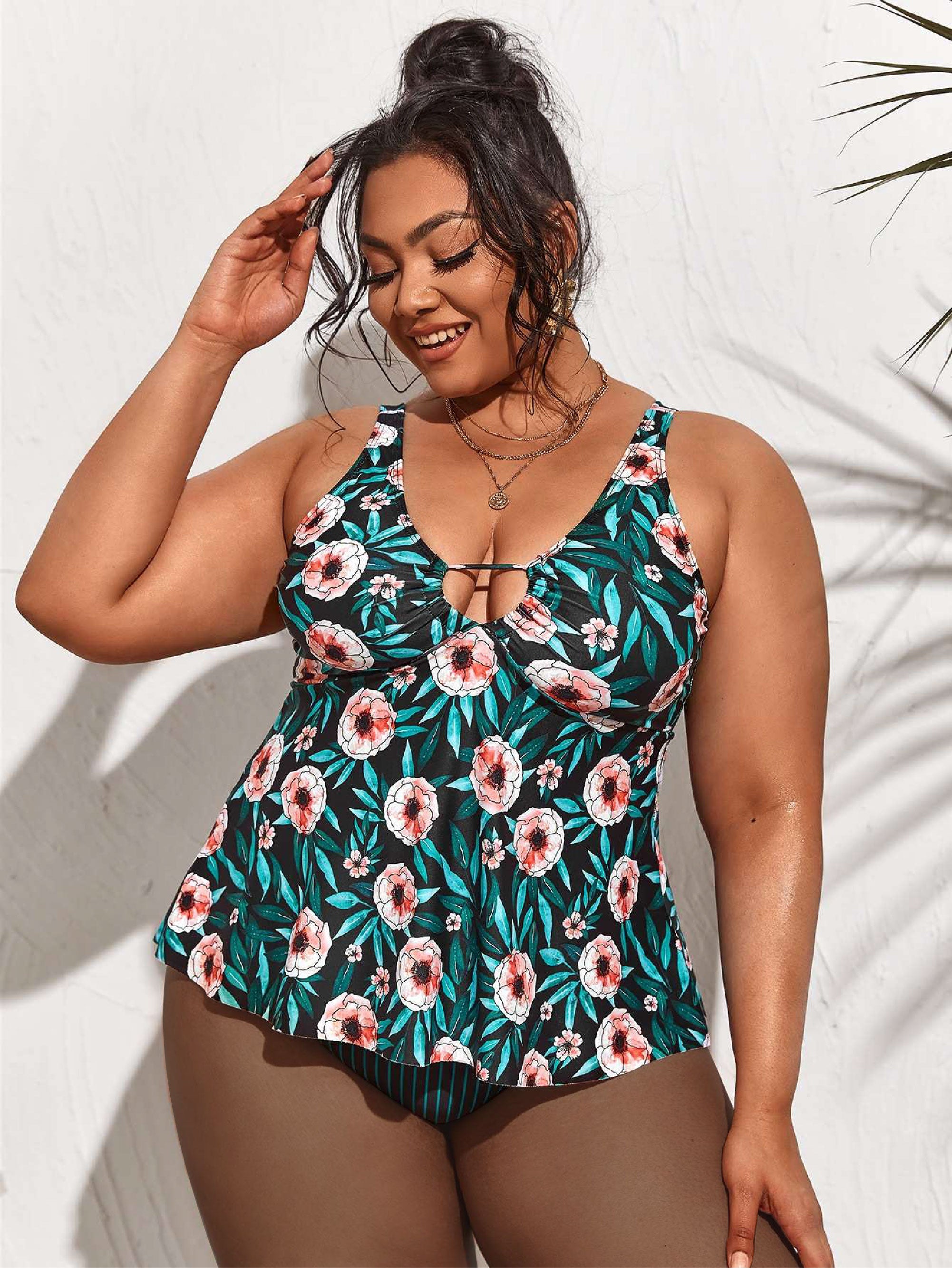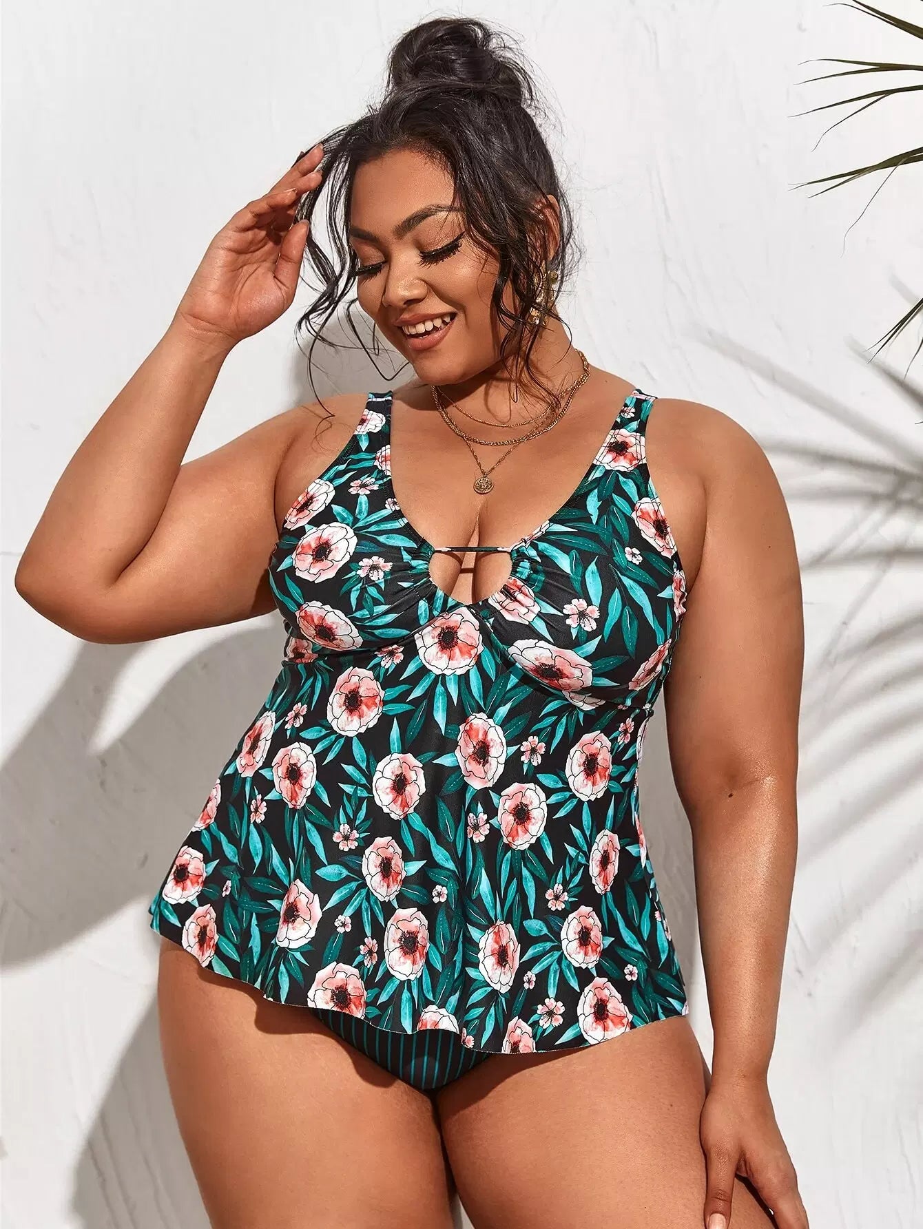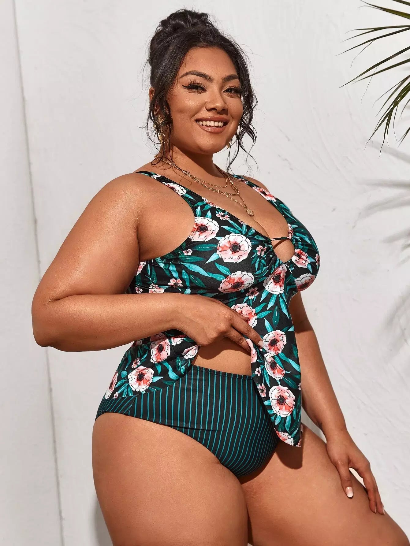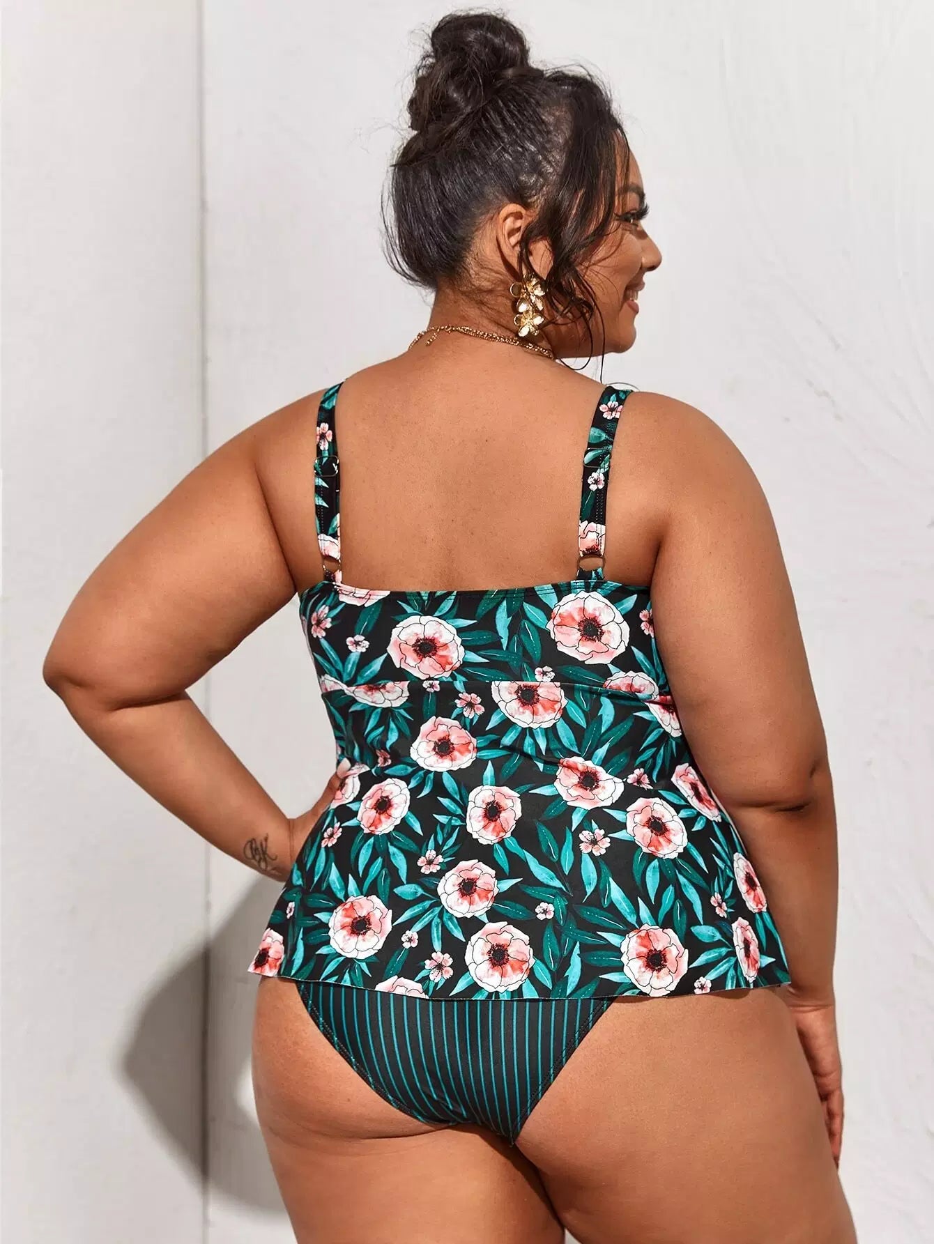 Plus Floral & Striped Ruffle Bikini Swimsuit
