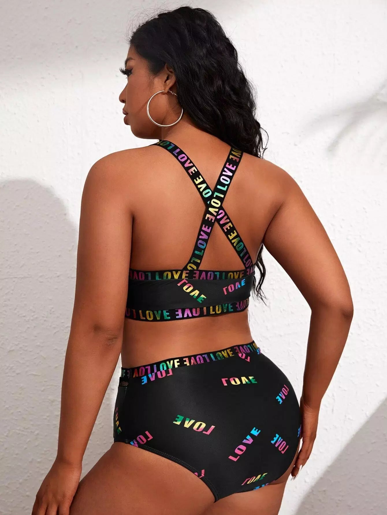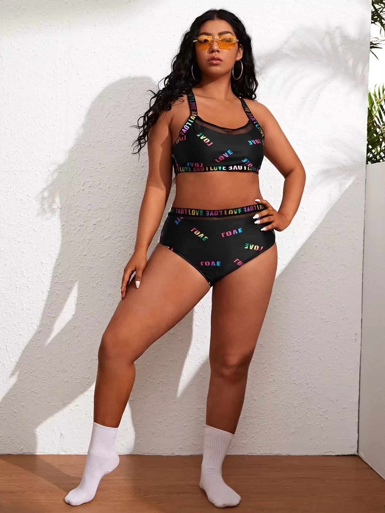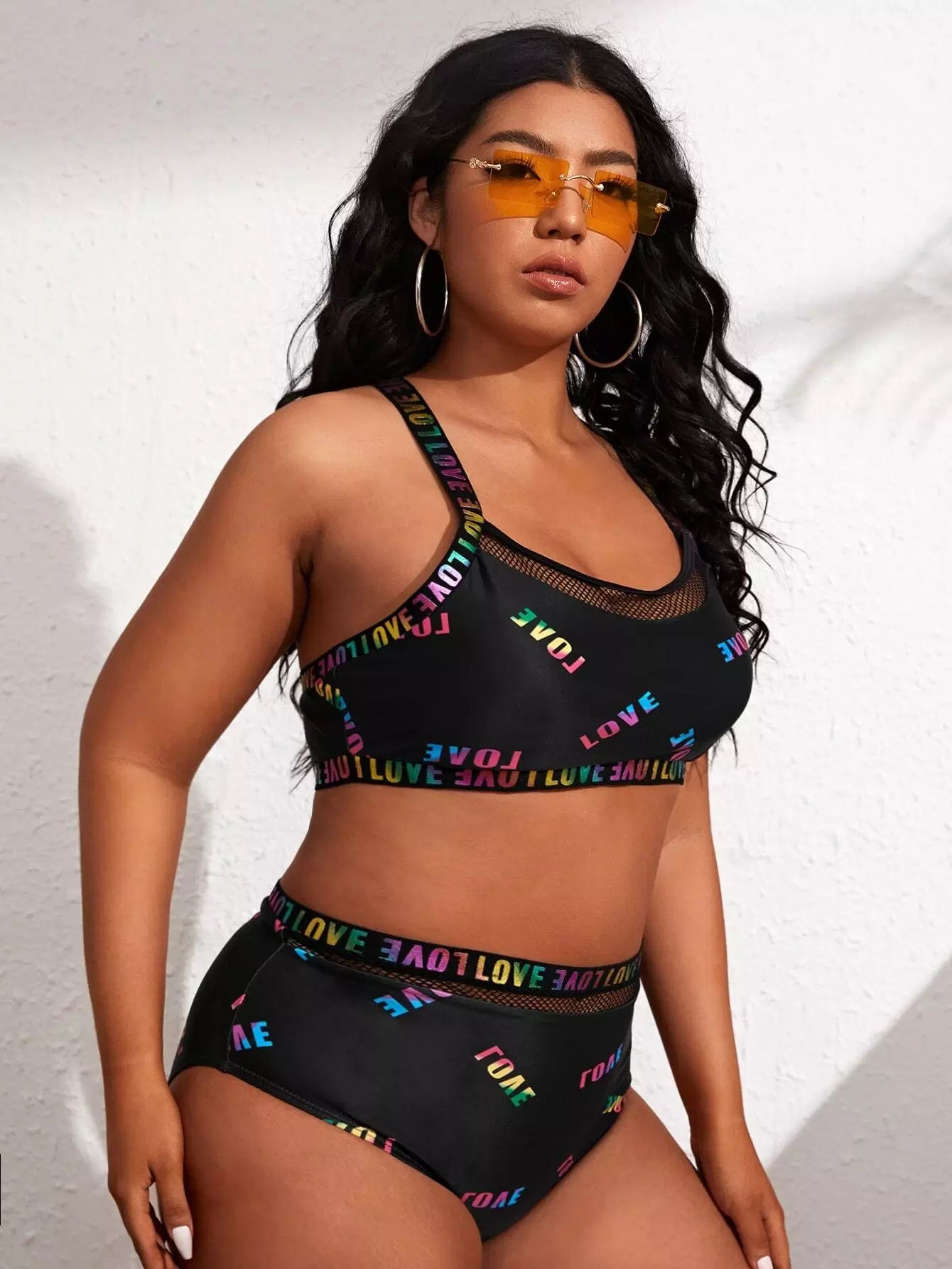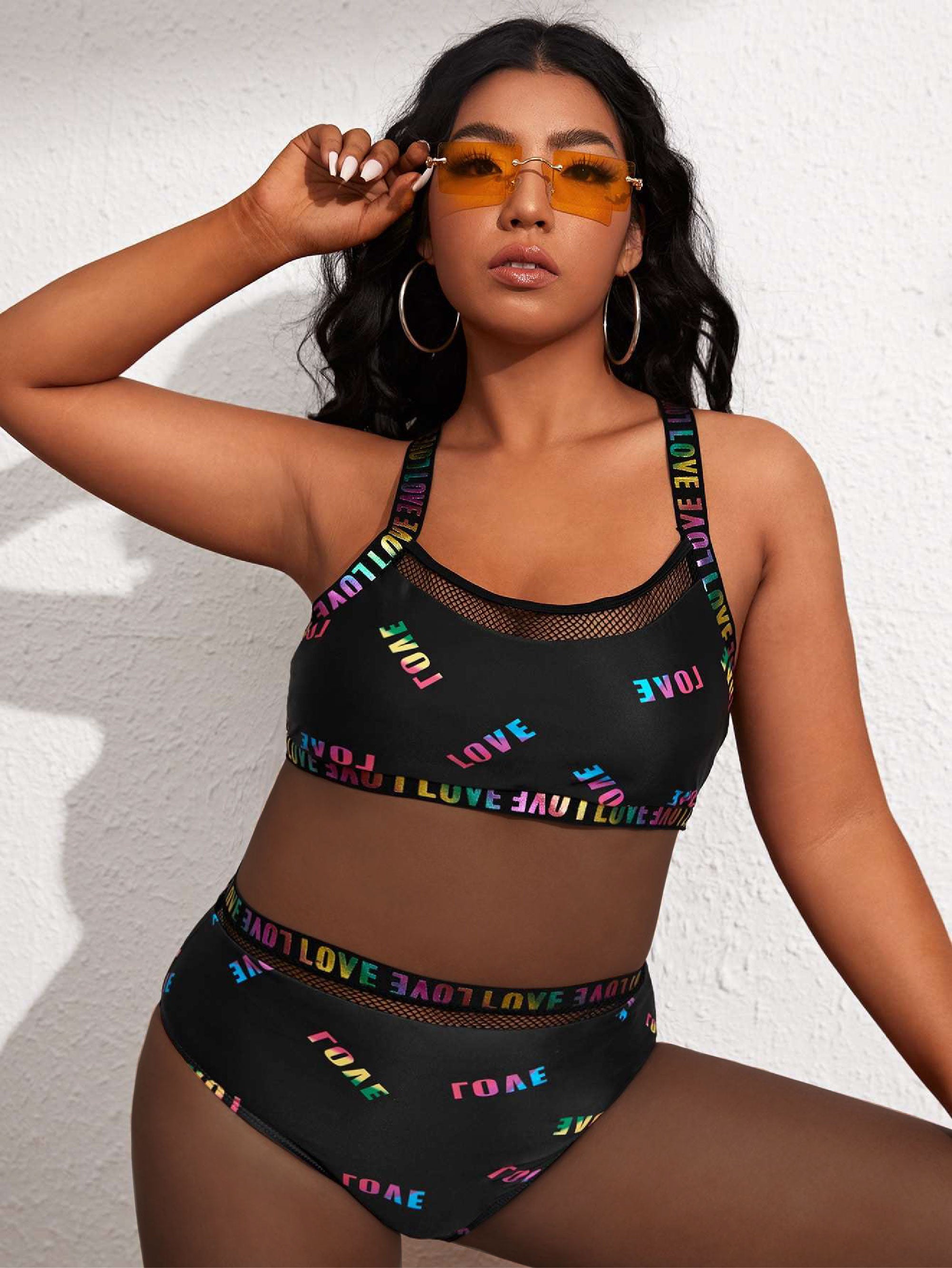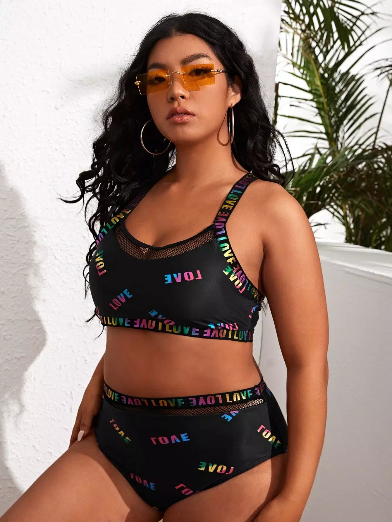 Plus Letter Graphic Contrast Fishnet Bikini Swimsuit