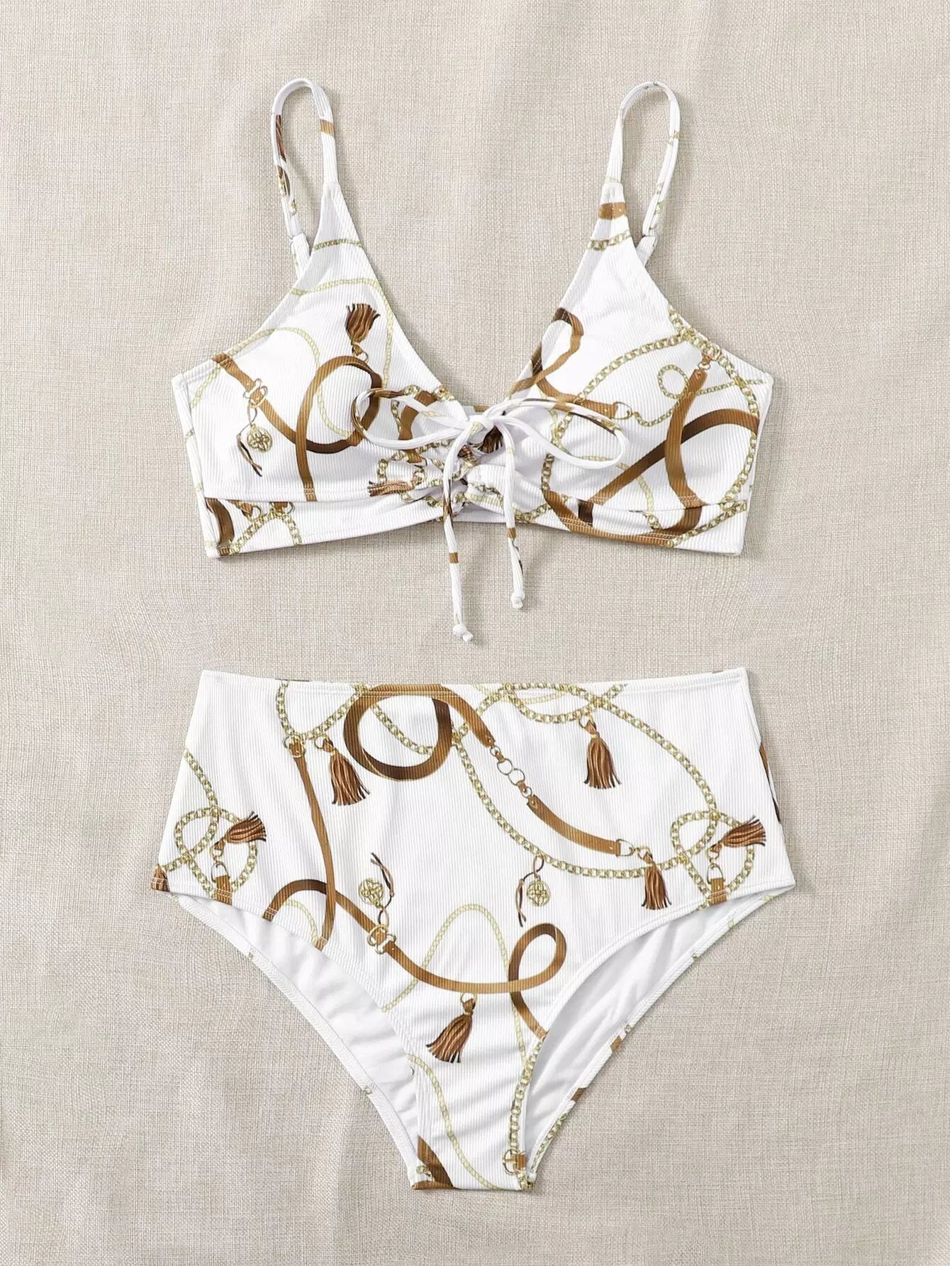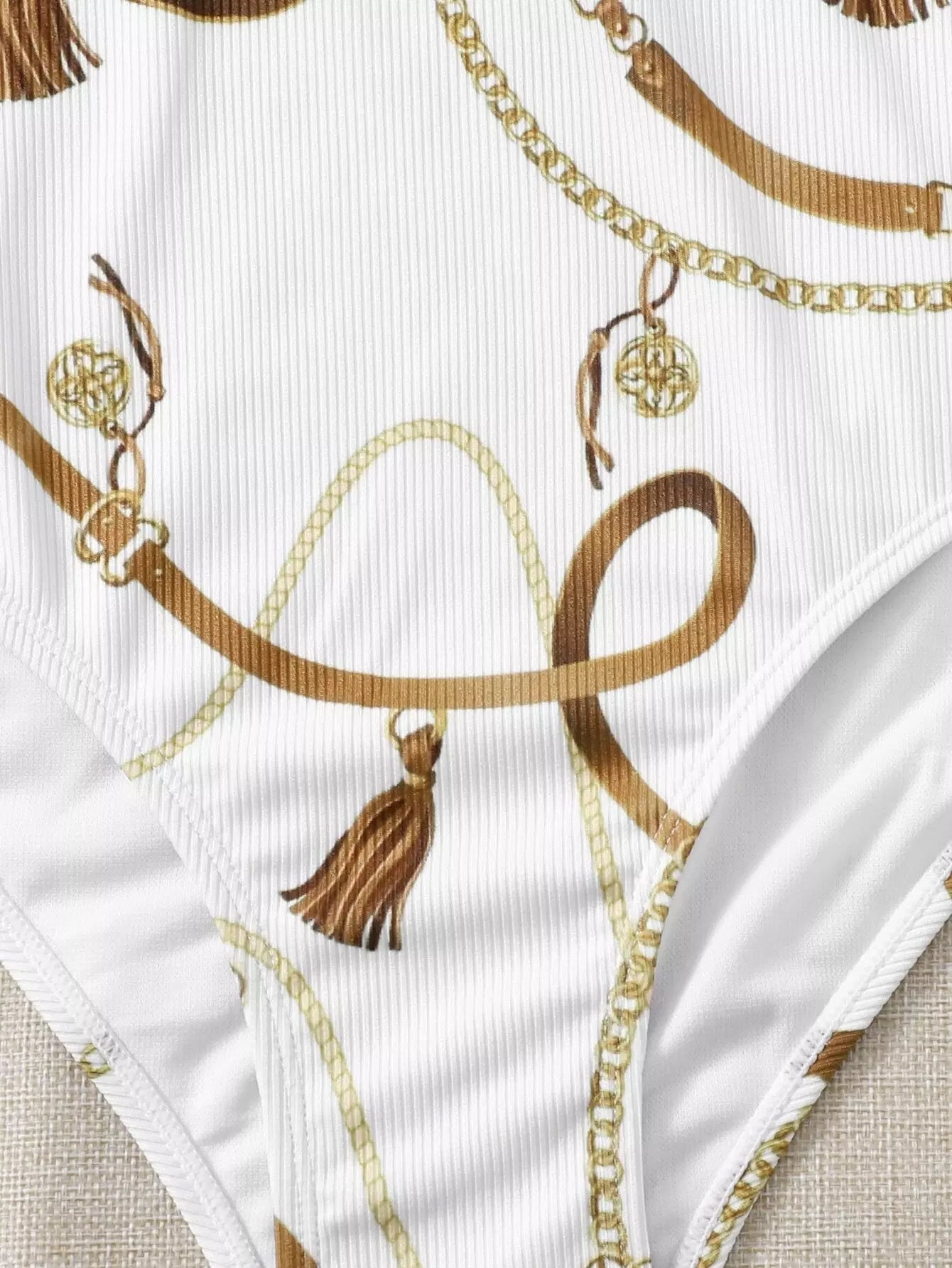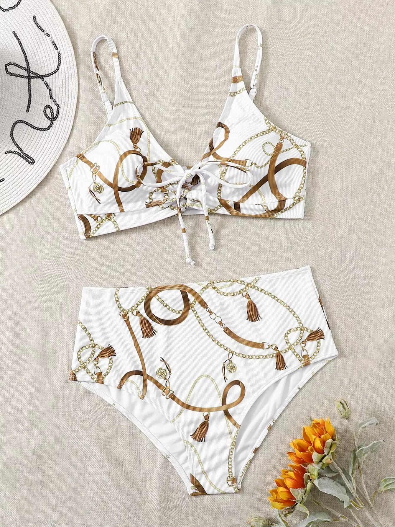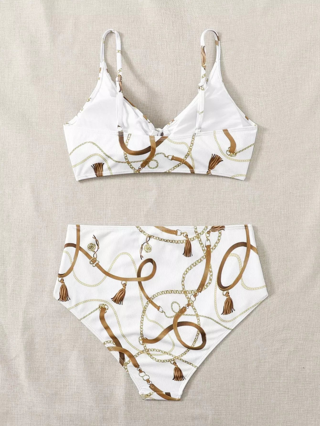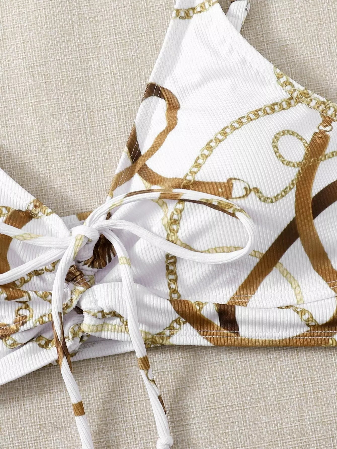 Plus & Chain Print Rib Bikini Swimsuit Without Belt