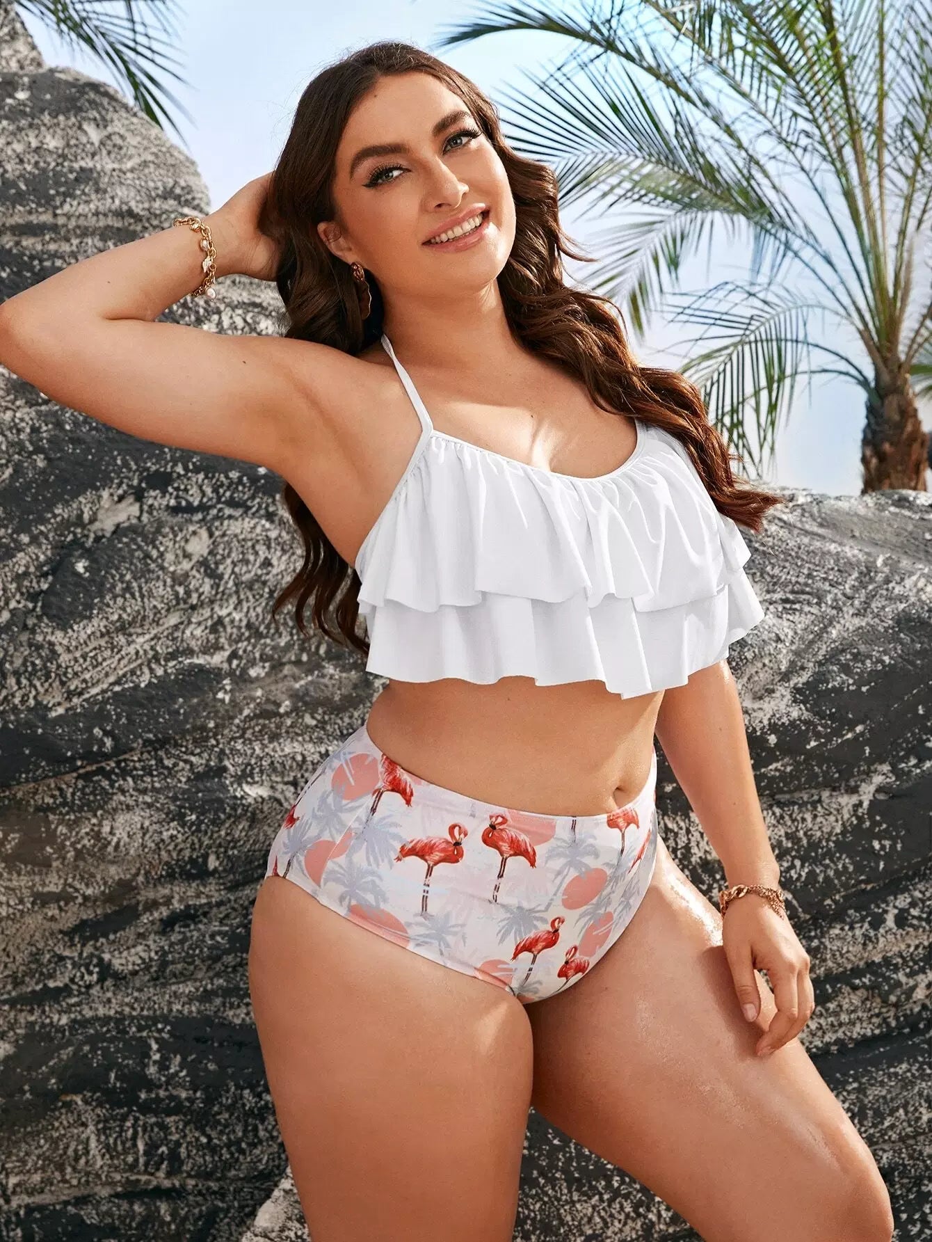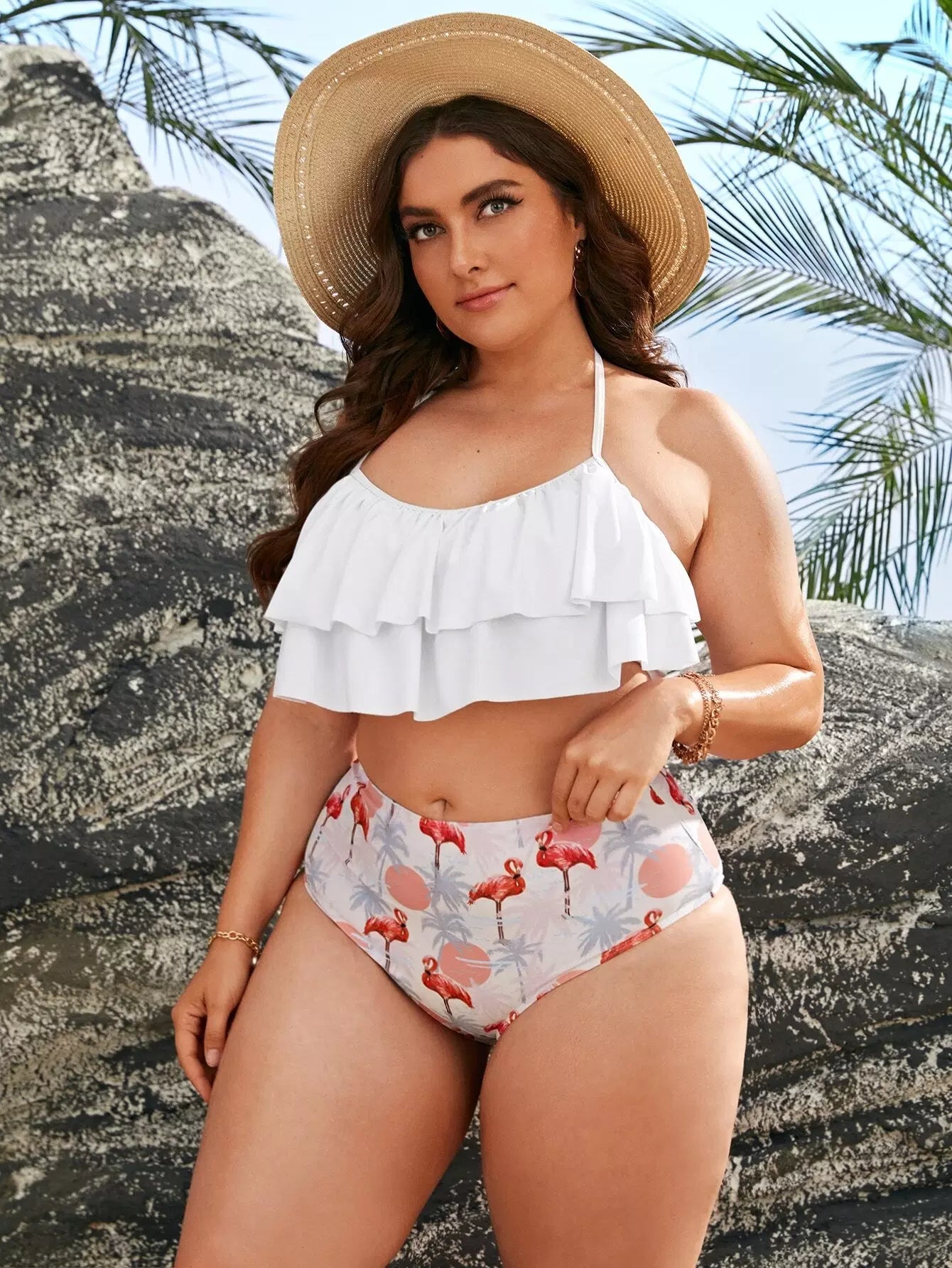Plus Flamingo Print Ruffle Bikini Swimsuit