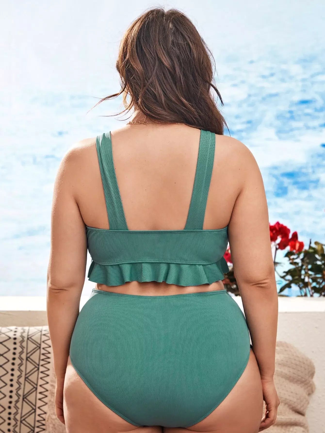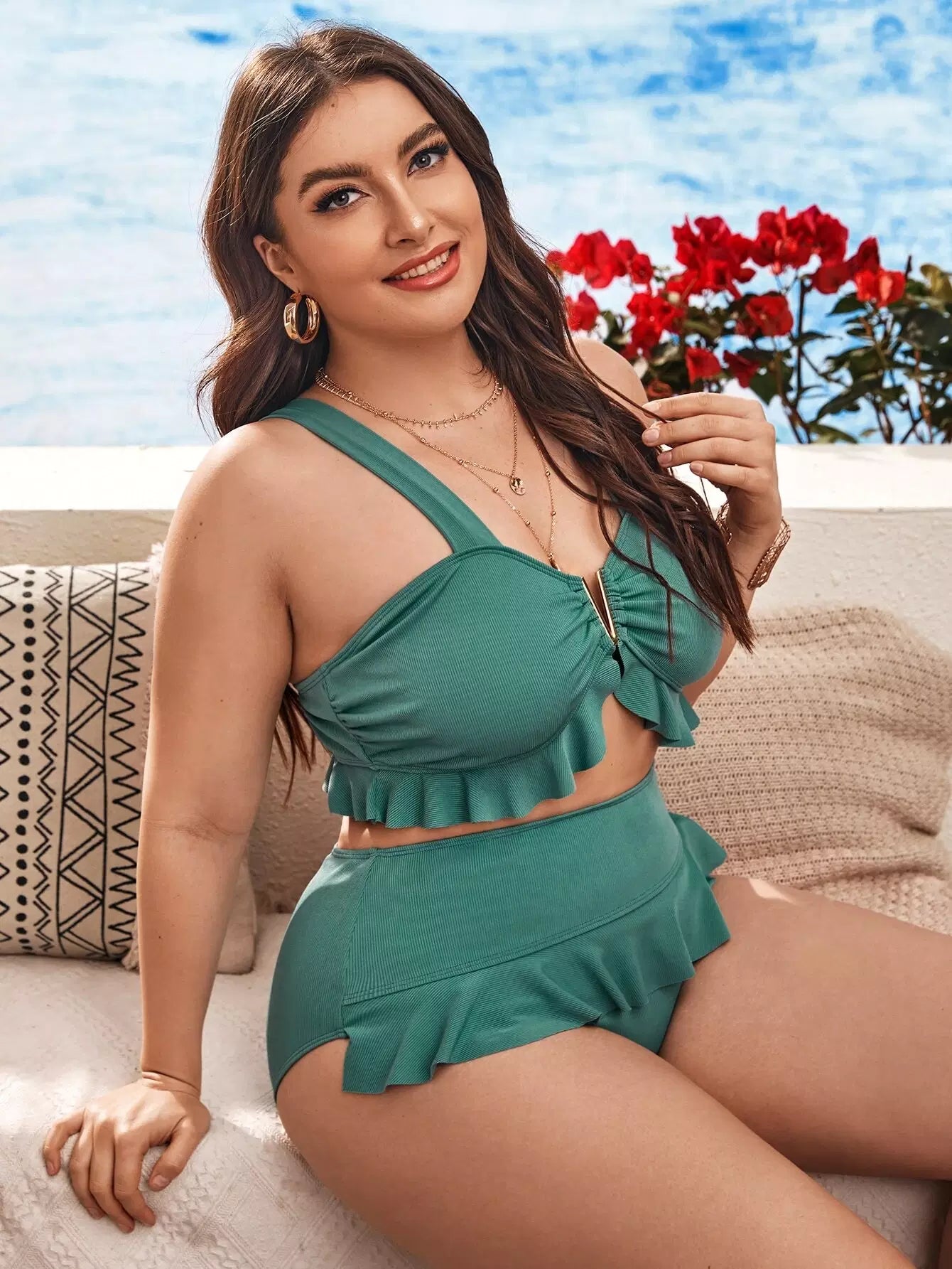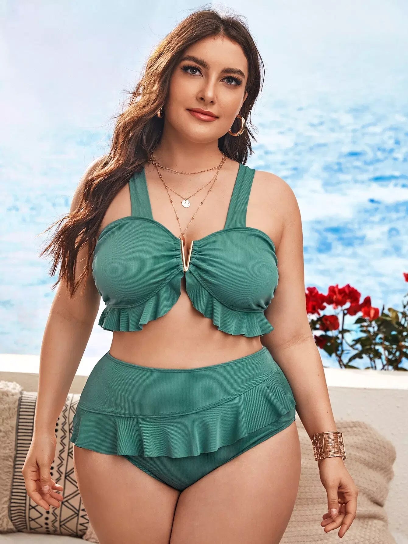 Plus Rib Ruffle Hem V Wired Bikini Swimsuit