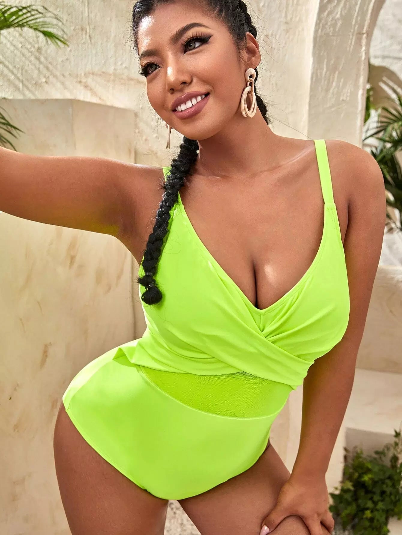 Plus Neon Lime Contrast Mesh One Piece Swimsuit