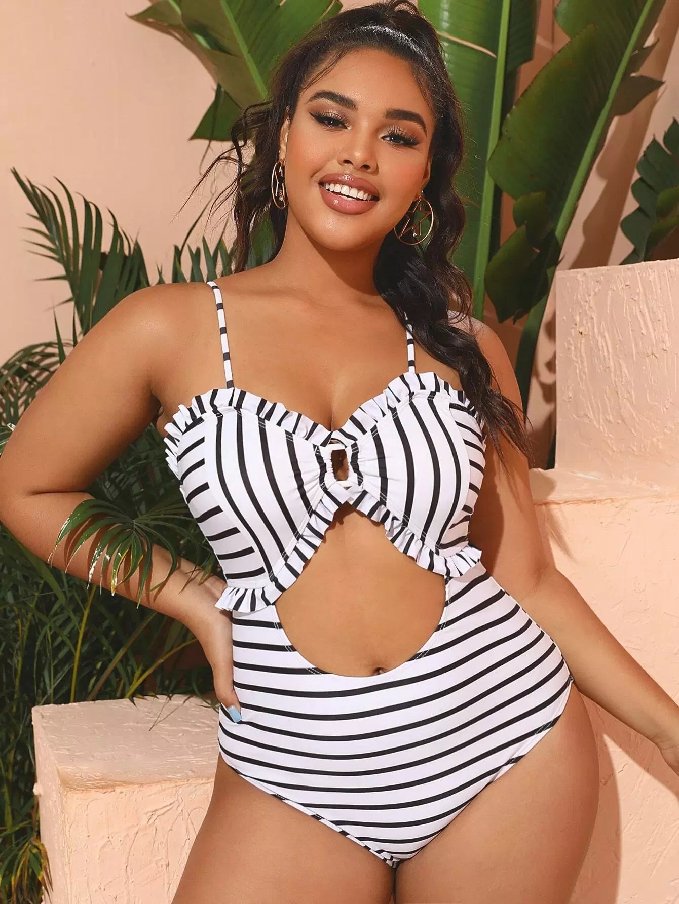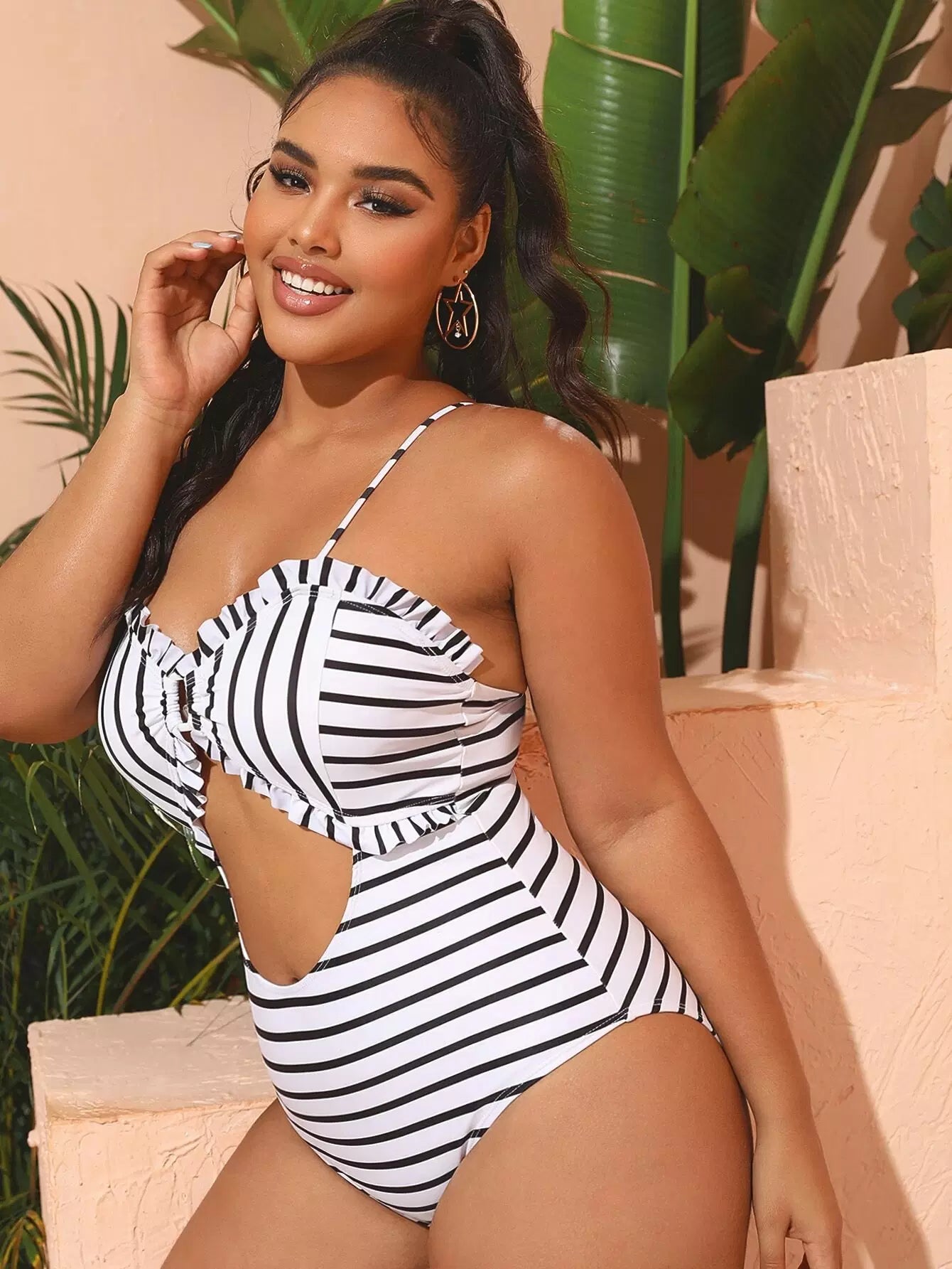 Plus Striped Cut-out Frill One Piece Swimsuit