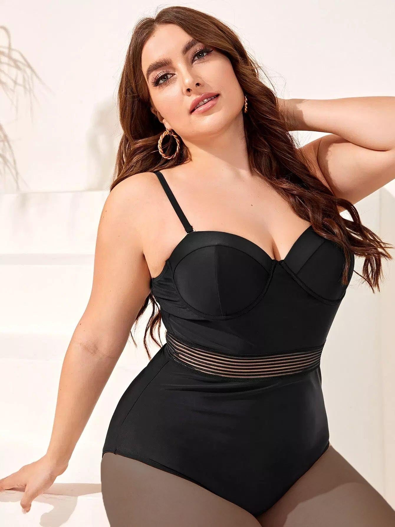 Plus Striped Mesh Underwire One Piece Swimsuit