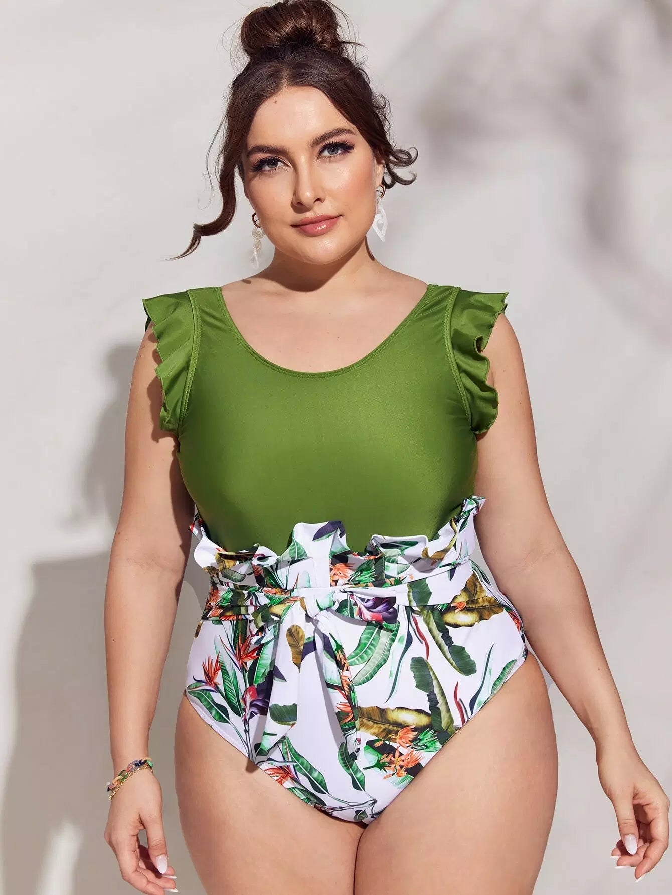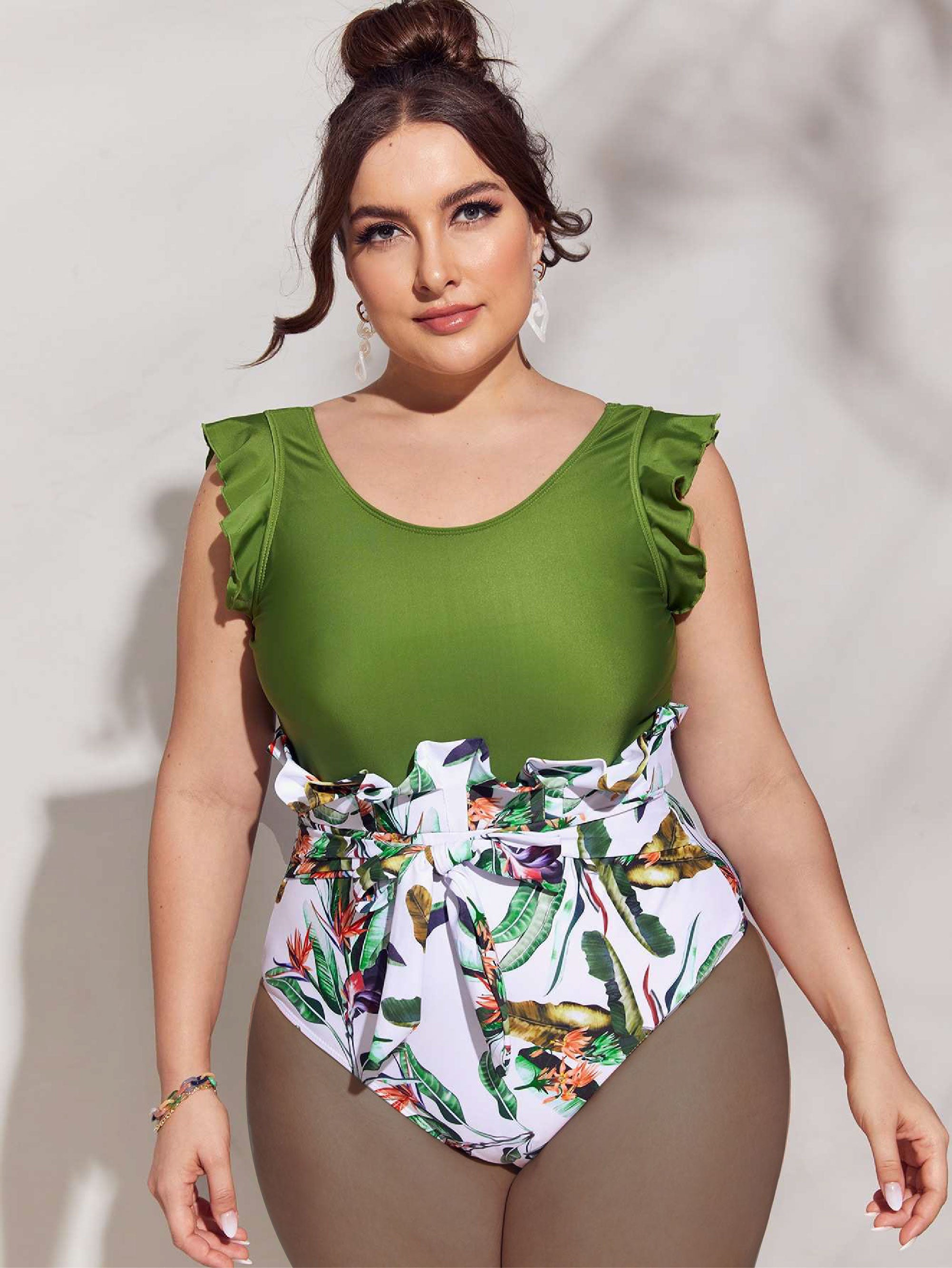 Plus Tropical Ruffle Trim One Piece Swimsuit