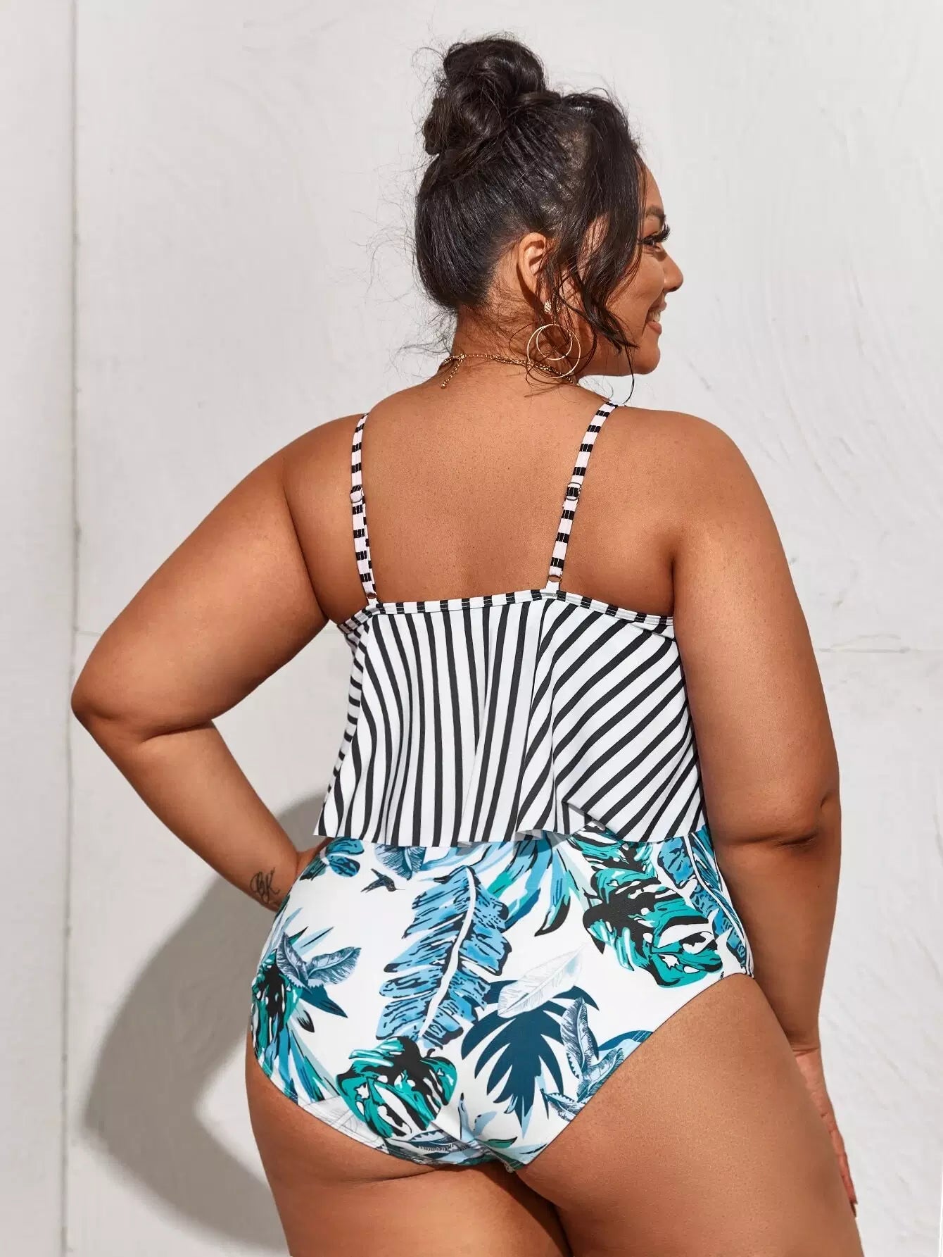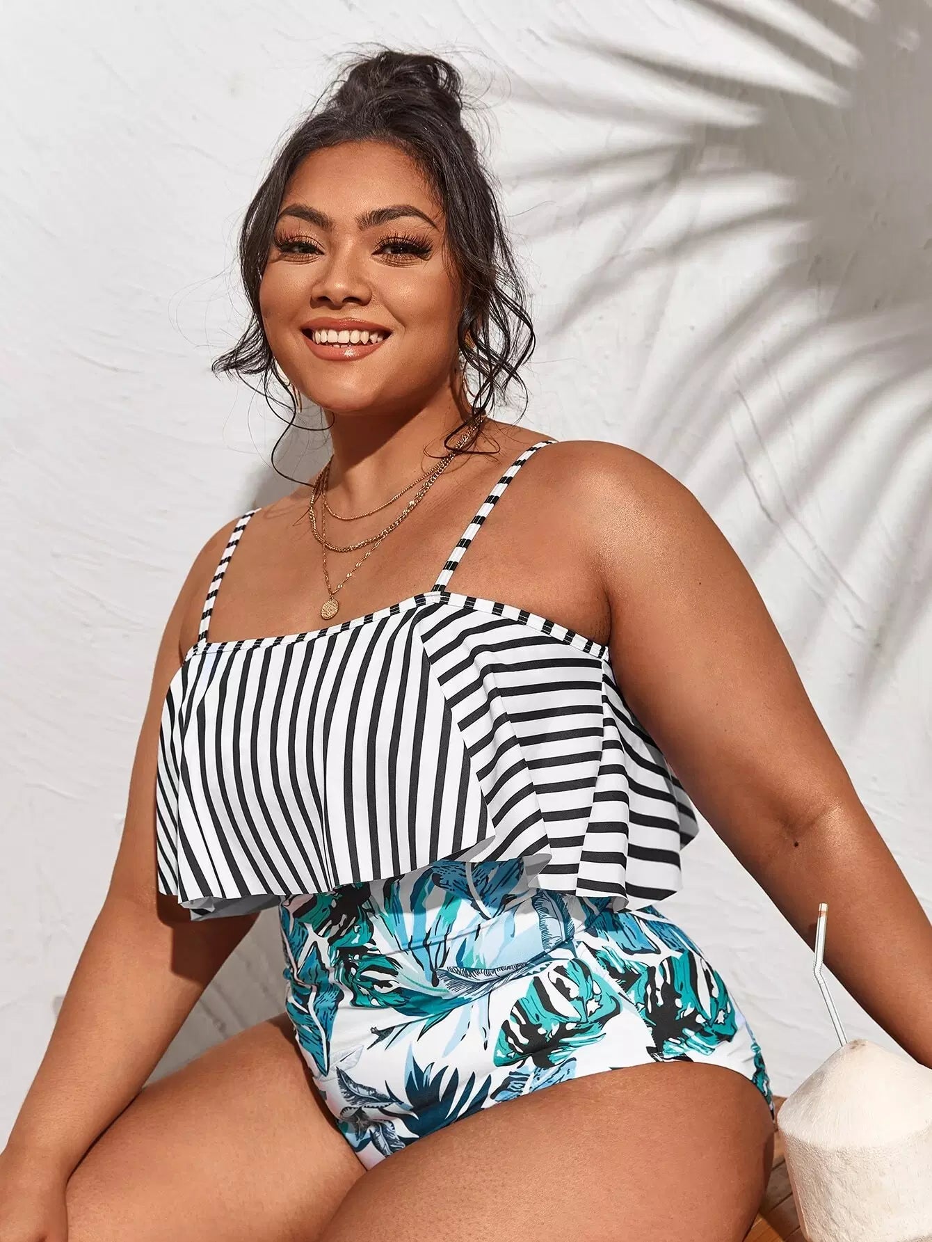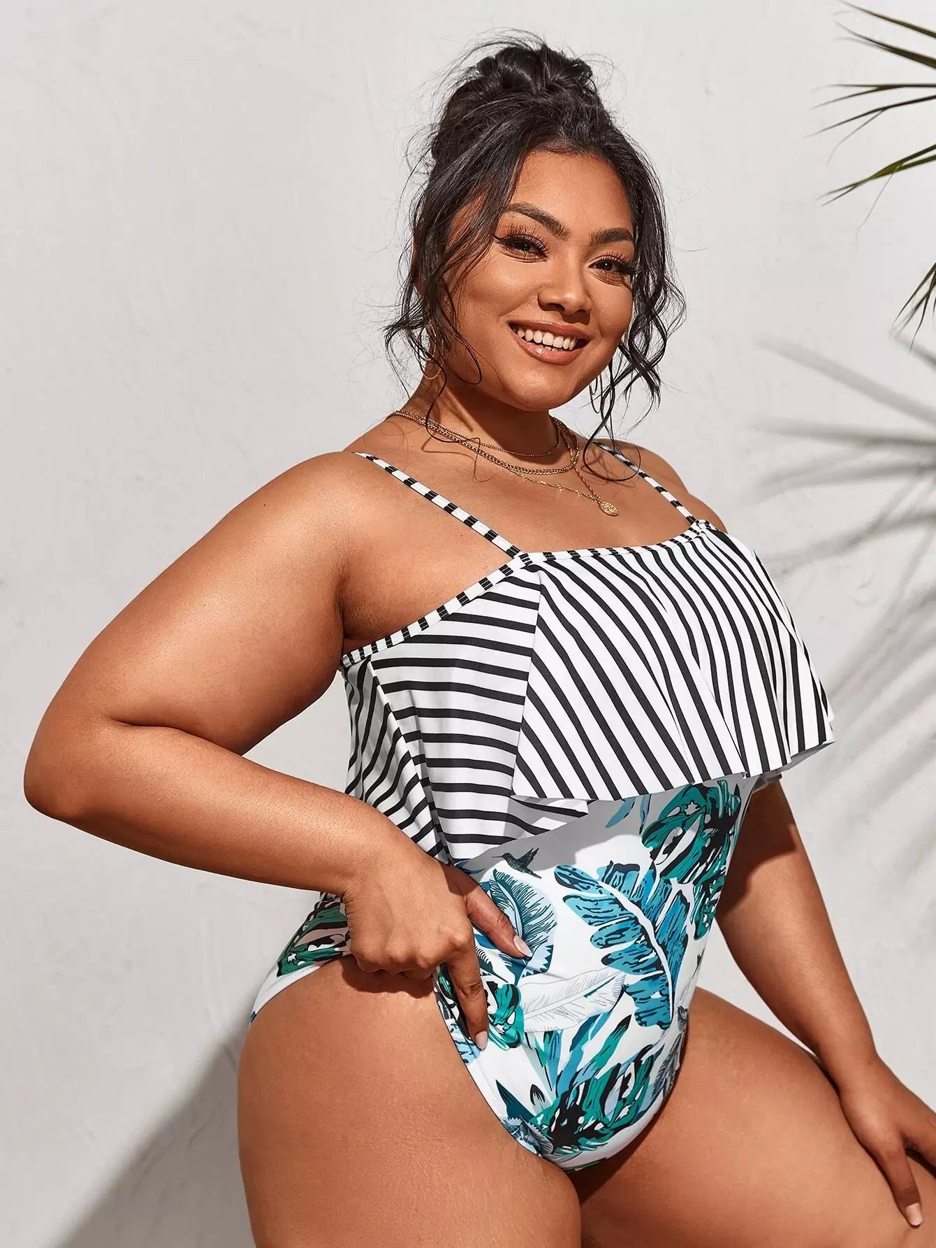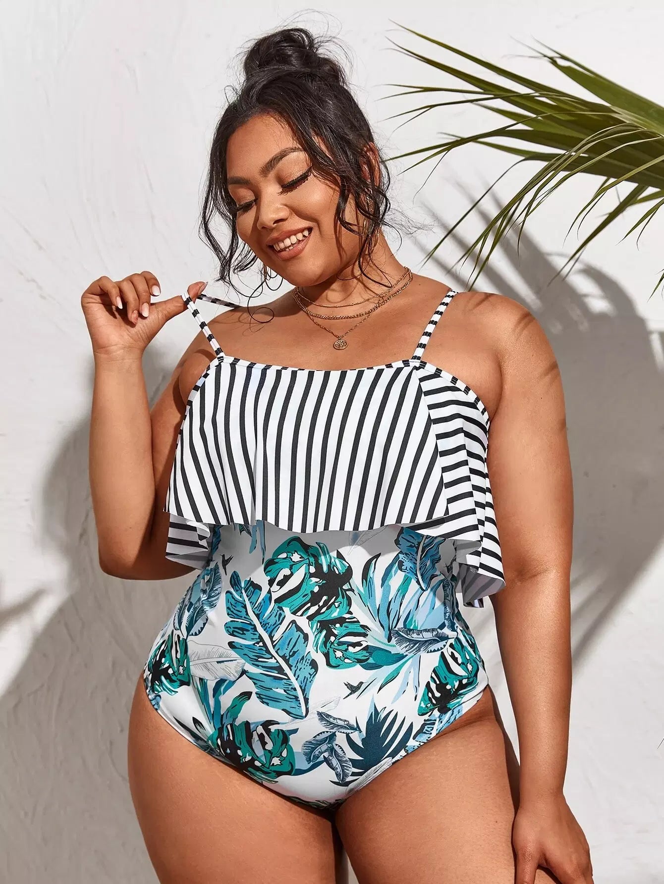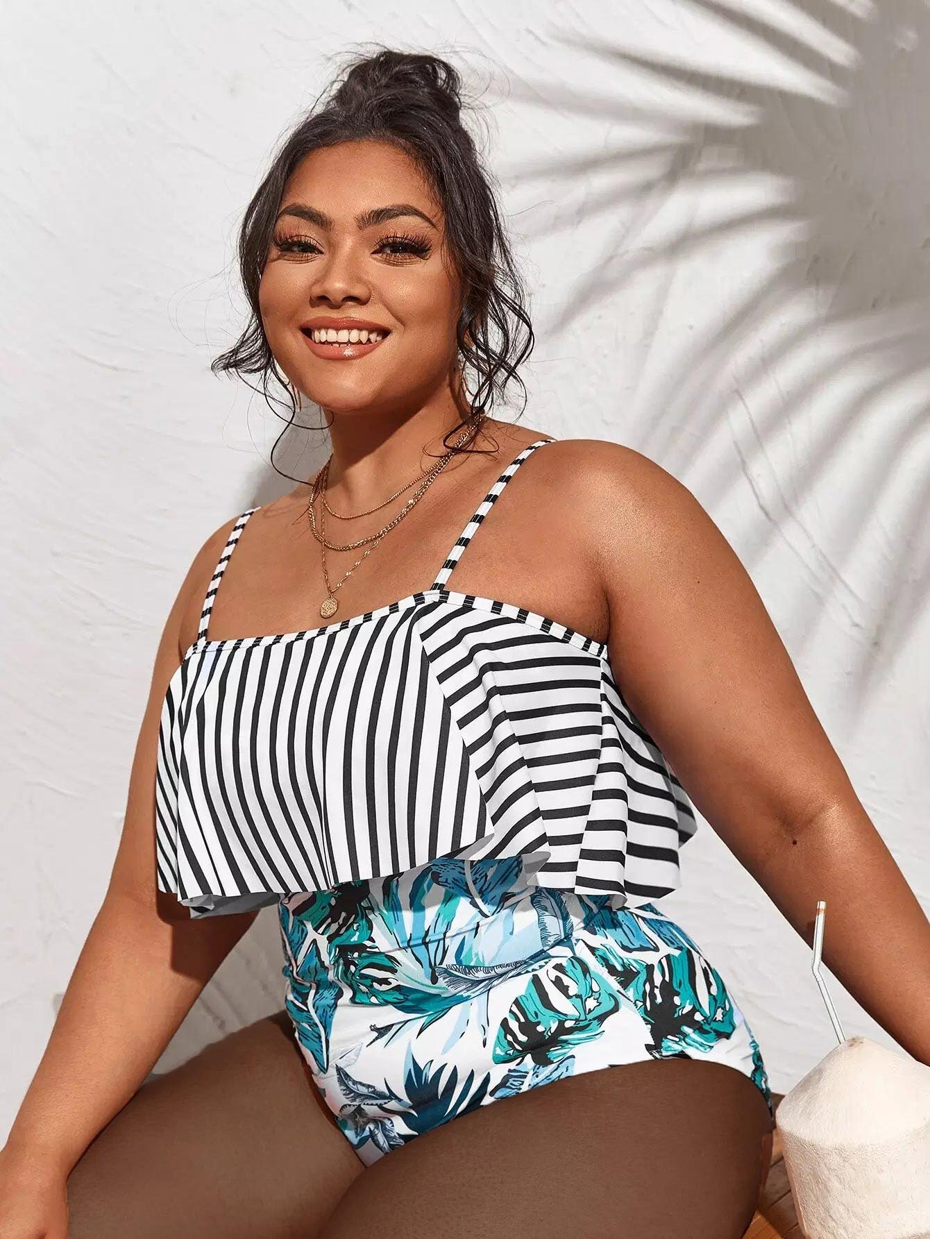 Plus Tropical & Striped Ruffle One Piece Swimsuit