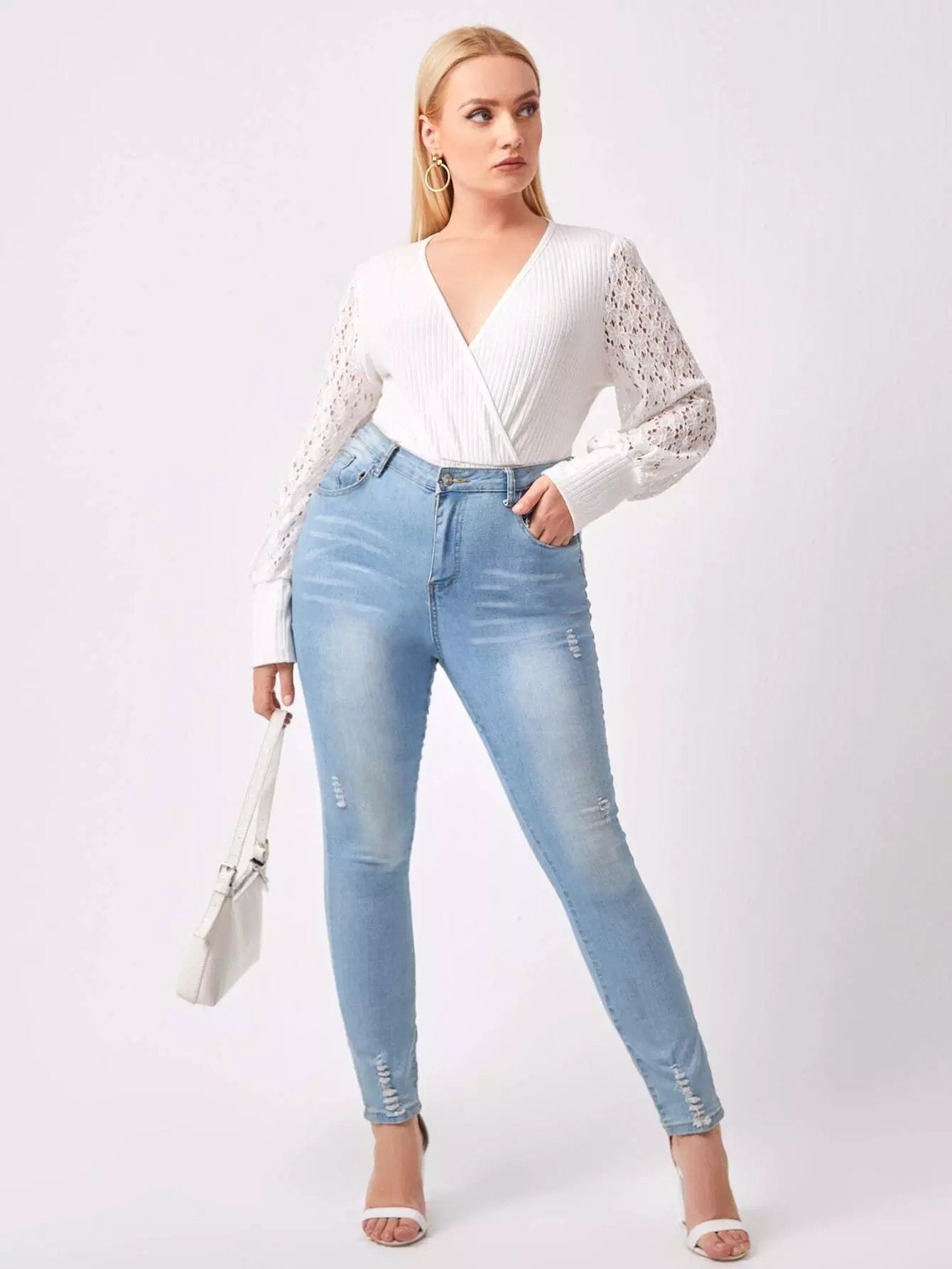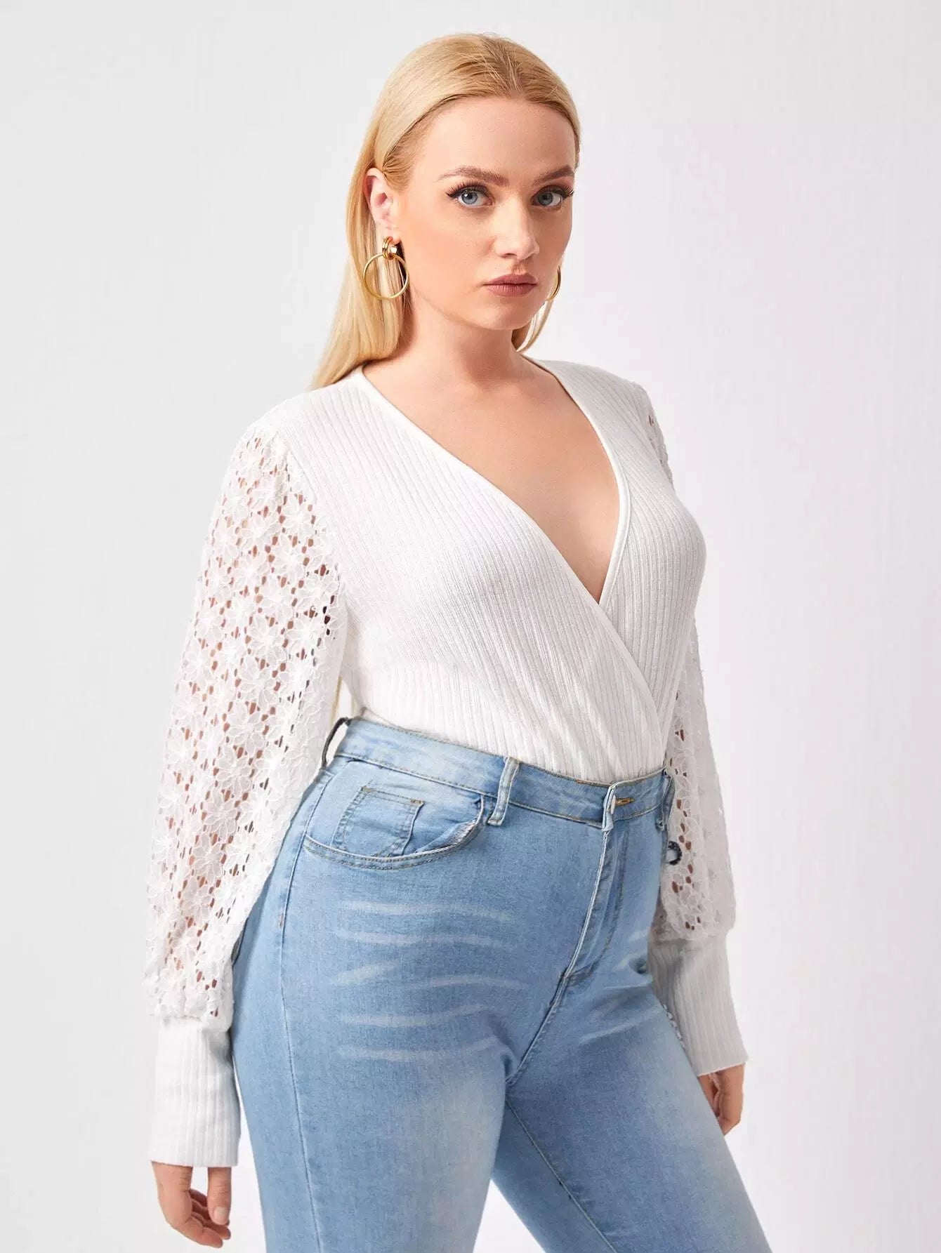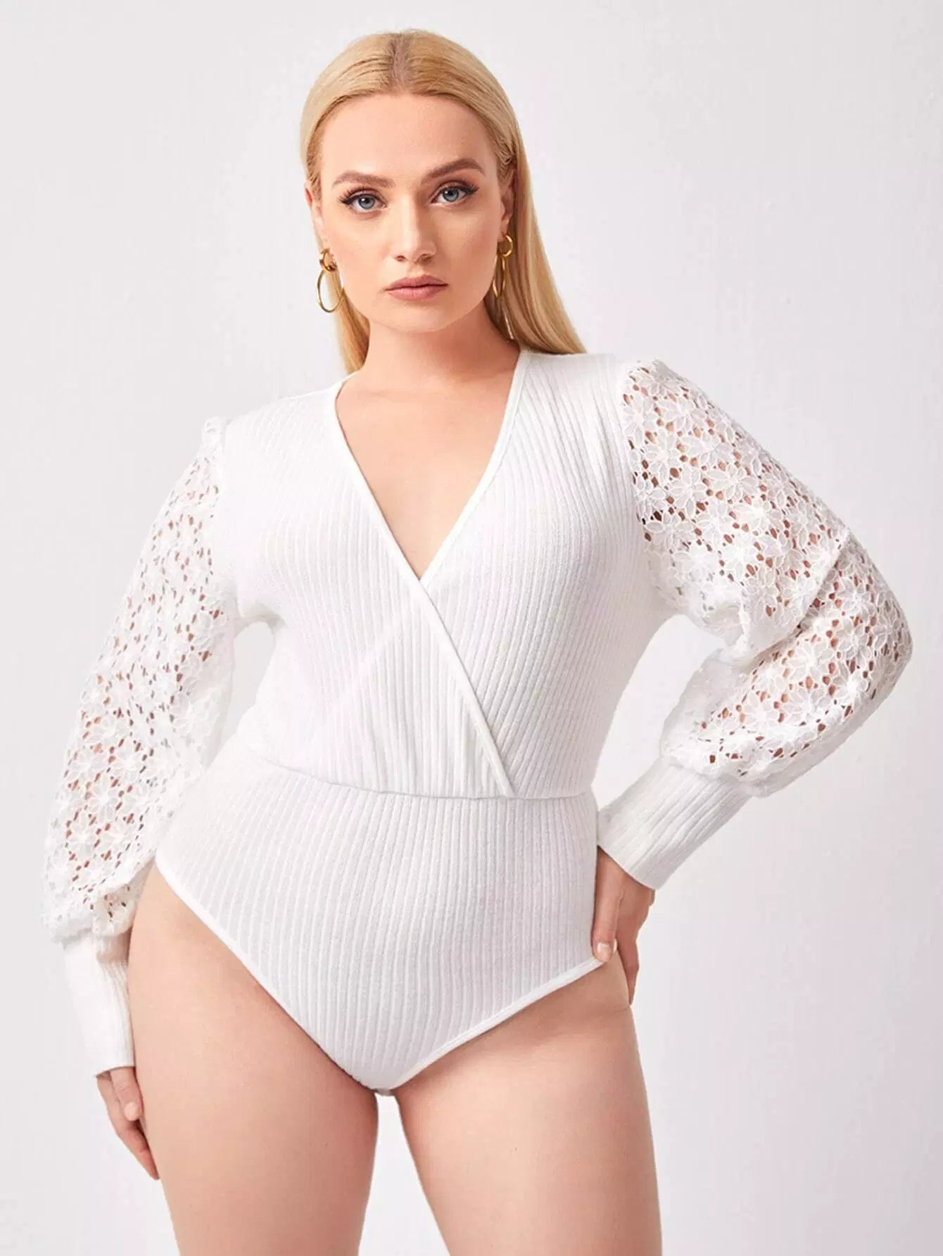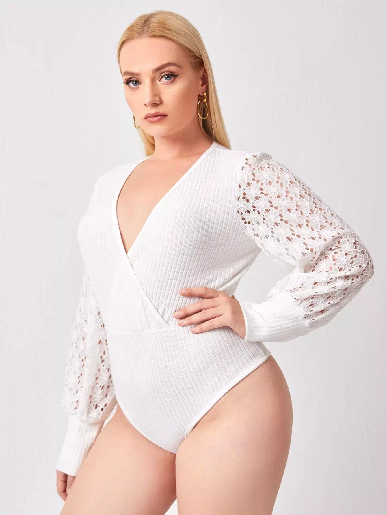 Plus Wrap Contrast Lace Sleeve Bodysuit