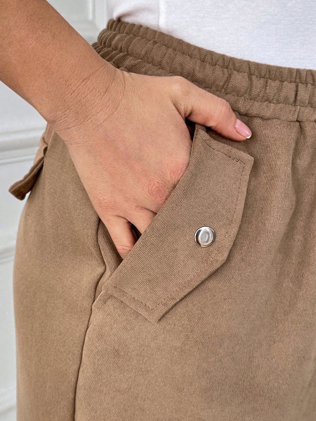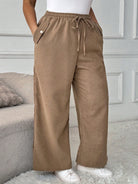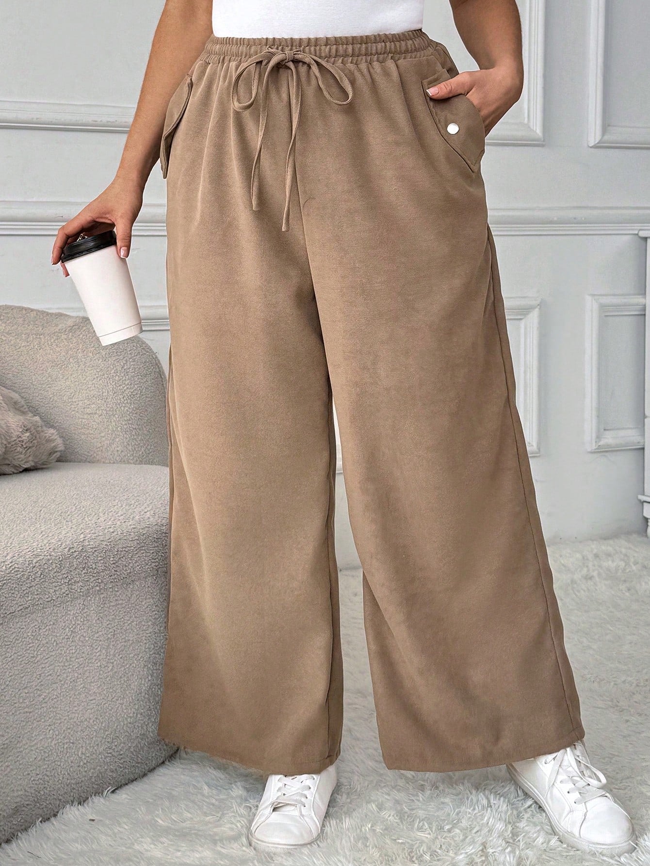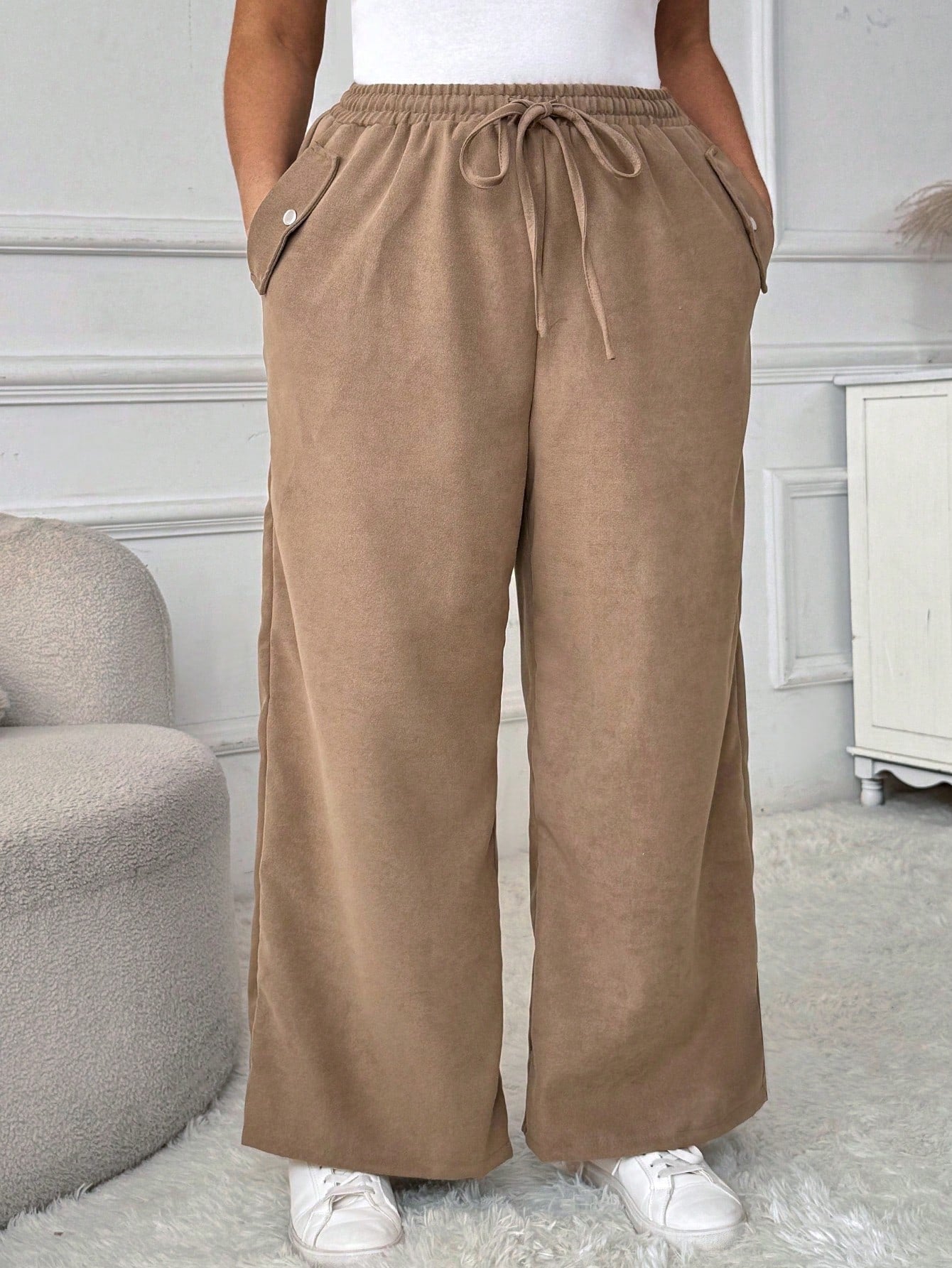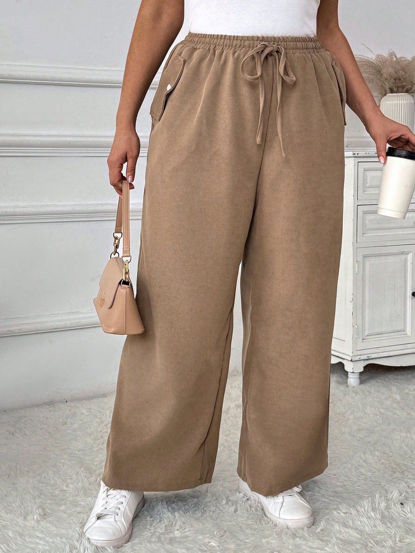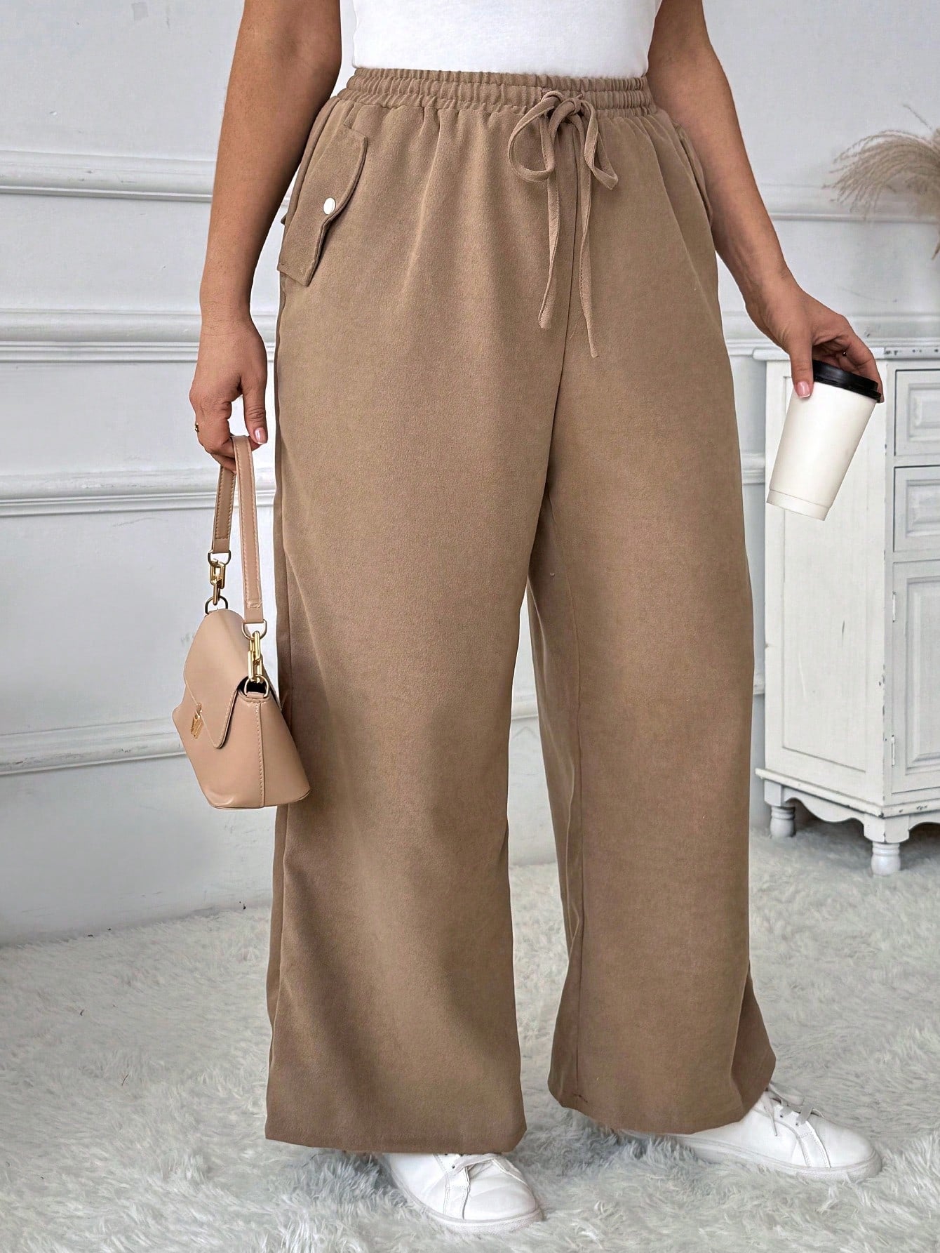 LUNE Women Plus Size Casual Woven Twill Side Pocket Drawstring Waist Loose Pants, Autumn Fall Cloth For