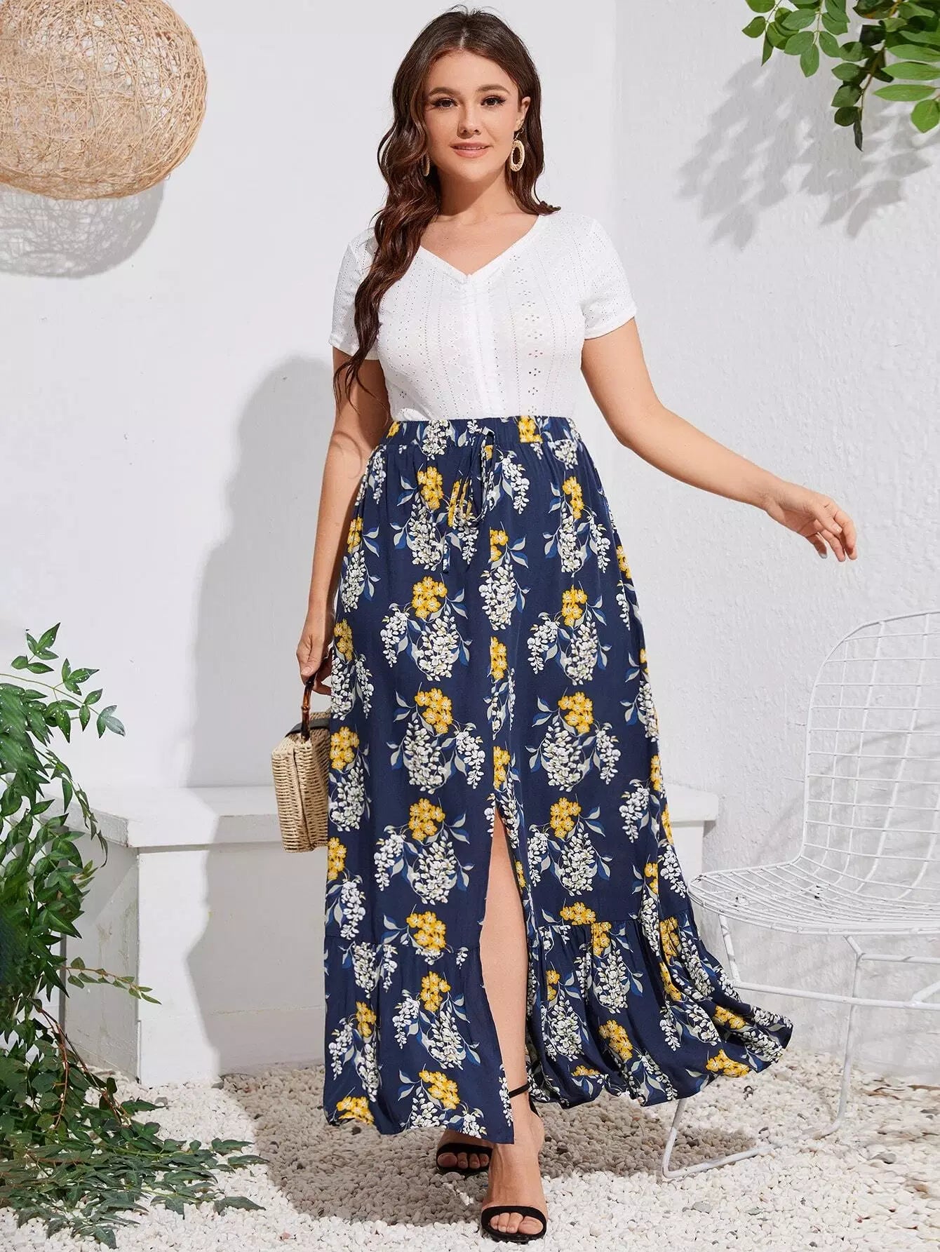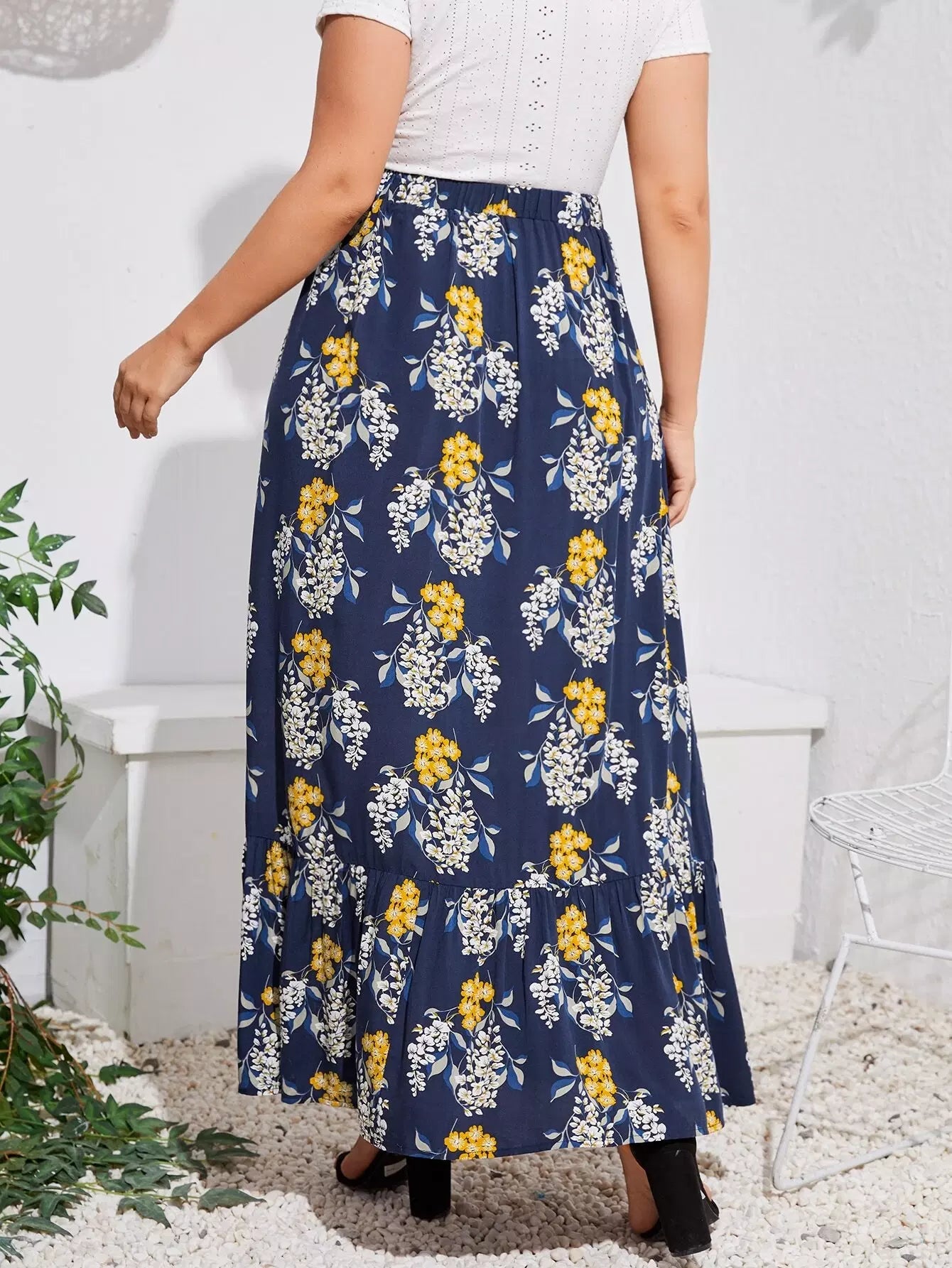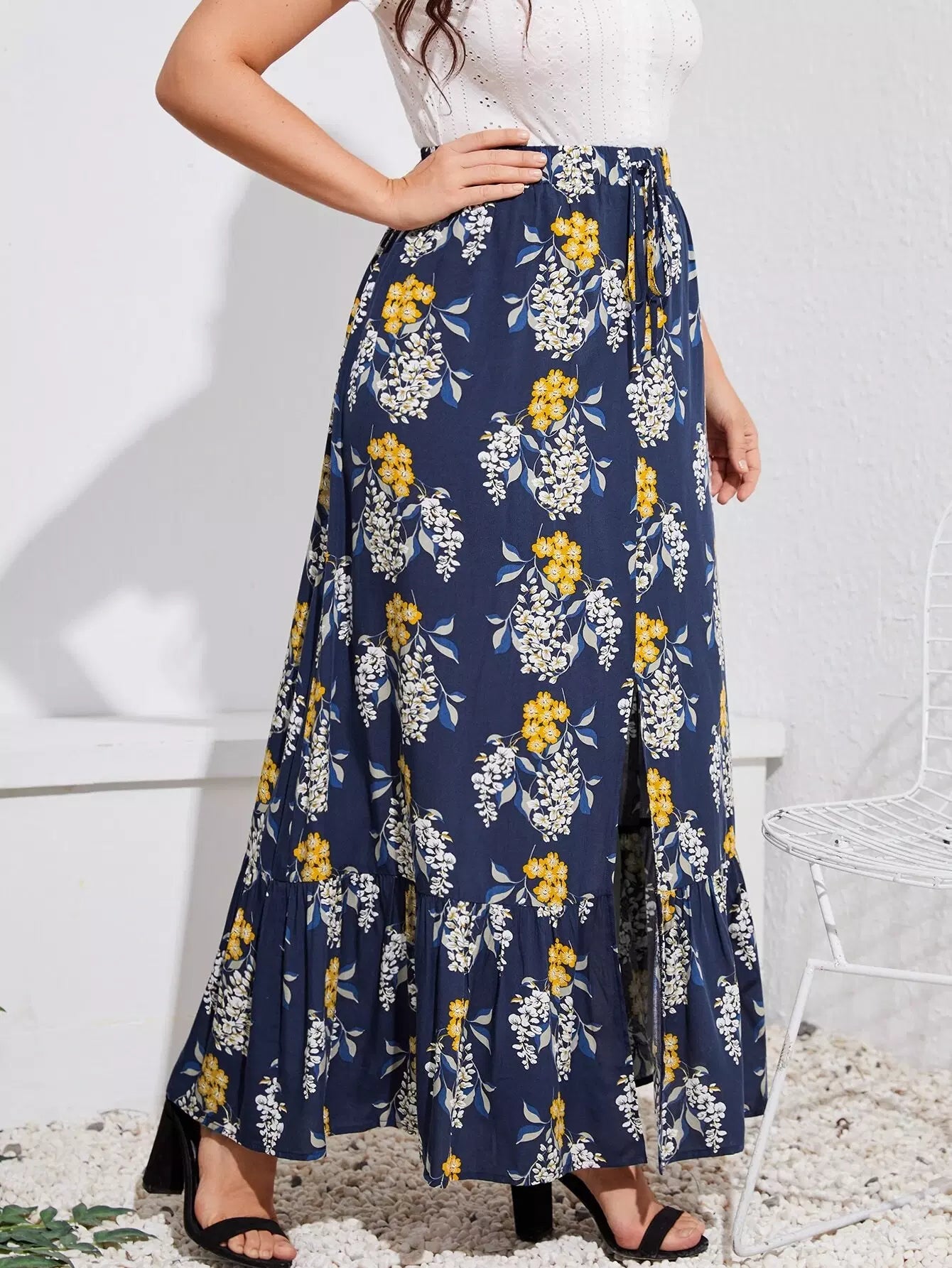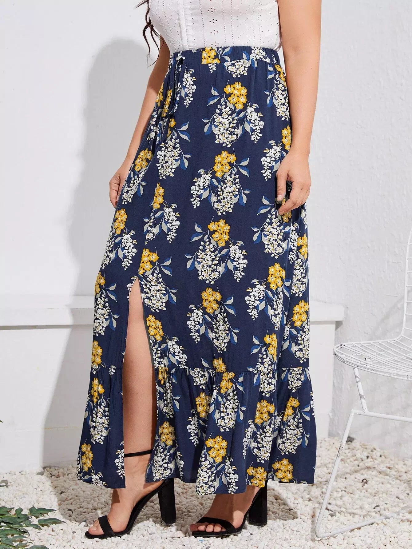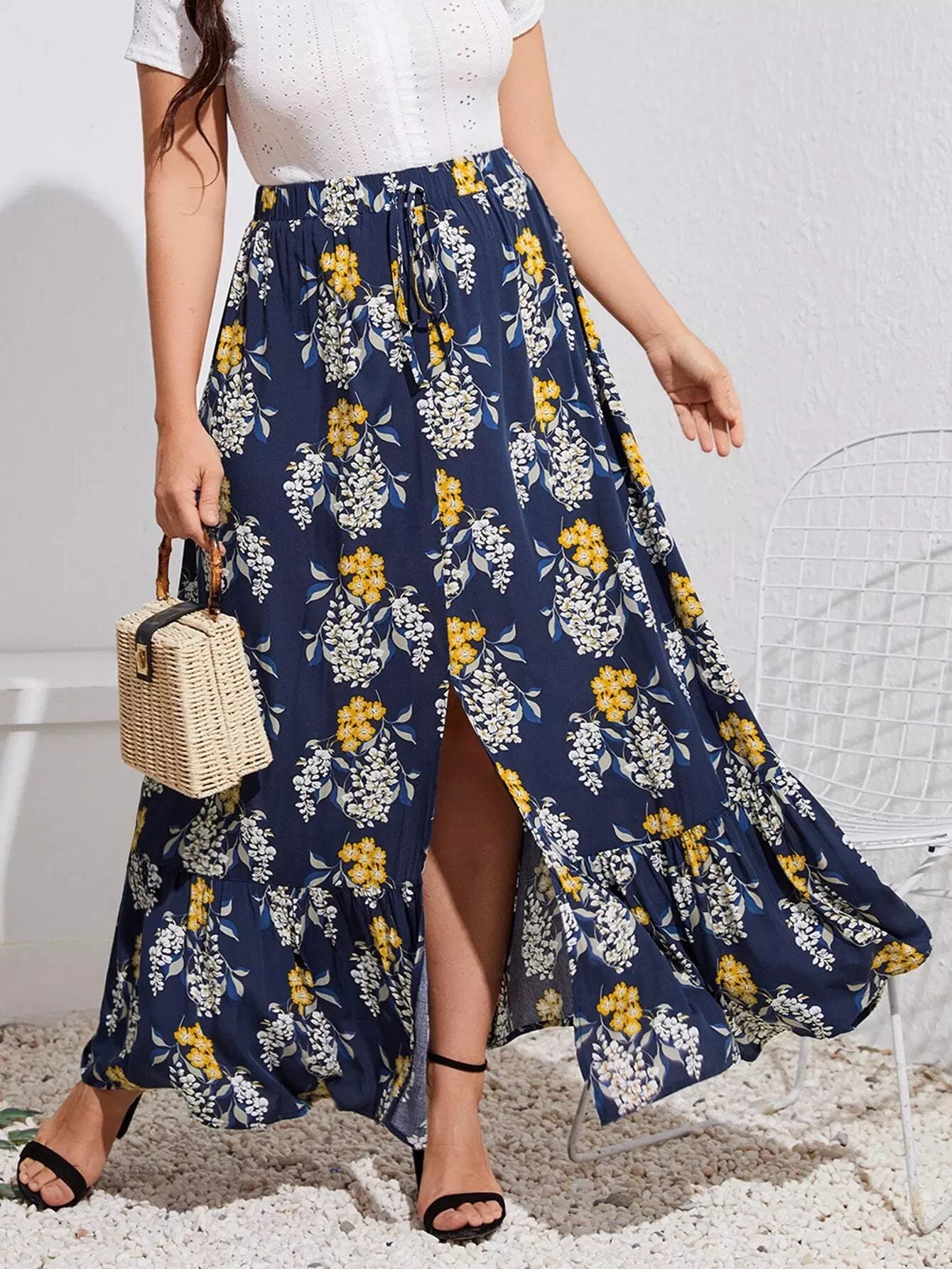 Plus Floral Print Split Ruffle Hem Skirt
