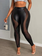 Slaydiva Plus Size Women's Club Sexy Black PU Asymmetrical Mesh Contrast Stretch Pants, For Summer