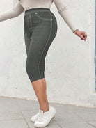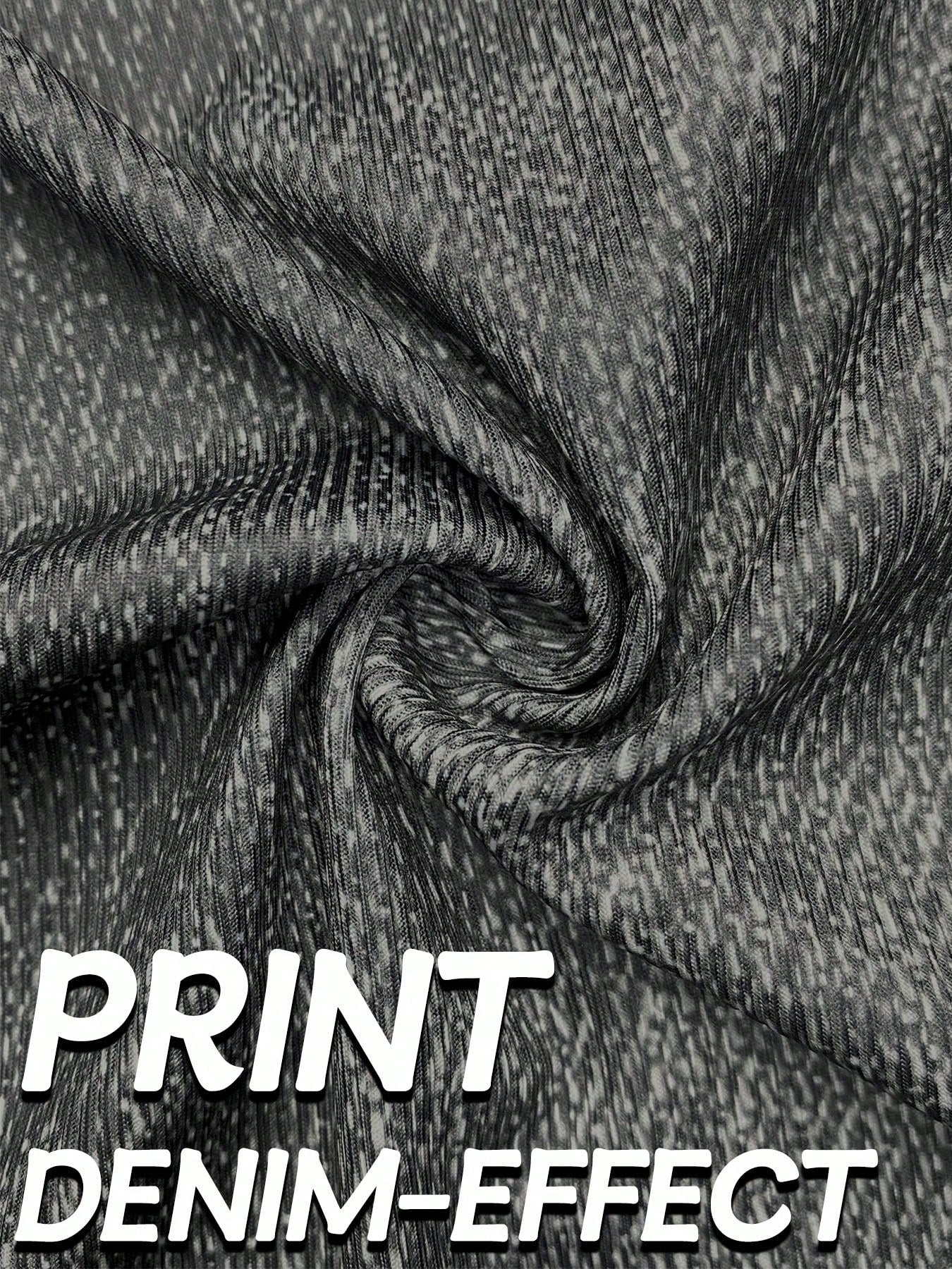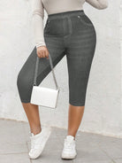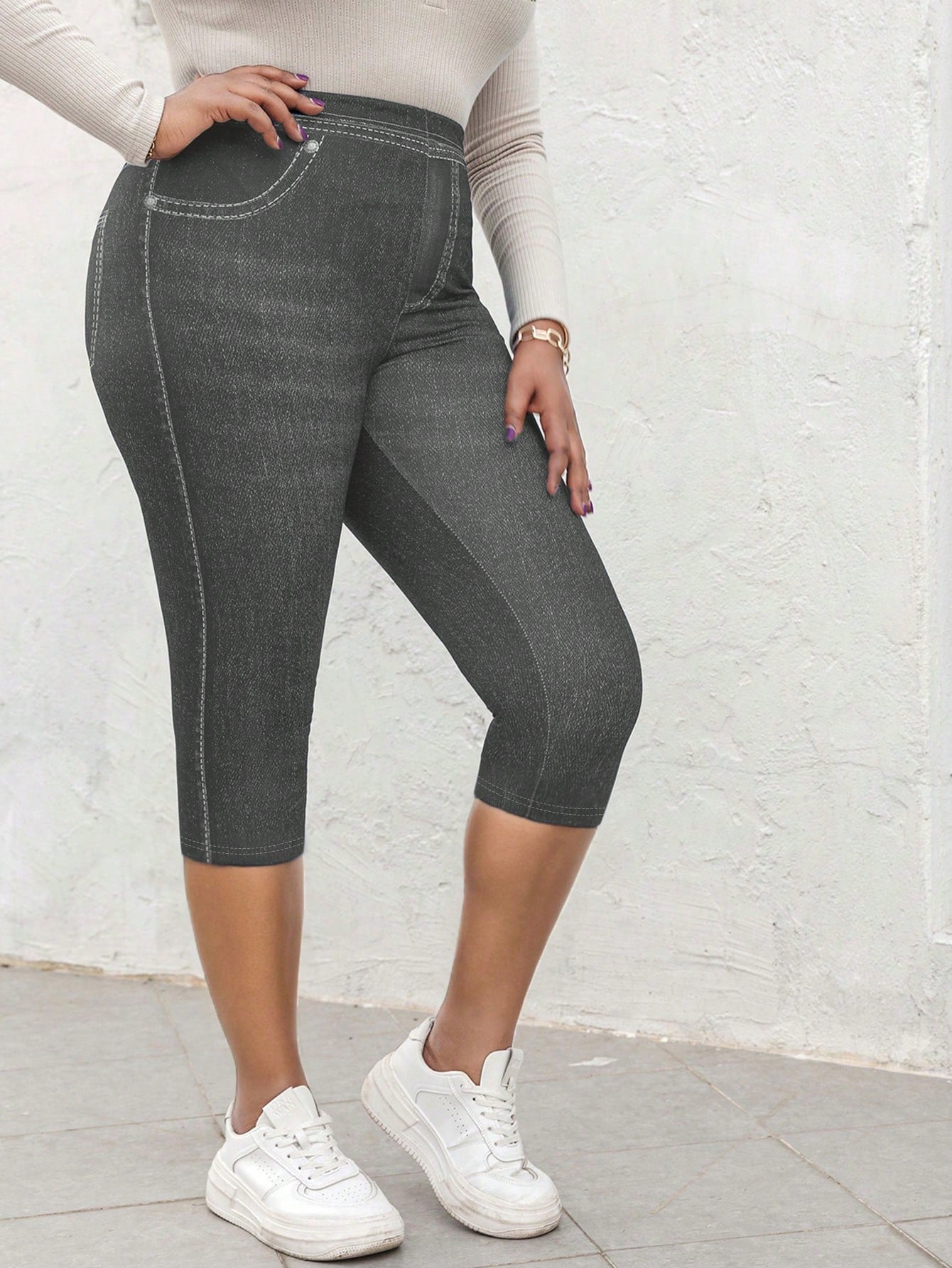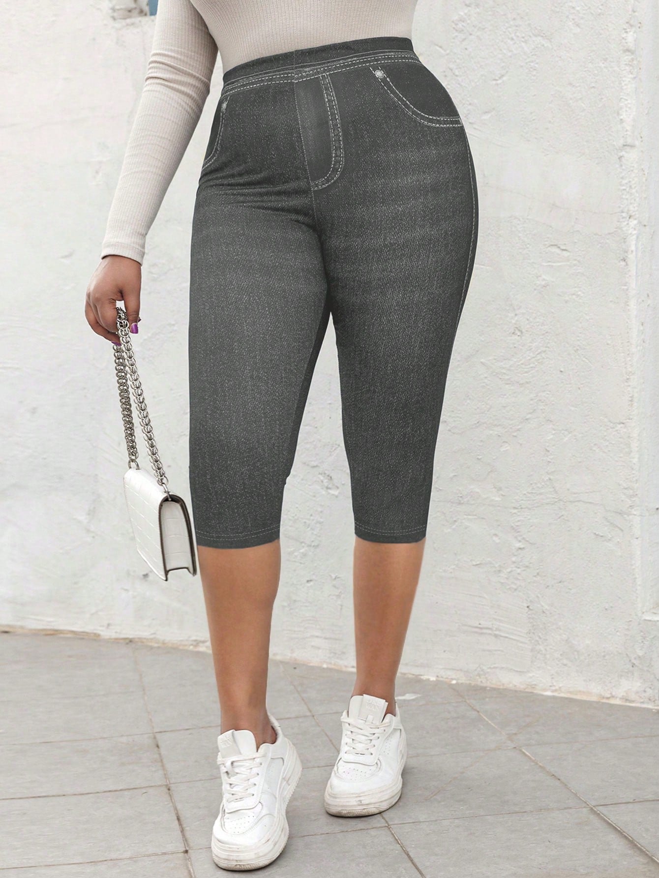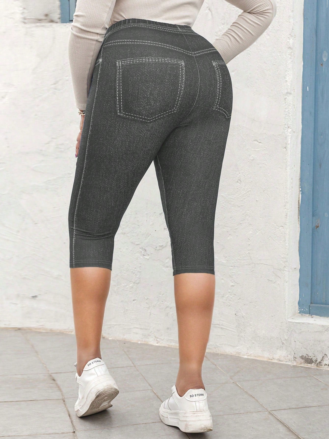 Plus Size Women's High Elastic Skinny Leggings With Denim Effect Print & Pockets Design, Comfortable