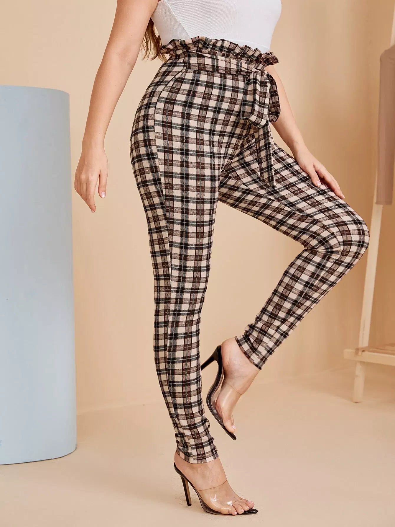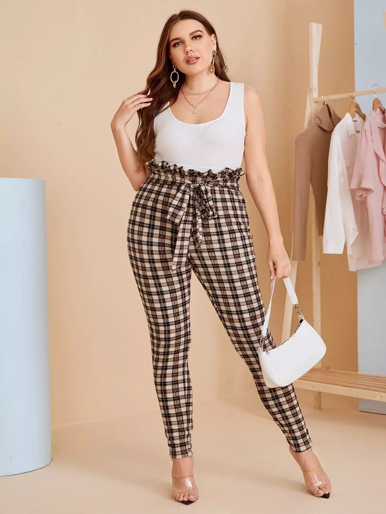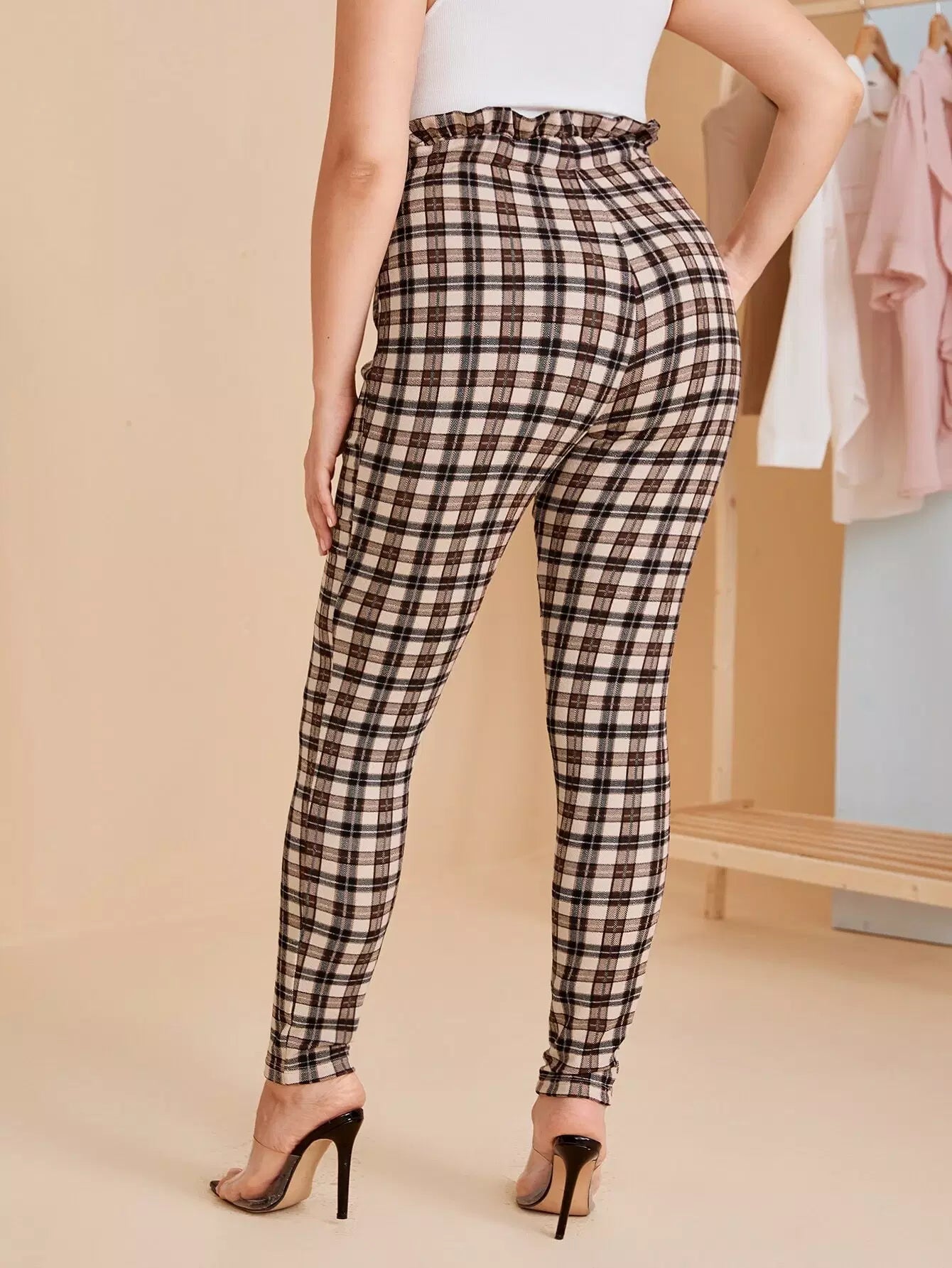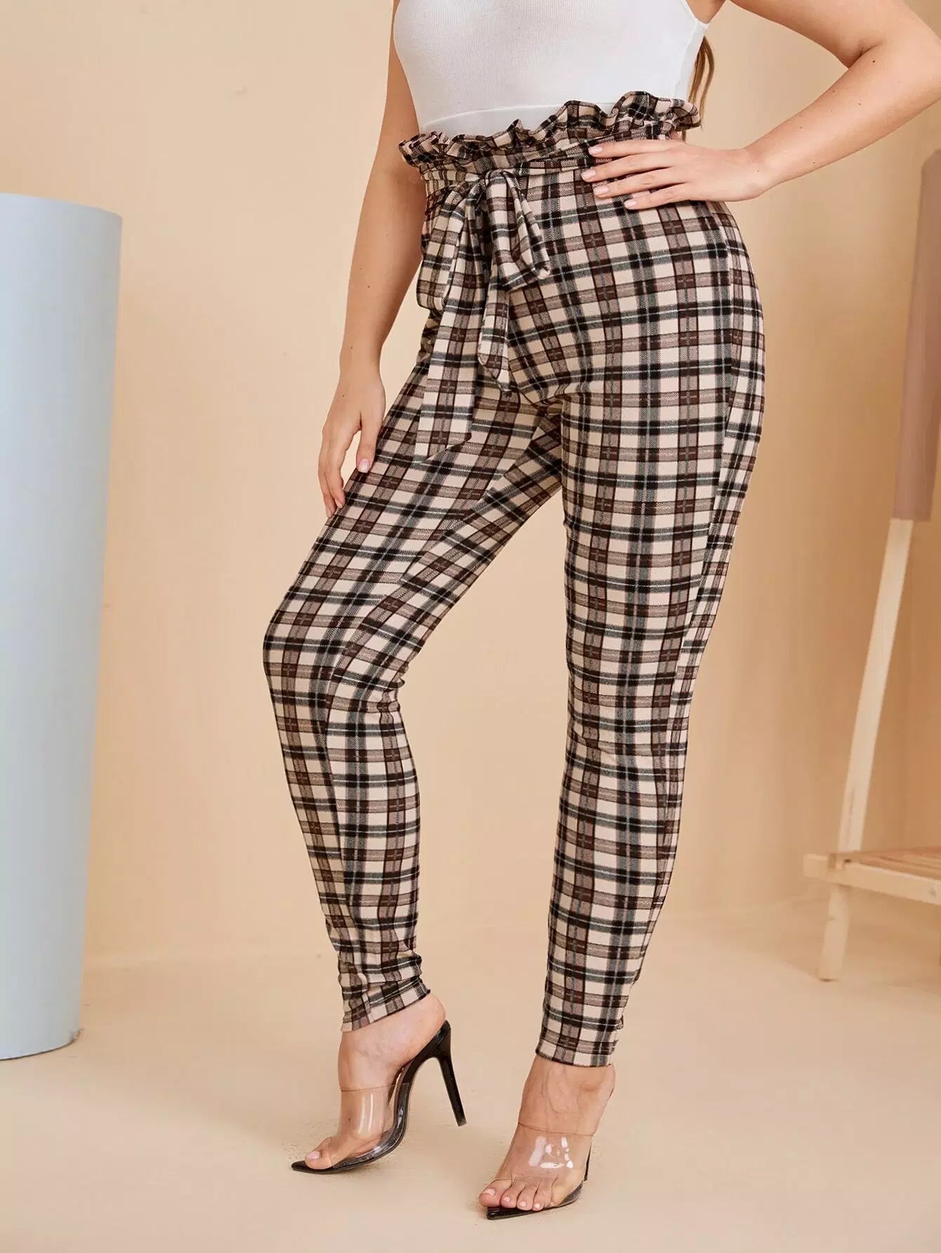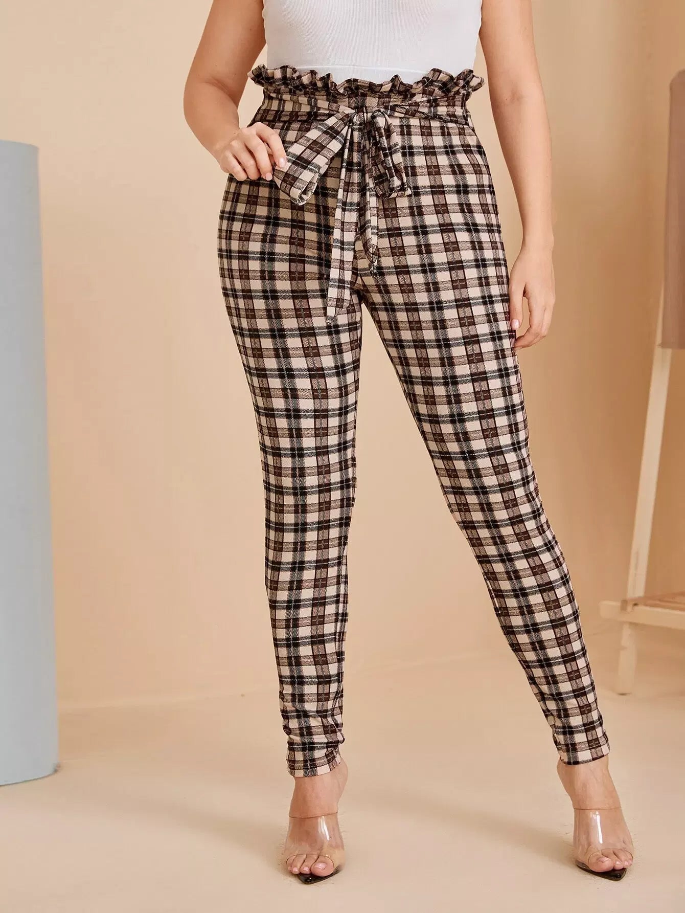 Plus Paperbag Waist Plaid Pants Without Belt