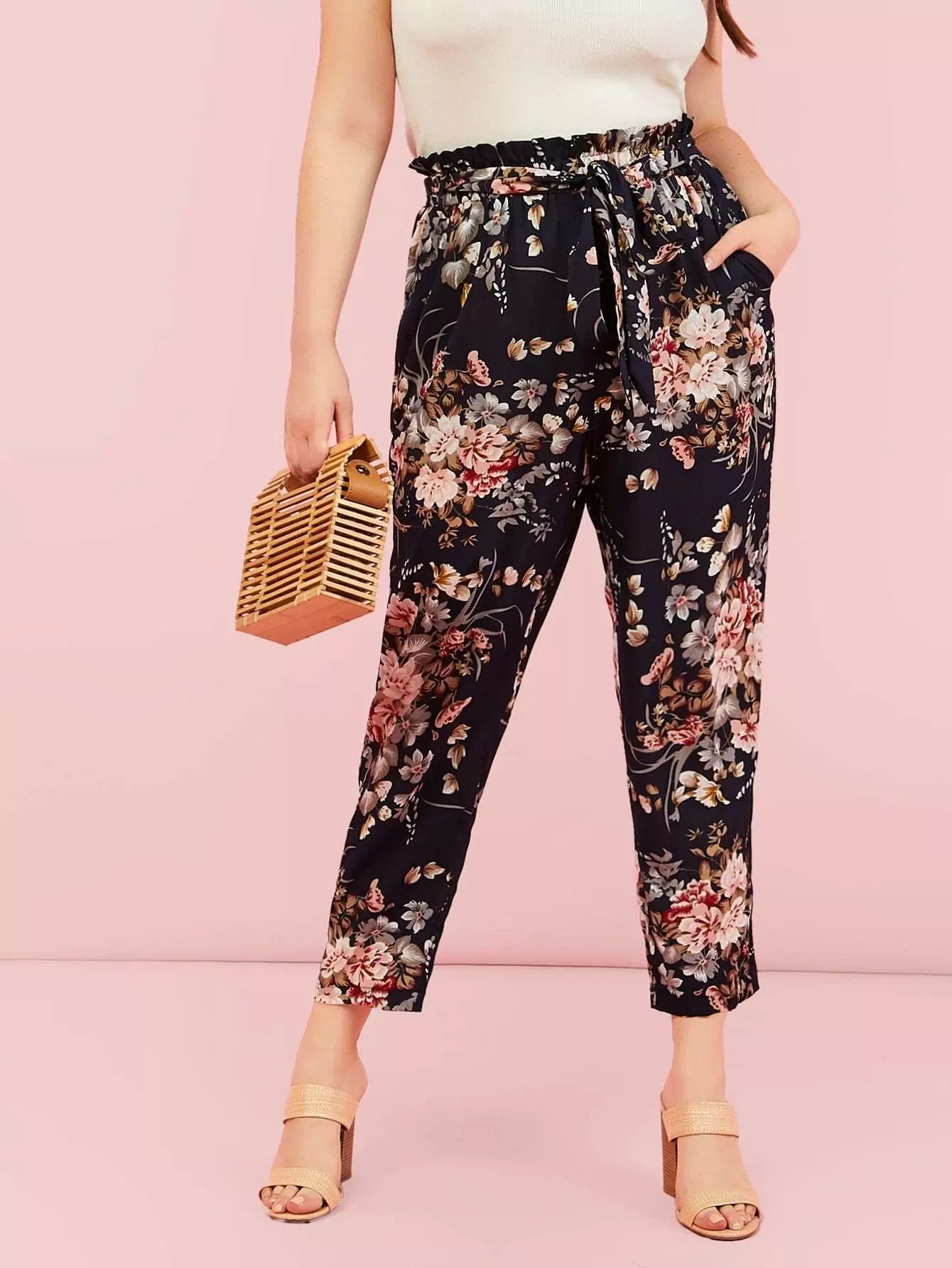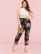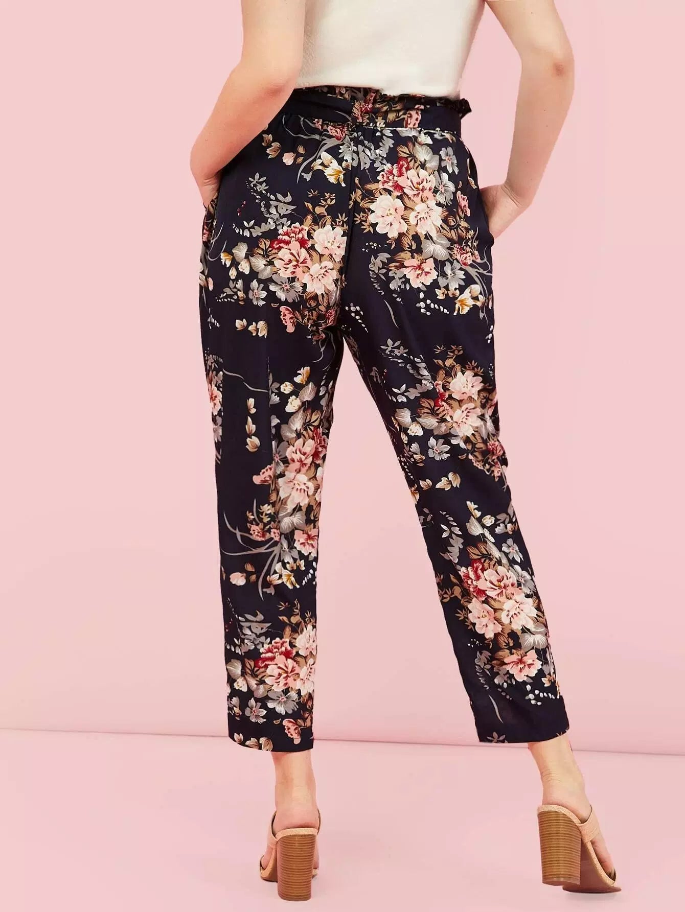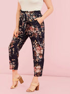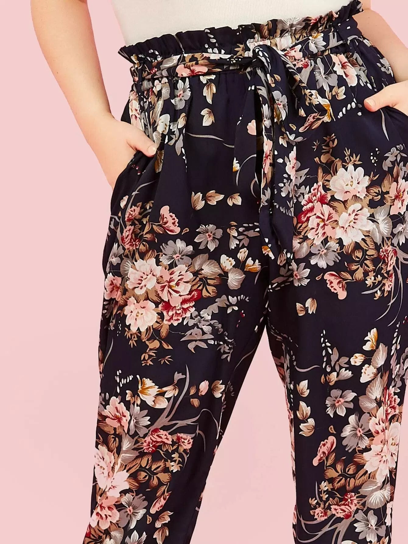 Plus Paperbag Waist Slant Pocket Floral Print Pants
