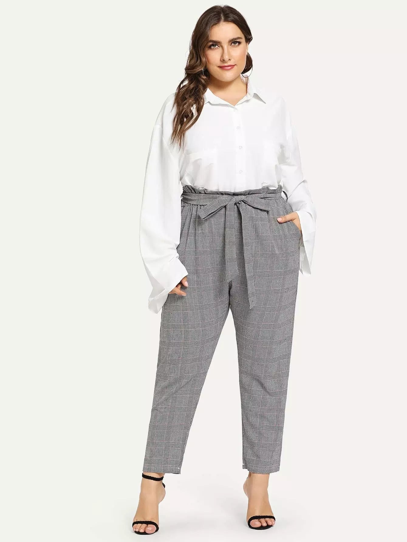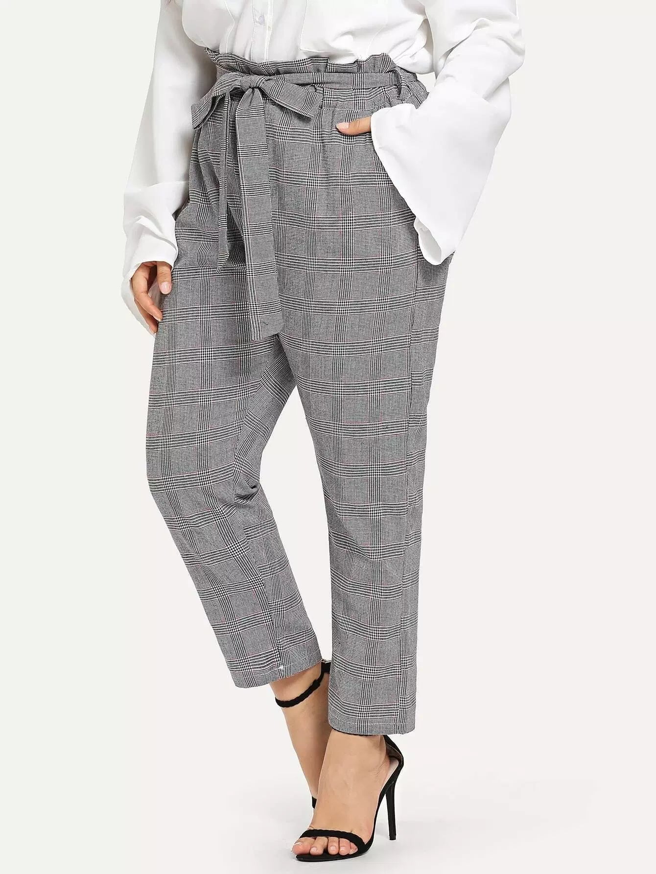 Plus Tie Waist Glen Plaid Paperbag Waist Pants