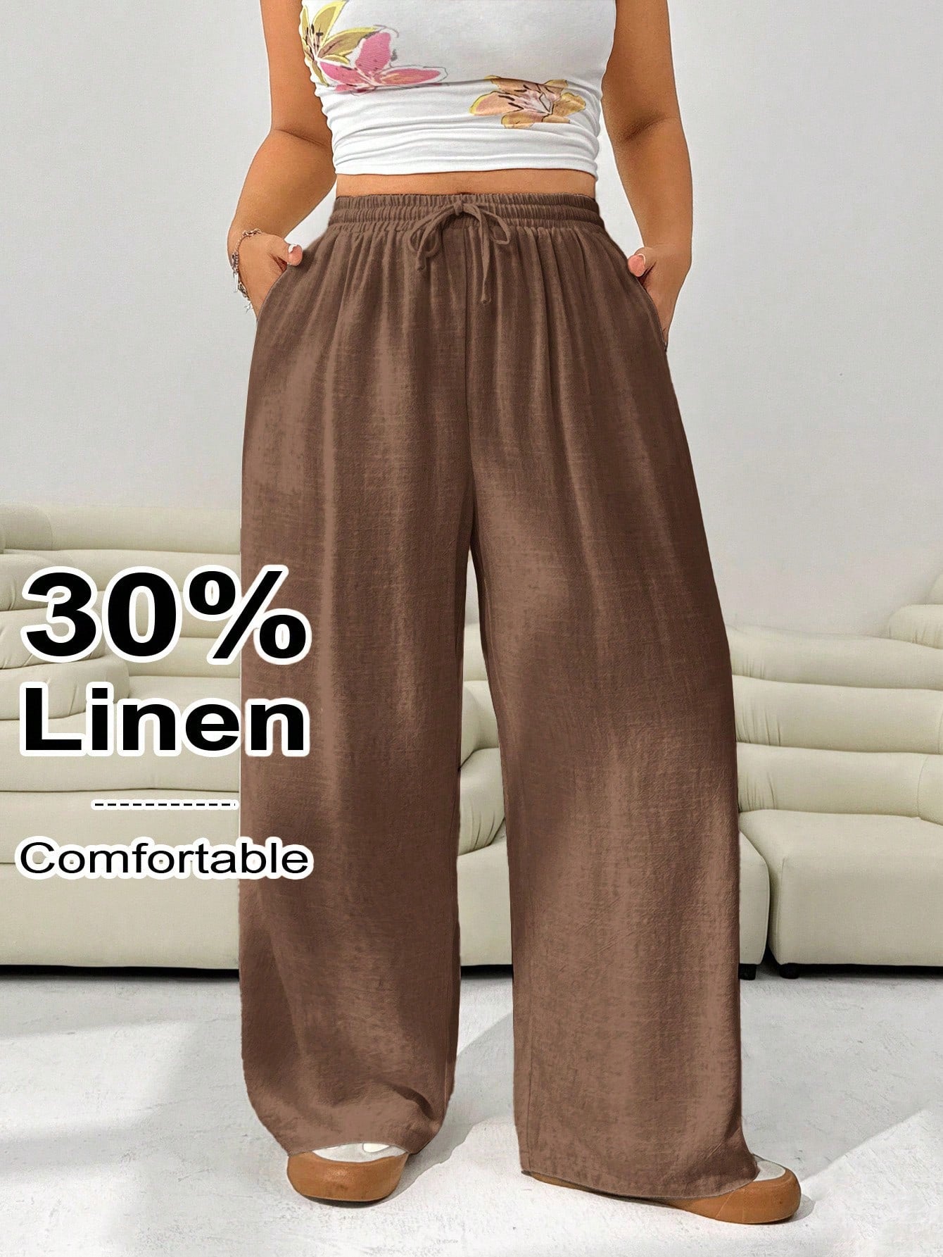 Solflare Women Plus Size Casual Loose Drawstring Waist Wide Leg Pants With Slant Pockets