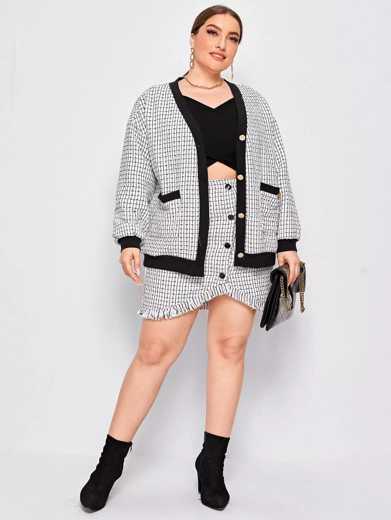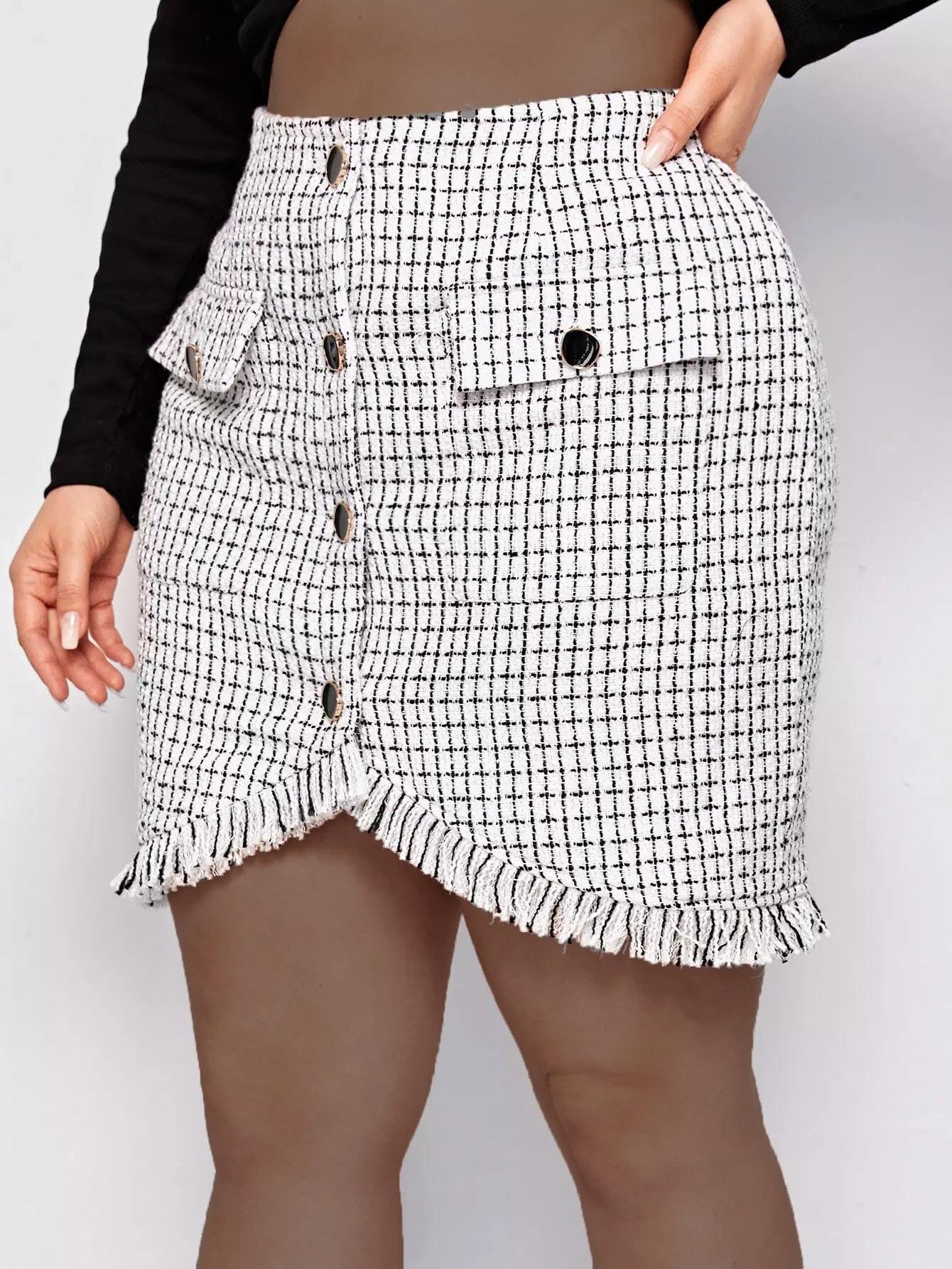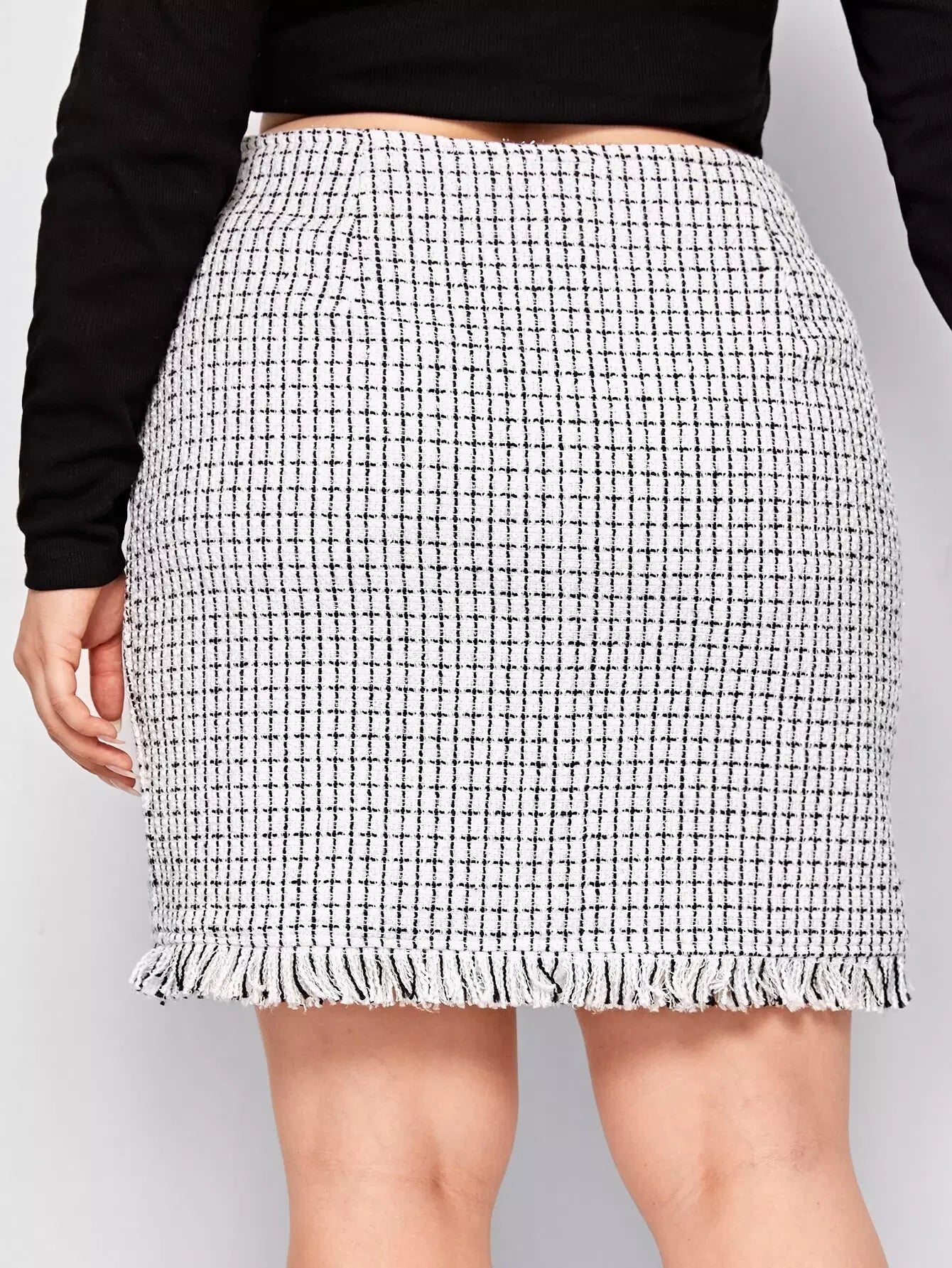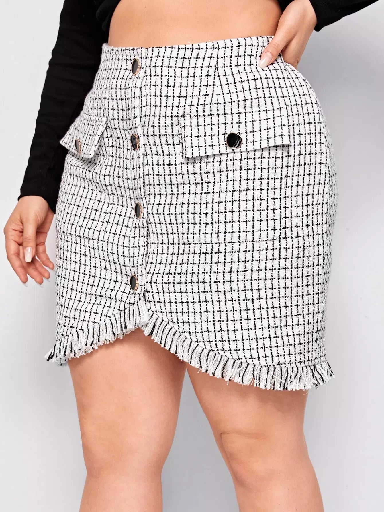 Plus Button Fly Flap Detail Raw Hem Grid Tweed Skirt