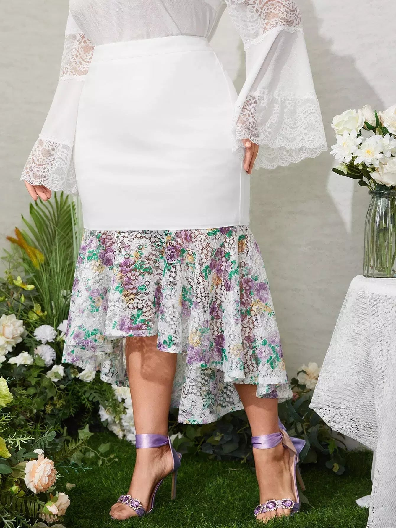 Plus Floral Pattern Contrast Lace High Low Hem Skirt